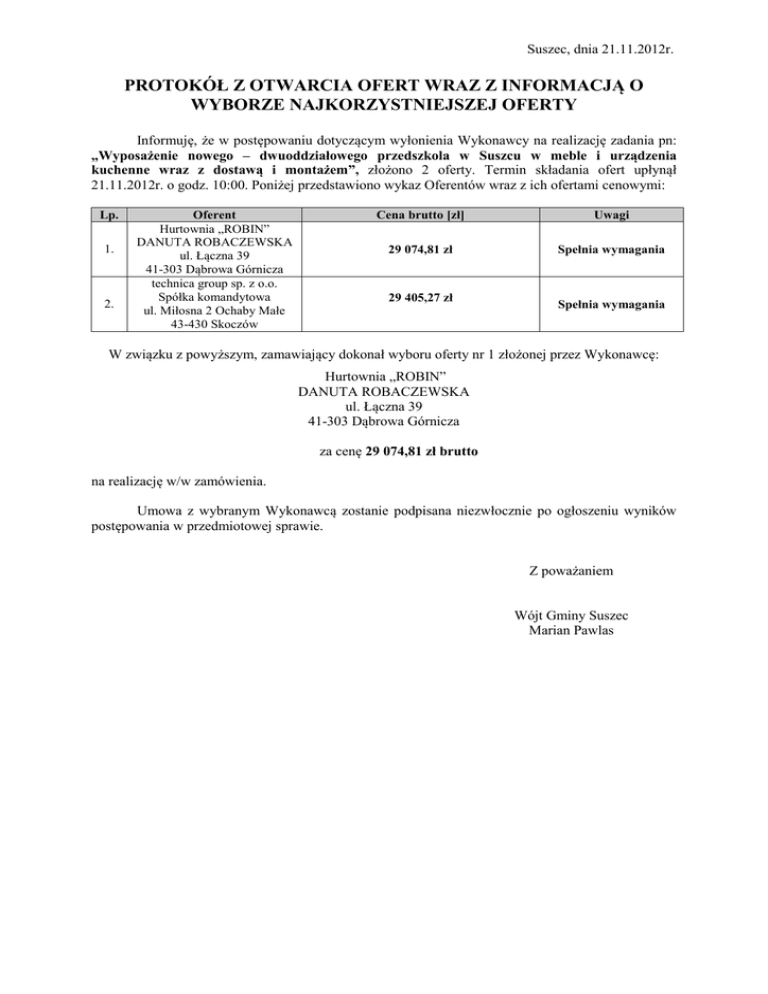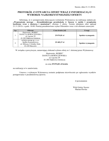 Suszec, dnia 21.11.2012r. PROTOKÓŁ Z OTWARCIA OFERT WRAZ Z INFORMACJĄ O WYBORZE NAJKORZYSTNIEJSZEJ OFERTY Informuję, że w postępowaniu dotyczącym wyłonienia Wykonawcy na realizację zadania pn: „Wyposażenie nowego – dwuoddziałowego przedszkola w Suszcu w meble i urządzenia kuchenne wraz z dostawą i montażem”, złożono 2 oferty. Termin składania ofert upłynął 21.11.2012r. o godz. 10:00. Poniżej przedstawiono wykaz Oferentów wraz z ich ofertami cenowymi: Lp. 1. 2. Oferent Hurtownia „ROBIN” DANUTA ROBACZEWSKA ul. Łączna 39 41-303 Dąbrowa Górnicza technica group sp. z o.o. Spółka komandytowa ul. Miłosna 2 Ochaby Małe 43-430 Skoczów Cena brutto [zł] Uwagi 29 074,81 zł Spełnia wymagania 29 405,27 zł Spełnia wymagania W związku z powyższym, zamawiający dokonał wyboru oferty nr 1 złożonej przez Wykonawcę: Hurtownia „ROBIN” DANUTA ROBACZEWSKA ul. Łączna 39 41-303 Dąbrowa Górnicza za cenę 29 074,81 zł brutto na realizację w/w zamówienia. Umowa z wybranym Wykonawcą zostanie podpisana niezwłocznie po ogłoszeniu wyników postępowania w przedmiotowej sprawie. Z poważaniem Wójt Gminy Suszec Marian Pawlas