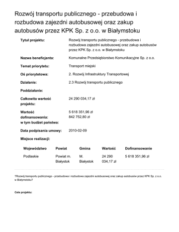 Rozwój transportu publicznego - przebudowa i rozbudowa zajezdni autobusowej oraz zakup autobusów przez KPK Sp. z o.o. w Białymstoku Tytuł projektu: Rozwój transportu publicznego - przebudowa i rozbudowa zajezdni autobusowej oraz zakup autobusów przez KPK Sp. z o.o. w Białymstoku Nazwa beneficjenta: Komunalne Przedsiębiorstwo Komunikacyjne Sp. z o.o. Temat priorytetu: Transport miejski Oś priorytetowa: 2. Rozwój Infrastruktury Transportowej Działanie: 2.3 Rozwój transportu publicznego Poddziałanie: Całkowita wartość projektu: 24 290 034,17 zł Wartość dofinansowania: w tym budżet państwa: 5 618 351,96 zł 842 752,80 zł Data podpisania umowy: 2010-02-09 Miejsce realizacji: Województwo Powiat Gmina Wartość Dofinansowanie Podlaskie Powiat m. Białystok M. Białystok 24 290 034,17 zł 5 618 351,96 zł ?Rozwój transportu publicznego - przebudowa i rozbudowa zajezdni autobusowej oraz zakup autobusów przez KPK Sp. z o.o. w Białymstoku? Cele projektu: ? Modernizacja zaplecza technicznego komunikacji miejskiej (zajezdnia i warsztaty naprawcze) ? Zwiększenie liczby pasażerów korzystających z transportu miejskiego, ? Redukcja emisji zanieczyszczeń ? Zwiększenie dostępu do usług komunikacji miejskiej dla osób niepełnosprawnych ? Zwiększenie zasięgu komunikacji miejskiej o nowe obszary miejskie i podmiejskie ? Wprowadzenie nowoczesnych rozwiązań informatycznych i łączności w celu zwiększenia komfortu obsługi pasażerów i bezpieczeństwa ruchu drogowego ? Poprawa warunków pracy osób zatrudnionych w KPK Sp. z o.o. W ramach inicjatywy powstanie/zostanie zrealizowane: ? Zakup 8 nowoczesnych autobusów przegubowych wyposażonych w elektroniczne tablice informacyjne z planem tras komunikacji miejskiej; ? Remont nawierzchni placu postojowego przy ul. Składowej 11 o pow. 11.813 m2 - wykonanie podbudowy oraz ułożenie warstwy bitumicznej na całej nawierzchni placu wraz z infrastrukturą : instalacja wodna, kanalizacja sanitarna i deszczowa pod powierzchnią placu, budowa osadników i separatorów substancji ropopochodnych przy wylocie do miejskiej kanalizacji deszczowej; ? Budowa nowego budynku obsługi zajezdni przy ul. Składowej 7, w którym mieścić się będzie nowoczesny warsztat naprawczy autobusów i magazyn części zamiennych; dodatkowo stanowisko napraw lakierniczych oraz stanowisko przygotowawcze do napraw lakierniczych, wyposażone w nowoczesne, bezpieczne wyciągi szkodliwych substancji; w budynku obsługi zajezdni - nowoczesne zaplecze socjalne dla pracowników warsztatu: szatnie, łazienki, aneks kuchenny z jadalnią; ? zakup wyposażenia warsztatu znajdującego siew budynku obsługi zajezdni ? remont nawierzchni placu postojowego przy ul. Składowej 7 o pow. ok. 13.078 m2 wraz z infrastrukturą: nowa instalacja wodna, kanalizacja sanitarna i deszczowa, budowa osadników, separatorów; ? budowa 30 stanowisk postojowych autobusów przy ul. Składowej 7 ? remont istniejącego budynku obsługi zajezdni w zakresie: - docieplenia całego budynku, wymiana obróbek blacharskich, remont i przebudowa wejścia , ? unowocześnienie strony internetowej m.in. na potrzeby osób niepełnosprawnych, niewidomych i niedowidzących ? zakup urządzeń mających na celu poprawę łączności radiowej w celu zwiększenia bezpieczeństwa ruchu drogowego Po realizacji
