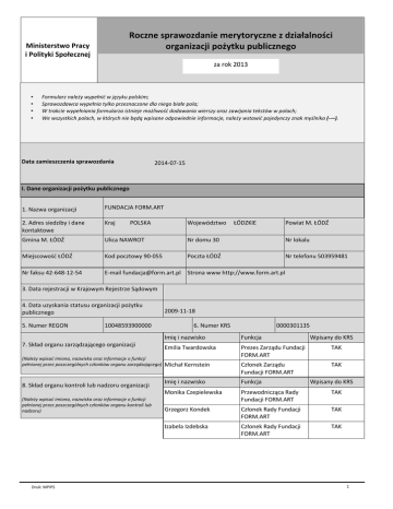 ZŽĐnjŶĞƐƉƌĂǁŽnjĚĂŶŝĞŵĞƌLJƚŽƌLJĐnjŶĞnjĚnjŝĂųĂůŶŽƑĐŝ ŽƌŐĂŶŝnjĂĐũŝƉŽǏLJƚŬƵƉƵďůŝĐnjŶĞŐŽ Ministerstwo Pracy ŝWŽůŝƚLJŬŝ^ƉŽųĞĐnjŶĞũ za rok 2013 • • • • &ŽƌŵƵůĂƌnjŶĂůĞǏLJǁLJƉĞųŶŝđǁũħnjLJŬƵƉŽůƐŬŝŵ͖ ^ƉƌĂǁŽnjĚĂǁĐĂǁLJƉĞųŶŝĂƚLJůŬŽƉƌnjĞnjŶĂĐnjŽŶĞĚůĂŶŝĞŐŽďŝĂųĞƉŽůĂ͖ tƚƌĂŬĐŝĞǁLJƉĞųŶŝĂŶŝĂĨŽƌŵƵůĂƌnjĂŝƐƚŶŝĞũĞŵŽǏůŝǁŽƑđĚŽĚĂǁĂŶŝĂǁŝĞƌƐnjLJŽƌĂnjnjĂǁŝũĂŶŝĂƚĞŬƐƚſǁǁƉŽůĂĐŚ͖ tĞǁƐnjLJƐƚŬŝĐŚƉŽůĂĐŚ͕ǁŬƚſƌLJĐŚŶŝĞďħĚČǁƉŝƐĂŶĞŽĚƉŽǁŝĞĚŶŝĞŝŶĨŽƌŵĂĐũĞ͕ŶĂůĞǏLJǁƐƚĂǁŝđƉŽũĞĚLJŶĐnjLJnjŶĂŬŵLJƑůŶŝŬĂ (--–). Data zamieszczenia sprawozdania 2014-07-15 /͘ĂŶĞŽƌŐĂŶŝnjĂĐũŝƉŽǏLJƚŬƵƉƵďůŝĐnjŶĞŐŽ 1. Nazwa organizacji FUNDACJA FORM.ART 2. Adres siedziby i dane kontaktowe Kraj 'ŵŝŶĂD͘BM POLSKA tŽũĞǁſĚnjƚǁŽBM</ WŽǁŝĂƚD͘BM Ulica NAWROT Nr domu 30 Nr lokalu DŝĞũƐĐŽǁŽƑđBM Kod pocztowy 90-055 WŽĐnjƚĂBM Nr telefonu 503959481 Nr faksu 42-648-12-54 E-mail [email protected] Strona www http://www.form.art.pl ϯ͘ĂƚĂƌĞũĞƐƚƌĂĐũŝǁ<ƌĂũŽǁLJŵZĞũĞƐƚƌnjĞ^ČĚŽǁLJŵ ϰ͘ĂƚĂƵnjLJƐŬĂŶŝĂƐƚĂƚƵƐƵŽƌŐĂŶŝnjĂĐũŝƉŽǏLJƚŬƵ publicznego 5. Numer REGON 10048593900000 ϳ͘^ŬųĂĚŽƌŐĂŶƵnjĂƌnjČĚnjĂũČĐĞŐŽŽƌŐĂŶŝnjĂĐũŝ ;EĂůĞǏLJǁƉŝƐĂđŝŵŝŽŶĂ͕ŶĂnjǁŝƐŬĂŽƌĂnjŝŶĨŽƌŵĂĐũĞŽĨƵŶŬĐũŝ ƉĞųŶŝŽŶĞũƉƌnjĞnjƉŽƐnjĐnjĞŐſůŶLJĐŚĐnjųŽŶŬſǁŽƌŐĂŶƵnjĂƌnjČĚnjĂũČĐĞŐŽͿ ϴ͘^ŬųĂĚŽƌŐĂŶƵŬŽŶƚƌŽůŝůƵďŶĂĚnjŽƌƵŽƌŐĂŶŝnjĂĐũŝ ;EĂůĞǏLJǁƉŝƐĂđŝŵŝŽŶĂ͕ŶĂnjǁŝƐŬĂŽƌĂnjŝŶĨŽƌŵĂĐũĞŽĨƵŶŬĐũŝ ƉĞųŶŝŽŶĞũƉƌnjĞnjƉŽƐnjĐnjĞŐſůŶLJĐŚĐnjųŽŶŬſǁŽƌŐĂŶƵŬŽŶƚƌŽůŝůƵď nadzoru) Druk: MPiPS 2009-11-18 6. Numer KRS 0000301135 /ŵŝħŝŶĂnjǁŝƐŬŽ Funkcja Wpisany do KRS Emilia Twardowska WƌĞnjĞƐĂƌnjČĚƵ&ƵŶĚĂĐũŝ FORM.ART TAK DŝĐŚĂų<ĞƌŶƐƚĞŝŶ njųŽŶĞŬĂƌnjČĚƵ Fundacji FORM.ART TAK /ŵŝħŝŶĂnjǁŝƐŬŽ Funkcja Monika Czepielewska WƌnjĞǁŽĚŶŝĐnjČĐĂZĂĚLJ Fundacji FORM.ART TAK Grzegorz Kondek njųŽŶĞŬZĂĚLJ&ƵŶĚĂĐũŝ FORM.ART TAK Izabela Izdebska njųŽŶĞŬZĂĚLJ&ƵŶĚĂĐũŝ FORM.ART TAK Wpisany do KRS 1 9. Cele statutowe organizacji ;EĂůĞǏLJŽƉŝƐĂđĐĞůĞŶĂƉŽĚƐƚĂǁŝĞƐƚĂƚƵƚƵŽƌŐĂŶŝnjĂĐũŝͿ Celem Fundacji jest propagowanie, wspieranie, promowanie wszelkiej ĚnjŝĂųĂůŶŽƑĐŝǁnjĂŬƌĞƐŝĞŬƵůƚƵƌLJŝƐnjƚƵŬŝ͕ǁƚLJŵ͗ 1. Inicjowanie, wspieranie lokalnych, ponadlokalnych oraz ŵŝħĚnjLJŶĂƌŽĚŽǁLJĐŚǁLJĚĂƌnjĞŷŬƵůƚƵƌĂůŶLJĐŚŝĂƌƚLJƐƚLJĐnjŶLJĐŚ͘ 2͘/ŶŝĐũŽǁĂŶŝĞĚnjŝĂųĂŷnjnjĂŬƌĞƐƵĞĚƵŬĂĐũŝĨŝůŵŽǁĞũ͕ŵĞĚŝĂůŶĞũ͕ƚĞĂƚƌĂůŶĞũŝ innych dziedzin sztuki. 3͘WŽƉƵůĂƌLJnjŽǁĂŶŝĞƚǁſƌĐſǁŝƉƌnjĞĚƐƚĂǁŝĐŝĞůŝƑǁŝĂƚĂŬƵůƚƵƌLJŝƐnjƚƵŬŝ njǁŝČnjĂŶLJĐŚnjŵŝĂƐƚĞŵ͕ regionem i krajem. 4͘WƌŽŵŽĐũħƉŽůƐŬŝĞũƚǁſƌĐnjŽƑĐŝĂƌƚLJƐƚLJĐnjŶĞũŝƉŽůƐŬŝĞŐŽĚnjŝĞĚnjŝĐƚǁĂ ŬƵůƚƵƌLJǁWŽůƐĐĞŝnjĂŐƌĂŶŝĐČ͘ 5͘<ƐnjƚĂųƚŽǁĂŶŝĞƉŽƐƚĂǁĂŬƚLJǁŶĞŐŽƵĐnjĞƐƚŶŝĐƚǁĂǁŬƵůƚƵƌnjĞĚnjŝĞĐŝ͕ ŵųŽĚnjŝĞǏLJŝĚŽƌŽƐųLJĐŚ͘ 6͘ŬƚLJǁŝnjĂĐũĂŝƐŽĐũĂůŝnjĂĐũĂƉŽƉƌnjĞnjƚǁſƌĐnjĞĚnjŝĂųĂŶŝĞŽƐſďǁƚƌƵĚŶĞũ ƐLJƚƵĂĐũŝǏLJĐŝŽǁĞũŽƌĂnjǁLJƌſǁŶLJǁĂŶŝĞƐnjĂŶƐƚLJĐŚŽƐſď͕ǁƚLJŵ͗ĚnjŝĞĐŝŝ ŵųŽĚnjŝĞǏLJnjĚŽŵſǁĚnjŝĞĐŬĂŝƑǁŝĞƚůŝĐ ƑƌŽĚŽǁŝƐŬŽǁLJĐŚ͕ƉƌnjĞĚƐƚĂǁŝĐŝĞůŝŵĂųLJĐŚ͕ůŽŬĂůŶLJĐŚƐƉŽųĞĐnjŶŽƑĐŝǁŝĞũƐŬŝĐŚ i miejskich. 7͘njŝĂųĂŶŝĂŶĂƌnjĞĐnjŝŶƚĞŐƌĂĐũŝĞƵƌŽƉĞũƐŬŝĞũ͕ĚŝĂůŽŐƵŵŝħĚnjLJŬƵůƚƵƌŽǁĞŐŽ oraz rozwijania ŬŽŶƚĂŬƚſǁŝǁƐƉſųƉƌĂĐLJŵŝħĚnjLJƐƉŽųĞĐnjĞŷƐƚǁĂŵŝ͘ 8. Pomoc donatorom w realizacji ich szlachetnych, filantropijnych celów. Fundacja realizuje cele poprzez: 1͘KƌŐĂŶŝnjŽǁĂŶŝĞŝǁƐƉŝĞƌĂŶŝĞŝŵƉƌĞnjŬƵůƚƵƌĂůŶLJĐŚŝĚnjŝĂųĂŷĂƌƚLJƐƚLJĐnjŶLJĐŚ͕ w tym: festiwali, 10. Sposób realizacji celów statutowych organizacji koncertów, spektakli teatralnych, projekcji filmowych, wystaw, pokazów, sympozjów, zjazdów, ;EĂůĞǏLJŽƉŝƐĂđƐƉŽƐſďƌĞĂůŝnjĂĐũŝĐĞůſǁƐƚĂƚƵƚŽǁLJĐŚŽƌŐĂŶŝnjĂĐũŝŶĂ ŬŽŶĨĞƌĞŶĐũŝŶĂƵŬŽǁLJĐŚ͕ƐnjŬŽůĞŷ͕ǁĂƌƐnjƚĂƚſǁŽƌĂnjǁƐnjĞůŬŝĐŚŝŶŶLJĐŚĨŽƌŵ promocji i realizacji podstawie statutu organizacji) poszczególnych dyscyplin sztuki. 2͘tƐƉŝĞƌĂŶŝĞĚnjŝĂųĂŷƚǁſƌĐſǁĂŵĂƚŽƌƐŬŝĐŚ͕ŶŝĞnjĂůĞǏŶLJĐŚŝnjĂǁŽĚŽǁLJĐŚ w dziedzinach ƚĂŬŝĐŚũĂŬ͗ƐnjƚƵŬŝĂƵĚŝŽǁŝnjƵĂůŶĞ͕ƚĂŶŝĞĐ͕ƚĞĂƚƌ͕ĨŽƚŽŐƌĂĨŝĂ͕ƐnjƚƵŬŝƉŝħŬŶĞ͕ literatura, muzyka. 3͘dǁŽƌnjĞŶŝĞƉƌŽŐƌĂŵſǁĞĚƵŬĂĐLJũŶLJĐŚĚůĂĚnjŝĞĐŝ͕ŵųŽĚnjŝĞǏLJŝĚŽƌŽƐųLJĐŚ͘ 4͘tƐƉſųƉƌĂĐħnjǁųĂĚnjĂŵŝƐĂŵŽƌnjČĚŽǁLJŵŝ͕ƌnjČĚŽǁLJŵŝ͕ŝŶŶLJŵŝ instytucjami i organizacjami ƉŽnjĂƌnjČĚŽǁLJŵŝǁWŽůƐĐĞŝnjĂŐƌĂŶŝĐČǁnjĂŬƌĞƐŝĞǁLJŵŝĞŶŝŽŶLJŵǁĐĞůĂĐŚ Fundacji. 5. Wspieranie i organizowanie kampanii reklamowych na rzecz kultury. 6͘WƌŽǁĂĚnjĞŶŝĞĚnjŝĂųĂůŶŽƑĐŝǁLJĚĂǁŶŝĐnjĞũĐĞůĞŵƉŽƉƵůĂƌLJnjĂĐũŝŬƵůƚƵƌLJŝũĞũ twórców. 7͘KƌŐĂŶŝnjŽǁĂŶŝĞŝǁƐƉŝĞƌĂŶŝĞŵŝħĚnjLJŶĂƌŽĚŽǁĞũ