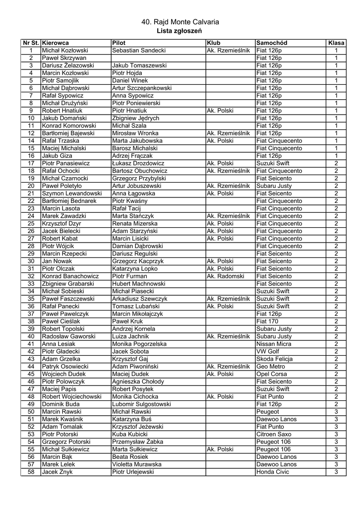 40. Rajd Monte Calvaria Lista zgłoszeń Nr St. 1 2 3 4 5 6 7 8 9 10 11 12 14 15 16 17 18 19 20 21 22 23 24 25 26 27 28 29 30 31 32 33 34 35 36 37 38 39 40 41 42 43 44 45 46 47 48 49 50 51 52 53 54 55 56 57 58 Kierowca Michał Kozłowski Paweł Skrzywan Dariusz Żelazowski Marcin Kozłowski Piotr Samojlik Michał Dąbrowski Rafał Sypowicz Michał Drużyński Robert Hnatiuk Jakub Domański Konrad Komorowski Bartłomiej Bajewski Rafał Trzaska Maciej Michalski Jakub Giza Piotr Panasiewicz Rafał Ochocki Michał Czarnocki Paweł Poletyło Szymon Lewandowski Bartłomiej Bednarek Marcin Lasota Marek Zawadzki Krzysztof Dzyr Jacek Bielecki Robert Kabat Piotr Wójcik Marcin Rzepecki Jan Nowak Piotr Olczak Konrad Banachowicz Zbigniew Grabarski Michał Sobieski Paweł Faszczewski Rafał Panecki Paweł Pawelczyk Paweł Cieślak Robert Topolski Radosław Gaworski Anna Lesiak Piotr Gładecki Adam Grzelka Patryk Osowiecki Wojciech Dudek Piotr Polowczyk Maciej Papis Robert Wojciechowski Dominik Buda Marcin Rawski Marek Kwaśnik Adam Tomalak Piotr Potorski Grzegorz Potorski Michał Sułkiewicz Marcin Bąk Marek Lelek Jacek Znyk Pilot Sebastian Sandecki Jakub Tomaszewski Piotr Hojda Daniel Winek Artur Szczepankowski Anna Sypowicz Piotr Poniewierski Piotr Hnatiuk Zbigniew Jędrych Michał Szala Mirosław Wronka Marta Jakubowska Barosz Michalski Adrzej Frączak Łukasz Drozdowicz Bartosz Obuchowicz Grzegorz Przybylski Artur Jobuszewski Anna Łągowska Piotr Kwaśny Rafał Tacij Marta Stańczyk Renata Mizerska Adam Starzyński Marcin Lisicki Damian Dąbrowski Dariusz Regulski Grzegorz Kacprzyk Katarzyna Lopko Piotr Furman Hubert Machnowski Michał Piasecki Arkadiusz Szewczyk Tomasz Lubański Marcin Mikołajczyk Paweł Kruk Andrzej Kornela Luiza Jachnik Monika Pogorzelska Jacek Sobota Krzysztof Gaj Adam Piwoniński Maciej Dudek Agnieszka Chołody Robert Posytek Monika Cichocka Lubomir Sulgostowski Michał Rawski Katarzyna Buś Krzysztof Jeżewski Kuba Kubicki Przemysław Żabka Marta Sułkiewicz Beata Rosiek Violetta Murawska Piotr Urlejewski Klub Ak. Rzemieślnik Ak. Polski Ak. Rzemieślnik Ak. Polski Ak. Polski Ak. Rzemieślnik Ak. Rzemieślnik Ak. Polski Ak. Rzemieślnik Ak. Polski Ak. Polski Ak. Polski Ak. Polski Ak. Polski Ak. Radomski Ak. Rzemieślnik Ak. Polski Ak. Rzemieślnik Ak. Rzemieślnik Ak. Polski Ak. Polski Ak. Polski Samochód Fiat 126p Fiat 126p Fiat 126p Fiat 126p Fiat 126p Fiat 126p Fiat 126p Fiat 126p Fiat 126p Fiat 126p Fiat 126p Fiat 126p Fiat Cinquecento Fiat Cinquecento Fiat 126p Suzuki Swift Fiat Cinquecento Fiat Seicento Subaru Justy Fiat Seicento Fiat Cinquecento Fiat Cinquecento Fiat Cinquecento Fiat Cinquecento Fiat Cinquecento Fiat Cinquecento Fiat Cinquecento Fiat Seicento Fiat Seicento Fiat Seicento Fiat Seicento Fiat Seicento Suzuki Swift Suzuki Swift Suzuki Swift Fiat 126p Fiat 170 Subaru Justy Subaru Justy Nissan Micra VW Golf Skoda Felicja Geo Metro Opel Corsa Fiat Seicento Suzuki Swift Fiat Punto Fiat 126p Peugeot Daewoo Lanos Fiat Punto Citroen Saxo Peugeot 106 Peugeot 106 Daewoo Lanos Daewoo Lanos Honda Civic Klasa 1 1 1 1 1 1 1 1 1 1 1 1 1 1 1 2 2 2 2 2 2 2 2 2 2 2 2 2 2 2 2 2 2 2 2 2 2 2 2 2 2 2 2 2 2 2 2 2 3 3 3 3 3 3 3 3 3 40. Rajd Monte Calvaria Lista zgłoszeń 59 60 61 62 63 64 65 66 67 68 69 70 71 72 73 74 75 76 77 78 79 80 81 82 83 84 85 86 87 88 89 90 91 92 93 94 95 96 97 98 99 100 101 102 103 104 105 106 107 108 109 110 111 112 113 114 115 116 Krzysztof Dracz Jarosław Nietrebka Andrzej Chomczyk Bartosz Strzałkowski Bartosz Mrówka Andrzej Chmura Paweł Brzykcy Maciej Kula Przemysław Zawadzki Filip Połeć Paweł Mazurek Adam Marciniak Marcin Kwiatkowski Grzegorz Modliborski Maciej Wrona Rafał Zgrzeźniak Krzysztof Bryja Grzegorz Kędzierski Paweł Żaczek Marcin Jankowski Rafał Brzyski Łukasz Błoński Łukasz Kiniewicz Stefan Radzimiński Błażej Michalec Piotr Fukowski Paweł Truszkowski Paweł Żukowski Tomasz Rusek Adam Gazda Maciej Ziemski Tomasz Rene Marek Pałacha Karol Frankowski Sławomir Wiśniewski Wojciech Żochowski Paweł Grzebieluch Jakub Orlik Jerzy Pyzel Rafał Stasiński Marcin Wendorff Krzysztof Szymański Adam Sekuła Wojciech Szczytnicki Marcin Czernik Grzegorz Staszewski Władysław Paszkowski Sebastian Trzaska Dariusz Witkowski Zygmunt Stanek Jagna Stankiewicz Artur Ryziński Marcin Jastrzębski Szymon Ruta Andrzej Kalitowicz Konrad Kwiatkowski Dominik Kalamus Dariusz Makaruk Robert Suchenek Jan Nietrebka Patryk karpiński Łukasz Strzałkowski Mariusz Komorowski Michał Janas Szymon Araczewski Monika Mazurkiewicz Artur Sułkowski Joanna Mazurek Paweł Wdowiak Michał Sadowski Jacek Bagiński Michał Wrona Jacek Niepiekło Marcin Molenda Ak. Rzemieślnik Ak. Rzemieślnik Ak. Rzemieślnik Ak. Rzemieślnik Ak. Polski Miłosz Kalinowski Marcin Grzebieluch Michał Rusin Adam Pazio Katarzyna Politalska Katarzyna Radzimińska Aleksandra Świerczyńska Iwona Nowakowska Tomasz Zaleski Bartosz Winiarek Piotr Witon Remigiusz Bonder Jarosław Dyoniziak Adam Maliszewski Gaweł Gołasiwicz Henryk Wiśniewskmi Łukasz Przesmycki Rafał Wardzyński Leszek Chłuda Szczepan Jabłuszewski Zygmunt Włodarczyk Jarosław Latosek Magdalena Michalska Katarzyna Grzonek-Jastrzębska Paweł Orlik Katarzyna Orlik Krzysztof Lewandowski Katarzyna Borek Renata Rutz Zuzanna Rykowska Filip Nivette Paweł Nowocień Marek Kalitowicz Sebastian Bogacki Andrzej Obrębowski Martyna Zarębska Ak. Polski Ak. Łódzki Ak. Polski Ak. Toruński Ak. Polski Ak. Rzemieślnik Ak. Kielce Ak. Polski Ak. Rzemieślnik Ak. Rzemieślnik Ak. Polski Ak. Polski Ak. Polski Ak. Polski Ak. Polski Ak. Rzemieślnik Ak. Polski Ak. Radomski Ak. Olsztyński AKDP Ak. Karkonoski Ak. Polski Honda Civic Toyota Corolla Toyota Corolla Ford Fiesta Ford Fiesta Citroen Saxo Citroen Saxo Citroen Saxo Citroen Saxo Fiat Uno Suzuki Baleno Ford Sierra Opel Corsa Peugeot 205 Peugeot 106 Fiat 125p VW Polo Opel Astra Nissan Micra Nissan Sunny Fiat Bravo Polonez Super 1800 Subaru Impreza Subaru Impreza Opel 