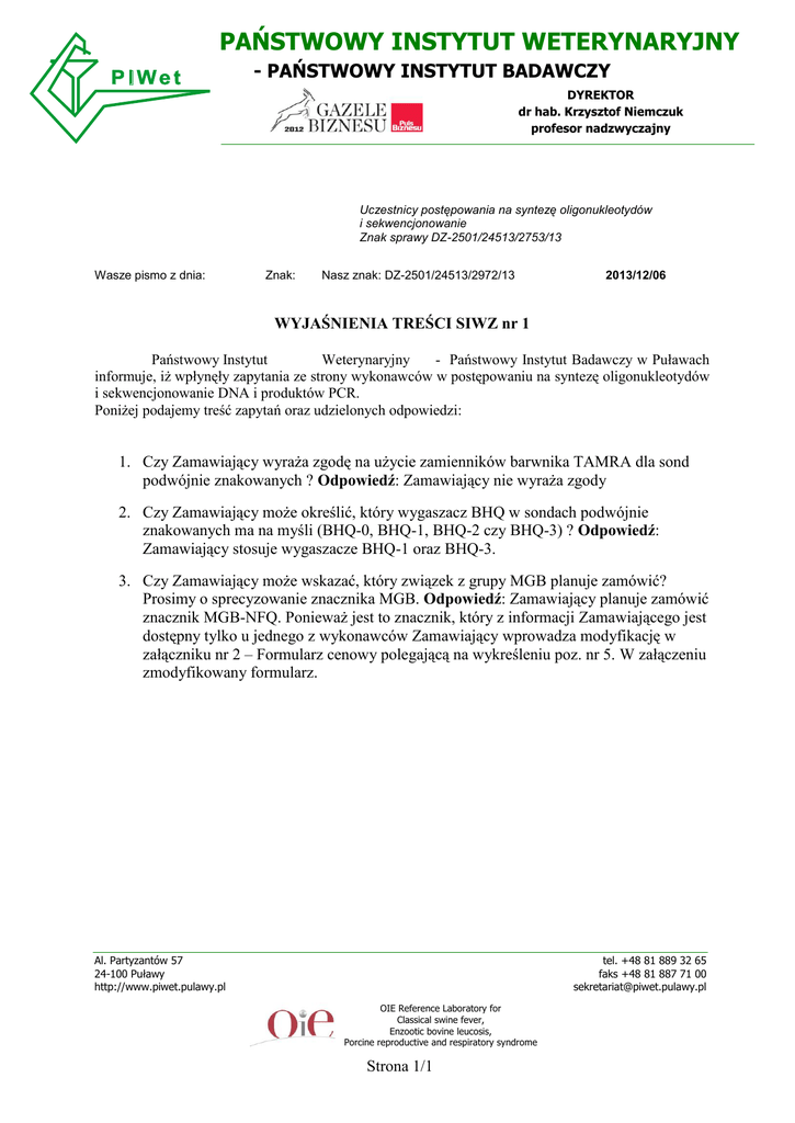 PAŃSTWOWY INSTYTUT WETERYNARYJNY - PAŃSTWOWY INSTYTUT BADAWCZY DYREKTOR dr hab. Krzysztof Niemczuk profesor nadzwyczajny Uczestnicy postępowania na syntezę oligonukleotydów i sekwencjonowanie Znak sprawy DZ-2501/24513/2753/13 Wasze pismo z dnia: Znak: Nasz znak: DZ-2501/24513/2972/13 2013/12/06 WYJAŚNIENIA TREŚCI SIWZ nr 1 Państwowy Instytut Weterynaryjny - Państwowy Instytut Badawczy w Puławach informuje, iż wpłynęły zapytania ze strony wykonawców w postępowaniu na syntezę oligonukleotydów i sekwencjonowanie DNA i produktów PCR. Poniżej podajemy treść zapytań oraz udzielonych odpowiedzi: 1. Czy Zamawiający wyraża zgodę na użycie zamienników barwnika TAMRA dla sond podwójnie znakowanych ? Odpowiedź: Zamawiający nie wyraża zgody 2. Czy Zamawiający może określić, który wygaszacz BHQ w sondach podwójnie znakowanych ma na myśli (BHQ-0, BHQ-1, BHQ-2 czy BHQ-3) ? Odpowiedź: Zamawiający stosuje wygaszacze BHQ-1 oraz BHQ-3. 3. Czy Zamawiający może wskazać, który związek z grupy MGB planuje zamówić? Prosimy o sprecyzowanie znacznika MGB. Odpowiedź: Zamawiający planuje zamówić znacznik MGB-NFQ. Ponieważ jest to znacznik, który z informacji Zamawiającego jest dostępny tylko u jednego z wykonawców Zamawiający wprowadza modyfikację w załączniku nr 2 – Formularz cenowy polegającą na wykreśleniu poz. nr 5. W załączeniu zmodyfikowany formularz. Al. Partyzantów 57 24-100 Puławy http://www.piwet.pulawy.pl tel. +48 81 889 32 65 faks +48 81 887 71 00 [email protected] OIE Reference Laboratory for Classical swine fever, Enzootic bovine leucosis, Porcine reproductive and respiratory syndrome Strona 1/1