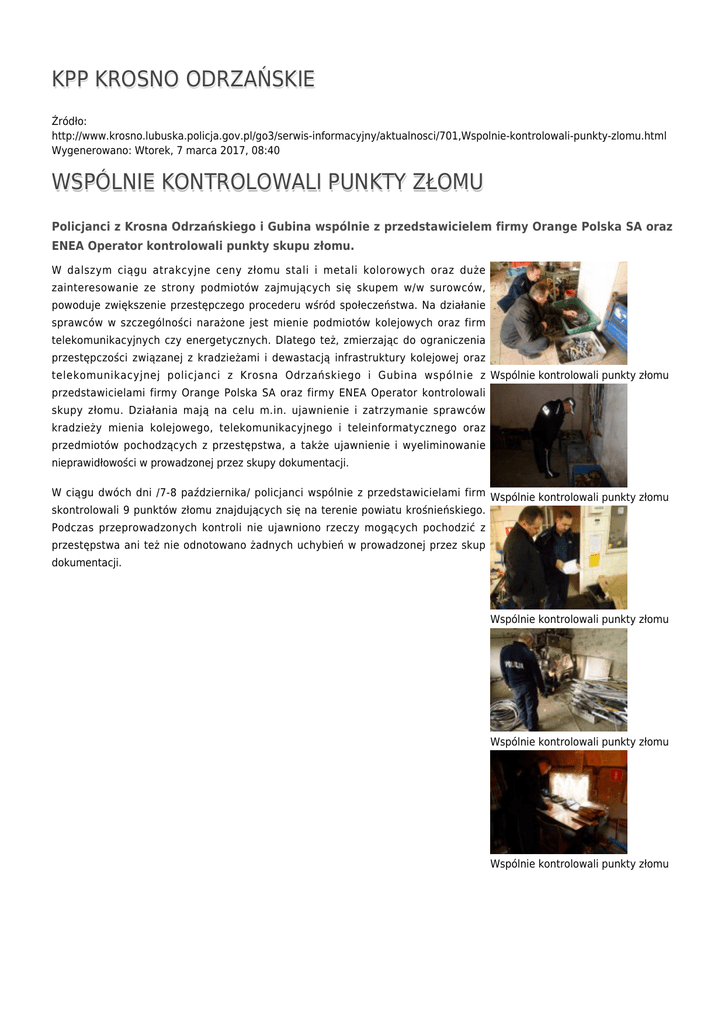 KPP KROSNO ODRZAŃSKIE Źródło: http://www.krosno.lubuska.policja.gov.pl/go3/serwis-informacyjny/aktualnosci/701,Wspolnie-kontrolowali-punkty-zlomu.html Wygenerowano: Wtorek, 7 marca 2017, 08:40 WSPÓLNIE KONTROLOWALI PUNKTY ZŁOMU Policjanci z Krosna Odrzańskiego i Gubina wspólnie z przedstawicielem firmy Orange Polska SA oraz ENEA Operator kontrolowali punkty skupu złomu. W dalszym ciągu atrakcyjne ceny złomu stali i metali kolorowych oraz duże zainteresowanie ze strony podmiotów zajmujących się skupem w/w surowców, powoduje zwiększenie przestępczego procederu wśród społeczeństwa. Na działanie sprawców w szczególności narażone jest mienie podmiotów kolejowych oraz firm telekomunikacyjnych czy energetycznych. Dlatego też, zmierzając do ograniczenia przestępczości związanej z kradzieżami i dewastacją infrastruktury kolejowej oraz telekomunikacyjnej policjanci z Krosna Odrzańskiego i Gubina wspólnie z Wspólnie kontrolowali punkty złomu przedstawicielami firmy Orange Polska SA oraz firmy ENEA Operator kontrolowali skupy złomu. Działania mają na celu m.in. ujawnienie i zatrzymanie sprawców kradzieży mienia kolejowego, telekomunikacyjnego i teleinformatycznego oraz przedmiotów pochodzących z przestępstwa, a także ujawnienie i wyeliminowanie nieprawidłowości w prowadzonej przez skupy dokumentacji. W ciągu dwóch dni /7-8 października/ policjanci wspólnie z przedstawicielami firm Wspólnie kontrolowali punkty złomu skontrolowali 9 punktów złomu znajdujących się na terenie powiatu krośnieńskiego. Podczas przeprowadzonych kontroli nie ujawniono rzeczy mogących pochodzić z przestępstwa ani też nie odnotowano żadnych uchybień w prowadzonej przez skup dokumentacji. Wspólnie kontrolowali punkty złomu Wspólnie kontrolowali punkty złomu Wspólnie kontrolowali punkty złomu Wspólnie kontrolowali punkty złomu Wspólnie kontrolowali punkty złomu Wspólnie kontrolowali punkty złomu Wspólnie kontrolowali punkty złomu Wspólnie kontrolowali punkty złomu Wspólnie kontrolowali punkty złomu Ocena: 0/5 (0) Tweetnij