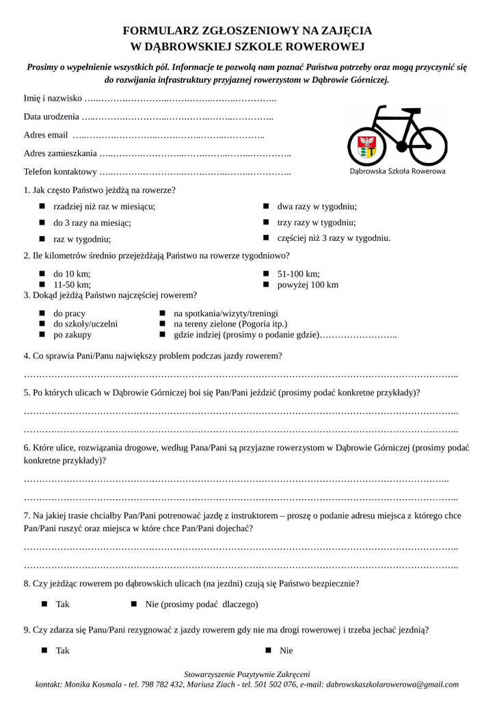 FORMULARZ ZGŁOSZENIOWY NA ZAJĘCIA W DĄBROWSKIEJ SZKOLE ROWEROWEJ Prosimy o wypełnienie wszystkich pól. Informacje te pozwolą nam poznać Państwa potrzeby oraz mogą przyczynić się do rozwijania infrastruktury przyjaznej rowerzystom w Dąbrowie Górniczej. Imię i nazwisko …..……….…………..…….……..……..………….. Data urodzenia …..……….…………..…….……..……..………….. Adres email …..……….…………..…….……..……..………….. Adres zamieszkania …..……….…………..…….……..……..………….. Telefon kontaktowy …..……….…………..…….……..……..………….. 1. Jak często Państwo jeżdżą na rowerze? rzadziej niż raz w miesiącu; dwa razy w tygodniu; do 3 razy na miesiąc; trzy razy w tygodniu; raz w tygodniu; częściej niż 3 razy w tygodniu. 2. Ile kilometrów średnio przejeżdżają Państwo na rowerze tygodniowo? do 10 km; 11-50 km; 3. Dokąd jeżdżą Państwo najczęściej rowerem? do pracy do szkoły/uczelni po zakupy 51-100 km; powyżej 100 km na spotkania/wizyty/treningi na tereny zielone (Pogoria itp.) gdzie indziej (prosimy o podanie gdzie)…………………….. 4. Co sprawia Pani/Panu największy problem podczas jazdy rowerem? …………………………………………………………………………………………………………………………….. 5. Po których ulicach w Dąbrowie Górniczej boi się Pan/Pani jeździć (prosimy podać konkretne przykłady)? …………………………………………………………………………………………………………………………….. …………………………………………………………………………………………………………………………….. 6. Które ulice, rozwiązania drogowe, według Pana/Pani są przyjazne rowerzystom w Dąbrowie Górniczej (prosimy podać konkretne przykłady)? ………………………………………………………………………………………………………………………….. …………………………………………………………………………………………………………………………….. 7. Na jakiej trasie chciałby Pan/Pani potrenować jazdę z instruktorem – proszę o podanie adresu miejsca z którego chce Pan/Pani ruszyć oraz miejsca w które chce Pan/Pani dojechać? …………………………………………………………………………………………………………………………….. …………………………………………………………………………………………………………………………….. 8. Czy jeżdżąc rowerem po dąbrowskich ulicach (na jezdni) czują się Państwo bezpiecznie? Tak Nie (prosimy podać dlaczego) 9. Czy zdarza się Panu/Pani rezygnować z jazdy rowerem gdy nie ma drogi rowerowej i trzeba jechać jezdnią? Tak Nie Stowarzyszenie Pozytywnie Zakręceni kontakt: Monika Kosmala - tel. 798 782 432, Mariusz Ziach - tel. 501 502 076, e-mail: [email protected] 10. Czy jeździ Pan/Pani rowerem po chodniku w przypadku gdy nie ma drogi rowerowej Jeśli odpowiedź brzmi „TAK” - prosimy o informację dlaczego. Tak, ponieważ……………………………………………………. Nie 11. Jak ocenia Pan/Pani swoją znajomość przepisów ruchu drogowego? (1-bardzo źle, 5 – bardzo dobrze). 1 2 3 12. Czy posiada Pani/Pan prawo jazdy i czy jeździ Pan/Pani samochodem? 4 5 Tak Nie 13. Jakimi zajęciami są Państwo najbardziej zainteresowani w naszej Szkole Rowerowej? Prawo o Ruchu Drogowym Pokaz slajdów z wyprawy rowerowej 14. Czy byliby Państwo zainteresowani wzięciem udziału w wycieczce rowerowej podsumowującej Dąbrowską Szkołę Rowerową. Jeśli tak, proszę podać ilość kilometrów, które mogą Państwo przejechać na takiej wycieczce i w jakim czasie (można podać średnią prędkość) TAK Jazdy po mieście z instruktorem NIE Warsztaty uczące obsługi technicznej roweru Ilość kilometrów:……………………………... Czas lub średnia prędkość………… 15. Czy są Państwo zainteresowani wzięciem udziału w kilkudniowej wyprawie rowerowej? 16. Czy są Państwo zainteresowani treningami MTB lub treningami szosowymi? TAK NIE 17. Prosimy o podanie Państwa pomysłów dotyczących zmian w organizacji ruchu ulic w Dąbrowie Górniczej, które przyczynią się do poprawy bezpieczeństwa rowerzystów. 18. Czy ma Pan/Pani swój rower? Tak Nie Oświadczam, że wyrażam zgodę na przetwarzanie moich danych osobowych w celach organizacji szkolenia z nauki jazdy rowerem po mieście, zgodnie z Ustawą z dn. 29 sierpnia 1997 r. o ochronie danych osobowych (Dz. U. z 2002 r. Nr 101, poz. 926 z późniejszymi zmianami), zgadzam się również na wykorzystanie swojego wizerunku przez media i sponsorów. Oświadczam, że jestem osobą pełnoletnią i mam podstawową wiedzę teoretyczną na temat zasad ruchu drogowego. Zdaje sobie sprawę, że rowerzysta-instruktor, choć jest doświadczonym cyklistą, nie ma wpływu na zachowanie moje oraz innych uczestników ruchu na drodze. W związku z czym to ja ponoszę wyłączną odpowiedzialność za swoje czyny na drodze i ewentualne szkody tym spowodowane. W razie, gdy doprowadzę do zdarzenia, lub gdy dojdzie do niego z winy innego niż instruktor uczestnika ruchu, zwalniam z odpowiedzialności prawnej i finansowej zarówno Stowarzyszenie Pozytywnie Zakręceni jak i samego Instruktora. ……….………..………………………………………………………… Data i podpis osoby zgłaszającej się do Dąbrowskiej Szkoły Rowerowej Stowarzyszenie Pozytywnie Zakręceni kontakt: Monika Kosmala - tel. 798 782 432, Mariusz Ziach - tel. 501 502 076, e-mail: [email protected]