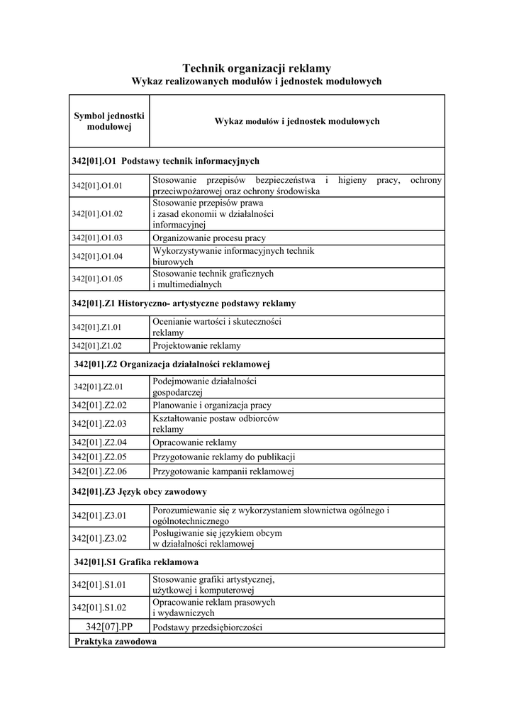 Technik organizacji reklamy Wykaz realizowanych modułów i jednostek modułowych Symbol jednostki modułowej Wykaz modułów i jednostek modułowych 342[01].O1 Podstawy technik informacyjnych 342[01].O1.01 342[01].O1.02 342[01].O1.03 342[01].O1.04 342[01].O1.05 Stosowanie przepisów bezpieczeństwa i przeciwpożarowej oraz ochrony środowiska Stosowanie przepisów prawa i zasad ekonomii w działalności informacyjnej Organizowanie procesu pracy Wykorzystywanie informacyjnych technik biurowych Stosowanie technik graficznych i multimedialnych higieny pracy, 342[01].Z1 Historyczno- artystyczne podstawy reklamy 342[01].Z1.01 342[01].Z1.02 Ocenianie wartości i skuteczności reklamy Projektowanie reklamy 342[01].Z2 Organizacja działalności reklamowej 342[01].Z2.04 Podejmowanie działalności gospodarczej Planowanie i organizacja pracy Kształtowanie postaw odbiorców reklamy Opracowanie reklamy 342[01].Z2.05 Przygotowanie reklamy do publikacji 342[01].Z2.06 Przygotowanie kampanii reklamowej 342[01].Z2.01 342[01].Z2.02 342[01].Z2.03 342[01].Z3 Język obcy zawodowy 342[01].Z3.01 342[01].Z3.02 Porozumiewanie się z wykorzystaniem słownictwa ogólnego i ogólnotechnicznego Posługiwanie się językiem obcym w działalności reklamowej 342[01].S1 Grafika reklamowa 342[01].S1.01 342[01].S1.02 Stosowanie grafiki artystycznej, użytkowej i komputerowej Opracowanie reklam prasowych i wydawniczych Podstawy przedsiębiorczości Praktyka zawodowa 342[07].PP ochrony