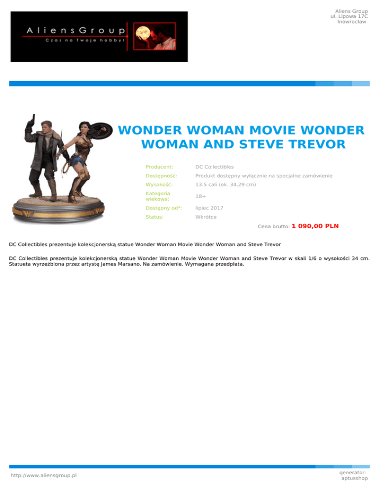 Aliens Group ul. Lipowa 17C Inowrocław WONDER WOMAN MOVIE WONDER WOMAN AND STEVE TREVOR Producent: DC Collectibles Dostępność: Produkt dostępny wyłącznie na specjalne zamówienie Wysokość: 13.5 cali (ok. 34,29 cm) Kategoria wiekowa: 18+ Dostępny od*: lipiec 2017 Status: Wkrótce Cena brutto: 1 090,00 PLN DC Collectibles prezentuje kolekcjonerską statue Wonder Woman Movie Wonder Woman and Steve Trevor DC Collectibles prezentuje kolekcjonerską statue Wonder Woman Movie Wonder Woman and Steve Trevor w skali 1/6 o wysokości 34 cm. Statueta wyrzeżbiona przez artystę James Marsano. Na zamówienie. Wymagana przedpłata. http://www.aliensgroup.pl generator: aptusshop