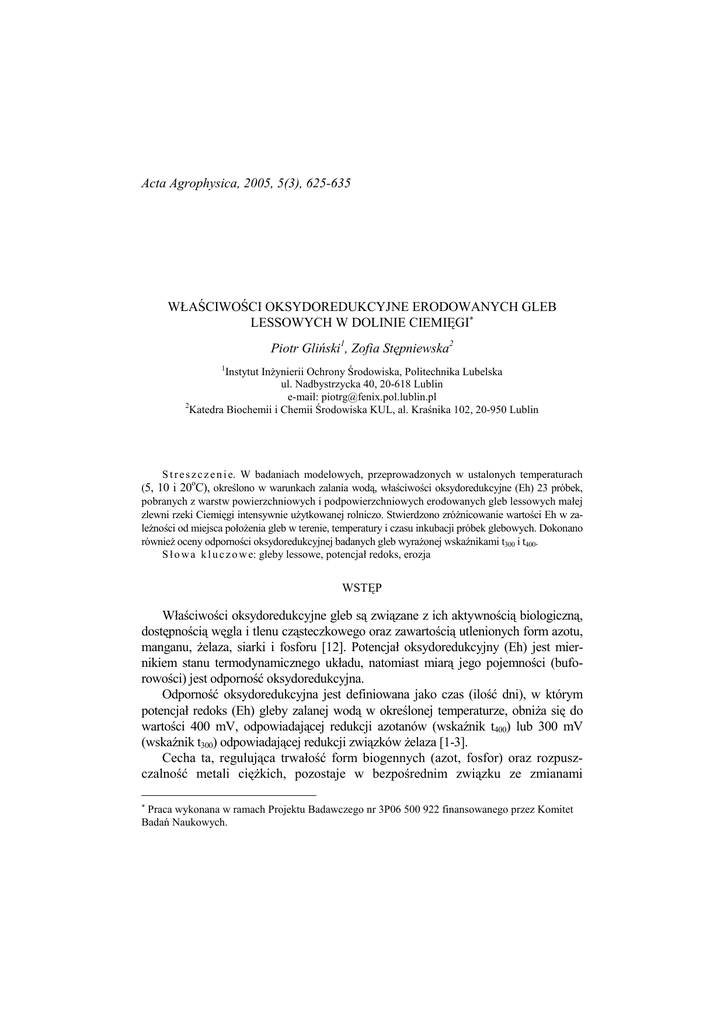 Acta Agrophysica, 2005, 5(3), 625-635 WŁAŚCIWOŚCI OKSYDOREDUKCYJNE ERODOWANYCH GLEB LESSOWYCH W DOLINIE CIEMIĘGI∗ Piotr Gliński1, Zofia Stępniewska2 1 Instytut InŜynierii Ochrony Środowiska, Politechnika Lubelska ul. Nadbystrzycka 40, 20-618 Lublin e-mail: [email protected] 2 Katedra Biochemii i Chemii Środowiska KUL, al. Kraśnika 102, 20-950 Lublin S t r e s z c z e n i e. W badaniach modelowych, przeprowadzonych w ustalonych temperaturach o (5, 10 i 20 C), określono w warunkach zalania wodą, właściwości oksydoredukcyjne (Eh) 23 próbek, pobranych z warstw powierzchniowych i podpowierzchniowych erodowanych gleb lessowych małej zlewni rzeki Ciemięgi intensywnie uŜytkowanej rolniczo. Stwierdzono zróŜnicowanie wartości Eh w zaleŜności od miejsca połoŜenia gleb w terenie, temperatury i czasu inkubacji próbek glebowych. Dokonano równieŜ oceny odporności oksydoredukcyjnej badanych gleb wyraŜonej wskaźnikami t300 i t400. S ł o w a k l u c z o w e: gleby lessowe, potencjał redoks, erozja WSTĘP Właściwości oksydoredukcyjne gleb są związane z ich aktywnością biologiczną, dostępnością węgla i tlenu cząsteczkowego oraz zawartością utlenionych form azotu, manganu, Ŝelaza, siarki i fosforu [12]. Potencjał oksydoredukcyjny (Eh) jest miernikiem stanu termodynamicznego układu, natomiast miarą jego pojemności (buforowości) jest odporność oksydoredukcyjna. Odporność oksydoredukcyjna jest definiowana jako czas (ilość dni), w którym potencjał redoks (Eh) gleby zalanej wodą w określonej temperaturze, obniŜa się do wartości 400 mV, odpowiadającej redukcji azotanów (wskaźnik t400) lub 300 mV (wskaźnik t300) odpowiadającej redukcji związków Ŝelaza [1-3]. Cecha ta, regulująca trwałość form biogennych (azot, fosfor) oraz rozpuszczalność metali cięŜkich, pozostaje w bezpośrednim związku ze zmianami ∗ Praca wykonana w ramach Projektu Badawczego nr 3P06 500 922 finansowanego przez Komitet Badań Naukowych. 626 P. GLIŃSKI, Z. STĘPNIEWSKA odczynu gleby [4,9]. MoŜe teŜ mieć zastosowanie w efektywniejszym wykorzystaniu nawozów mineralnych, przy planowaniu zabiegów melioracyjnych, a takŜe w ochronie środowiska przyrodniczego w związku z ograniczeniem emisji gazów szklarniowych z gleb [4,8,9]. Celem pracy było określenie właściwości oksydoredukcyjnych oraz wskaźników odporności gleb na redukcję t400 i t300 w ustalonych warunkach wilgotności i temperatury, na przykładzie erodowanych gleb lessowych małej zlewni intensywnie uŜytkowanej rolniczo [5]. MATERIAŁ I METODY Zlewnia Ciemięgi (rys. 1) jest połoŜona na PłaskowyŜu Nałęczowskim, stanowiącym region WyŜyny Lubelskiej. Rzeka Ciemięga jest lewobrzeŜnym dopływem Bystrzycy. Jej źródła znajdują się w Motyczu (223 m n.p.m.), a ujście – w Pliszczynie (160 m n.p.m.). Zlewnia zajmuje powierzchnię 157 km2, a jej długość wynosi 41 km. W 90% zlewnia jest pokryta lessem, z którego wykształciły się gleby płowe i brunatne, w róŜnym stopniu erodowane (tab. 1). 3 11 2 4 4 Rys. 1. Zlewnia Ciemięgi. Miejscowości: 1 – Pliszczyn, 2 – Baszki, 3 – Snopków, 4 – Motycz Fig. 1. Ciemięga catchment. Locality: 1 – Pliszczyn, 2 – Baszki, 3 – Snopków, 4 – Motycz Do badań pobrano w 2003 roku 23 próbki glebowe z 2 warstw (0-20 i 20-40 lub 20-60 cm) z 3-4 miejsc na erodowanch zboczach wzdłuŜ biegu rzeki (idąc od źródeł: Motycz, Snopków, Baszki, Pliszczyn). Oznaczone w tych próbkach właściwości pozwalają je zaliczyć do grupy granulometrycznej pyłu gliniastego. Zawartość materii organicznej (M.O.) wahała się w granicach 1,74-5,42% (średnio WŁAŚCIWOŚCI OKSYDOREDUKCYJNE ERODOWANYCH GLEB LESSOWYCH 627 dla gleb całej zlewni 2,86%). Znaczne róŜnice w zawartości materii organicznej wystąpiły wzdłuŜ zboczy erodowanych, wykazując najniŜsze wartości (2,15%) w środkowej części zboczy i największe w dolnej części zboczy (3,58%). Z materią organiczną związana jest całkowita powierzchnia właściwa, jako cecha charakteryzująca łącznie ilość i jakość organicznych i mineralnych koloidów glebowych. Największe wartości powierzchni właściwej ogólnej SH2O(55,69 i 70,95 m2·g-1) stwierdzono w próbkach nr 3.3 i 4.3 o najwyŜszej zawartości materii organicznej. RóŜnica w powierzchni właściwej zewnętrznej (SN2) była znacznie mniejsza (5,25-15,31 m2·g-1). Odczyn próbek glebowych był obojętny i zasadowy wahając się w granicach dwóch jednostek pH 6,4-8,4. Oznaczenia wartości Eh wykonano poprzez inkubację, w ustalonych temperaturach (5, 10 i 20°C) gleb zalanych wodą w stosunku 1:2,5 (15 g gleby + 37,5 cm3 wody) w zamkniętych naczyńkach szklanych. Pomiary Eh w zawiesinie glebowej wykonywano po upływie 1, 3, 5, 12, 42 i 60 dni. Do pomiarów uŜyto wielofunkcyjnego miernika PIONer 65 firmy Radiometer Analytical AS o rozdzielczości 0,1 mV, dokładności ±1012 Ohma oraz kombinowanej elektrody Pt MC 3187 tej samej firmy. Wielkości wskaźników t400 i t300 wyznaczono z zaleŜności: Eh w funkcji czasu inkubacji [2,6,8]. 2 y = -3,8024x + 0,1976x + 399,89 R2 = 0,9385 2 y = 0,2024x - 27,069x + 404,26 2 R = 0,8066 2 y = 8,8357x - 96,079x + 486 2 R = 0,9843 Rys. 2. Dynamika zmian Eh w 5°C (a), 10°C (b) i 20°C (c) w glebach z Pliszczyna (istotna przy p = 0,001) Fig. 2. Dynamics of Eh changes at 5°C (a), 10°C (b) and 20°C (c) in soils from Pliszczyn (significant at p = 0.001) 628 P. GLIŃSKI, Z. STĘPNIEWSKA W niniejszej pracy przedstawiono wyniki uzyskane w zbliŜonych do siebie 7 i 10 dniu inkubacji, aby uzyskać porównywalne ich odniesienie w trzech analizowanych temperaturach (rys. 2). WYNIKI I DYSKUSJA Wyniki przeprowadzonych badań przedstawiono w tabelach 2-7 oraz na rysunku 3. Stwierdzono istotny wpływ temperatury na wielkość Eh i wskaźniki odporności oksydoredukcyjnej t400 i t300 (rys. 3, tab. 3). Wraz ze wzrostem temperatury obniŜała się wielkość Eh średnio od 361 mV w tempe