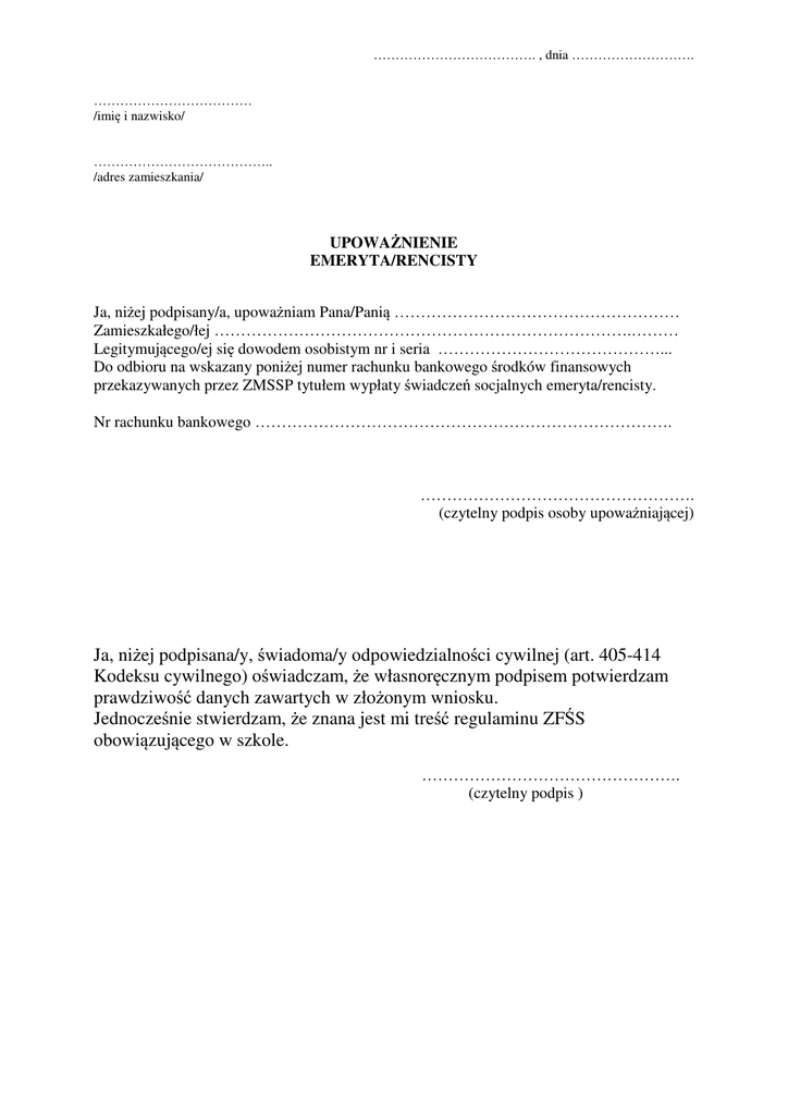 ………………………………. , dnia ………………………. ……………………………… /imię i nazwisko/ ………………………………….. /adres zamieszkania/ UPOWAŻNIENIE EMERYTA/RENCISTY Ja, niżej podpisany/a, upoważniam Pana/Panią ……………………………………………… Zamieszkałego/łej …………………………………………………………………….……… Legitymującego/ej się dowodem osobistym nr i seria ……………………………………... Do odbioru na wskazany poniżej numer rachunku bankowego środków finansowych przekazywanych przez ZMSSP tytułem wypłaty świadczeń socjalnych emeryta/rencisty. Nr rachunku bankowego ……………………………………………………………………. ……………………………………………. (czytelny podpis osoby upoważniającej) Ja, niżej podpisana/y, świadoma/y odpowiedzialności cywilnej (art. 405-414 Kodeksu cywilnego) oświadczam, że własnoręcznym podpisem potwierdzam prawdziwość danych zawartych w złożonym wniosku. Jednocześnie stwierdzam, że znana jest mi treść regulaminu ZFŚS obowiązującego w szkole. …………………………………………. (czytelny podpis )