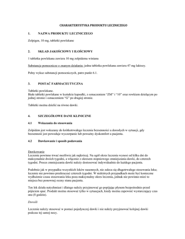 CHARAKTERYSTYKA PRODUKTU LECZNICZEGO 1. NAZWA PRODUKTU LECZNICZEGO Zolpigen, 10 mg, tabletki powlekane 2. SKŁAD JAKOŚCIOWY I ILOŚCIOWY 1 tabletka powlekana zawiera 10 mg zolpidemu winianu Substancje pomocnicze o znanym działaniu: jedna tabletka powlekana zawiera 47 mg laktozy. Pełny wykaz substancji pomocniczych, patrz punkt 6.1. 3. POSTAĆ FARMACEUTYCZNA Tabletki powlekane. Białe tabletki powlekane w kształcie kapsułki, z oznaczeniem “ZM” i “10” oraz rowkiem dzielącym po jednej stronie i oznaczeniem “G” po drugiej stronie. Tabletki można dzielić na równe dawki. 4. SZCZEGÓŁOWE DANE KLINICZNE 4.1 Wskazania do stosowania Zolpidem jest wskazany do krótkotrwałego leczenia bezsenności u dorosłych w sytuacji, gdy bezsenność jest powoduje wyczerpanie lub poważny dyskomfort u pacjenta. 4.2 Dawkowanie i sposób podawania Dawkowanie Leczenie powinno trwać możliwie jak najkrócej. Na ogół okres leczenia wynosi od kilku dni do maksymalnie dwóch tygodni, a włącznie z okresem stopniowego zmniejszania dawki, do czterech tygodni. Proces zmniejszania dawki należy dostosować indywidualnie do każdego pacjenta. Podobnie jak w przypadku wszystkich leków nasennych, nie zaleca się długotrwałego stosowania leku; leczenie nie powinno przekraczać czterech tygodni. W niektórych przypadkach może być konieczne wydłużenie czasu stosowania leku poza maksymalny okres leczenia, jednak nie powinno mieć to miejsca bez ponownej oceny stanu pacjenta. Ten lek działa natychmiast i dlatego należy przyjmować go popijając płynem bezpośrednio przed pójściem spać. Produkt można stosować tylko w sytuacjach, kiedy można zapewnić wystarczający czas snu (8 godzin). Dorośli Leczenie należy stosować w postaci pojedynczej dawki i nie należy przyjmować kolejnej dawki podczas tej samej nocy. Zalecaną dawkę dobową dla dorosłych wynoszącą 10 mg, należy przyjmować bezpośrednio przed snem. Należy stosować najniższą skuteczną dawkę dobową zolpidemu, która nie może przekraczać 10 mg. Pacjenci w podeszłym wieku (powyżej 65 roku życia) oraz pacjenci osłabieni U pacjentów w podeszłym wieku oraz osłabionych, którzy mogą być szczególnie wrażliwi na działanie zolpidemu zalecana dawka wynosi 5 mg. Nie należy przekraczać zalecanej dawki. Pacjenci z zaburzeniami czynności wątroby Ponieważ u pacjentów z niewydolnością wątroby klirens i metabolizm zolpidemu jest zmniejszony, dlatego dawkowanie leku powinno rozpocząć się od 5 mg, z zachowaniem szczególnej ostrożności w przypadku pacjentów w podeszłym wieku. U osób dorosłych (powyżej 65 roku życia) dawka może zostać zwiększona do 10 mg, tylko wówczas, gdy odpowiedź na leczenie jest niedostateczna, a lek jest dobrze tolerowany. Całkowita dawka dobowa zolpidemu w każdej grupie pacjentów nie powinna przekraczać 10 mg. Populacja pediatryczna Zolpidemu nie należy stosować u dzieci i młodzieży w wieku poniżej 18 lat, ze względu na brak dostępnych danych potwierdzających stosowanie leku w tej grupie wiekowej. Dostępne wyniki kontrolowanych badań klinicznych placebo przedstawione zostały w punkcie 5.1. Sposób podawania Podanie doustne. 4.3 Przeciwwskazania Nadwrażliwość na substancję czynną lub którykolwiek inny składnik wymieniony w punkcie 6.1. Ciężkie zaburzenia czynności wątroby. Zespół bezdechu sennego. Miastenia. Ostra i (lub) ciężka niewydolność oddechowa. 4.4 Specjalne ostrzeżenia i środki ostrożności dotyczące stosowania Ogólne Jeśli jest to możliwe, należy zidentyfikować przyczynę bezsenności. Przyczynę bezsenności należy leczyć przed przepisaniem leku nasennego. Utrzymywanie się bezsenności po 7-14 dniach leczenia może wskazywać na chorobę podstawową - zaburzenie psychiczne lub chorobę organiczną, co należy wyjaśnić. Poniżej podano ogólne informacje dotyczące efektów obserwowanych po podaniu benzodiazepin oraz innych leków nasennych, które powinny być uwzględnione przez lekarza przepisującego lek. Tolerancja Po kilkutygodniowym, ciągłym stosowaniu benzodiazepin o krótkim czasie działania oraz leków zbliżonych do benzodiazepin, może dochodzić do częściowej utraty ich skuteczności Zależność Stosowanie benzodiazepin oraz leków zbliżonych do benzodiazepin może prowadzić do rozwoju uzależnienia fizycznego i psychicznego od tych leków. Ryzyko uzależnienia wzrasta wraz z dawką i czasem trwania leczenia i jest większe u pacjentów, nadużywających leków lub alkoholu w wywiadzie. Podczas stosowania zolpidemu pacjentów należy uważnie obserwować. Po rozwoju uzależnienia fizycznego, nagłemu przerwaniu leczenia będą towarzyszyć objawy odstawienne. Należą do nich ból 2 głowy i mięśni, skrajny lęk i napięcie, niepokój ruchowy, dezorientacja, rozdrażnienie oraz bezsenność. W ciężkich przypadkach mogą wystąpić następujące objawy: derealizacja, depersonalizacja, przeczulica słuchowa, mrowienie i drętwienie kończyn, nadwrażliwość na światło, dźwięki i kontakt fizyczny, omamy oraz ataki drgawek. Nawrót bezsenności Po odstawieniu leku nasennego może wystąpić przemijający zespół, w którym objawy, które doprowadziły do leczenia benzodiazepiną lub lekiem zbliżonym do benzodiazepin nawracają w nasilonej postaci. Mogą mu towarzyszyć inne reakcje, takie jak zmiany nastroju, lęk oraz niepokój ruchowy. Jest ważne, aby ostrzec pacjenta o możliwości wystąpienia tzw. zjawiska „z odbicia” (nawrotu bezsenności), co zminimalizuje lęk przed tymi objawami, w razie ich wystąpienia po zaprzestaniu przyjmowania leku. Wykazano, że w przypadku stosowania benzodiazepin lub leków zbliżonych do benzodiazepin o krótkim czasie działania, zespół odstawienny może wystąpić pomiędzy zastosowaniem dawek, zwłaszcza w przypadku stosowania dużych dawek. Ponieważ ryzyko zespołu odstawiennego i (lub) tzw. „zjawiska z odbicia” jest bardziej prawdopodobne po