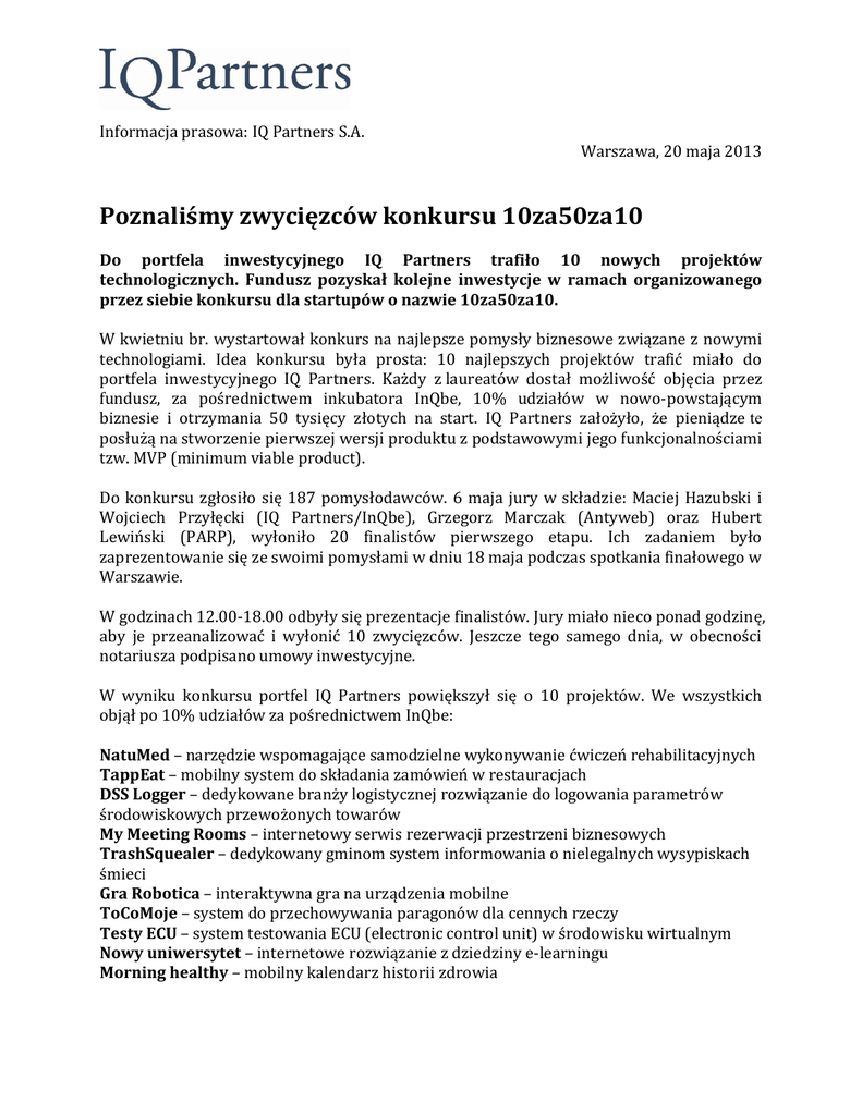 Informacja prasowa: IQ Partners S.A. Warszawa, 20 maja 2013 Poznaliśmy zwycięzców konkursu 10za50za10 Do portfela inwestycyjnego IQ Partners trafiło 10 nowych projektów technologicznych. Fundusz pozyskał kolejne inwestycje w ramach organizowanego przez siebie konkursu dla startupów o nazwie 10za50za10. W kwietniu br. wystartował konkurs na najlepsze pomysły biznesowe związane z nowymi technologiami. Idea konkursu była prosta: 10 najlepszych projektów trafić miało do portfela inwestycyjnego IQ Partners. Każdy z laureatów dostał możliwość objęcia przez fundusz, za pośrednictwem inkubatora InQbe, 10% udziałów w nowo-powstającym biznesie i otrzymania 50 tysięcy złotych na start. IQ Partners założyło, że pieniądze te posłużą na stworzenie pierwszej wersji produktu z podstawowymi jego funkcjonalnościami tzw. MVP (minimum viable product). Do konkursu zgłosiło się 187 pomysłodawców. 6 maja jury w składzie: Maciej Hazubski i Wojciech Przyłęcki (IQ Partners/InQbe), Grzegorz Marczak (Antyweb) oraz Hubert Lewiński (PARP), wyłoniło 20 finalistów pierwszego etapu. Ich zadaniem było zaprezentowanie się ze swoimi pomysłami w dniu 18 maja podczas spotkania finałowego w Warszawie. W godzinach 12.00-18.00 odbyły się prezentacje finalistów. Jury miało nieco ponad godzinę, aby je przeanalizować i wyłonić 10 zwycięzców. Jeszcze tego samego dnia, w obecności notariusza podpisano umowy inwestycyjne. W wyniku konkursu portfel IQ Partners powiększył się o 10 projektów. We wszystkich objął po 10% udziałów za pośrednictwem InQbe: NatuMed – narzędzie wspomagające samodzielne wykonywanie ćwiczeń rehabilitacyjnych TappEat – mobilny system do składania zamówień w restauracjach DSS Logger – dedykowane branży logistycznej rozwiązanie do logowania parametrów środowiskowych przewożonych towarów My Meeting Rooms – internetowy serwis rezerwacji przestrzeni biznesowych TrashSquealer – dedykowany gminom system informowania o nielegalnych wysypiskach śmieci Gra Robotica – interaktywna gra na urządzenia mobilne ToCoMoje – system do przechowywania paragonów dla cennych rzeczy Testy ECU – system testowania ECU (electronic control unit) w środowisku wirtualnym Nowy uniwersytet – internetowe rozwiązanie z dziedziny e-learningu Morning healthy – mobilny kalendarz historii zdrowia Konkurs zorganizował fundusz IQ Partners oraz należący jego portfela inkubator technologiczny InQbe. Partnerem wydarzenia było Antyweb.pl oraz PARP. IQ Partners zapowiada kolejną edycję wydarzenia w przyszłym roku. W portfelu inwestycyjnym funduszu jest już 85 spółek. To największy portfel w obszarze inwestycji w obszarze seed i start up w Polsce. Do tej pory IQ Partners zainwestowało w ponad 90 spółek, przeznaczając na to kwotę ponad 50 mln zł. Spółka konsekwentnie powiększa portfel przedsięwzięć na wczesnym etapie rozwoju w strategicznych obszarach inwestycyjnych z zakresu nowych technologii: media i marketing, gry i rozrywka, telekomunikacja i IT, finanse, edukacja, serwisy B2B oraz B2C. Więcej informacji udziela: Joanna Kółkowska / agencja Kolko mail: [email protected] / tel.: +48 660 505 044