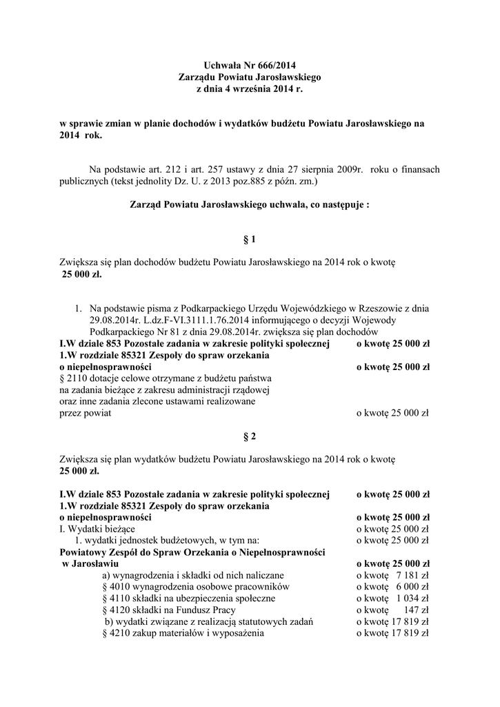 Uchwała Nr 666/2014 Zarządu Powiatu Jarosławskiego z dnia 4 września 2014 r. w sprawie zmian w planie dochodów i wydatków budżetu Powiatu Jarosławskiego na 2014 rok. Na podstawie art. 212 i art. 257 ustawy z dnia 27 sierpnia 2009r. roku o finansach publicznych (tekst jednolity Dz. U. z 2013 poz.885 z późn. zm.) Zarząd Powiatu Jarosławskiego uchwala, co następuje : §1 Zwiększa się plan dochodów budżetu Powiatu Jarosławskiego na 2014 rok o kwotę 25 000 zł. 1. Na podstawie pisma z Podkarpackiego Urzędu Wojewódzkiego w Rzeszowie z dnia 29.08.2014r. L.dz.F-VI.3111.1.76.2014 informującego o decyzji Wojewody Podkarpackiego Nr 81 z dnia 29.08.2014r. zwiększa się plan dochodów I.W dziale 853 Pozostałe zadania w zakresie polityki społecznej o kwotę 25 000 zł 1.W rozdziale 85321 Zespoły do spraw orzekania o niepełnosprawności o kwotę 25 000 zł § 2110 dotacje celowe otrzymane z budżetu państwa na zadania bieżące z zakresu administracji rządowej oraz inne zadania zlecone ustawami realizowane przez powiat o kwotę 25 000 zł §2 Zwiększa się plan wydatków budżetu Powiatu Jarosławskiego na 2014 rok o kwotę 25 000 zł. I.W dziale 853 Pozostałe zadania w zakresie polityki społecznej 1.W rozdziale 85321 Zespoły do spraw orzekania o niepełnosprawności I. Wydatki bieżące 1. wydatki jednostek budżetowych, w tym na: Powiatowy Zespół do Spraw Orzekania o Niepełnosprawności w Jarosławiu a) wynagrodzenia i składki od nich naliczane § 4010 wynagrodzenia osobowe pracowników § 4110 składki na ubezpieczenia społeczne § 4120 składki na Fundusz Pracy b) wydatki związane z realizacją statutowych zadań § 4210 zakup materiałów i wyposażenia o kwotę 25 000 zł o kwotę 25 000 zł o kwotę 25 000 zł o kwotę 25 000 zł o kwotę 25 000 zł o kwotę 7 181 zł o kwotę 6 000 zł o kwotę 1 034 zł o kwotę 147 zł o kwotę 17 819 zł o kwotę 17 819 zł 2.dotacje na zadania bieżące 3.świadczenia na rzecz osób fizycznych 4.wydatki na programy finansowane z udziałem środków pochodzących z budżetu UE, pomocy EFTA oraz ze źródeł zagranicznych niepodlegające zwrotowi, w części związanej z realizacją zadań Powiatu 5.wypłaty z tytułu poręczeń i gwarancji 6. obsługa długu II. Wydatki majątkowe 1) inwestycje i zakupy inwestycyjne 2) zakup i objęcie akcji i udziałów 3) wniesienie wkładów do spółek prawa handlowego o kwotę o kwotę 0 0 o kwotę o kwotę o kwotę o kwotę o kwotę o kwotę o kwotę 0 0 0 0 0 0 0 §3 Dokonuje się przeniesień pomiędzy rozdziałami i paragrafami wydatków w następujących jednostkach : I.W dziale 600 Transport i łączność 1.W rozdziale 60014 Drogi publiczne powiatowe 1) W Powiatowym Zarządzie Dróg w Jarosławiu zmniejszenie : § 4300 zakup usług pozostałych zwiększenie : § 4390 zakup usług obejmujących wykonanie ekspertyz, analiz i opinii o kwotę 12 600 zł o kwotę 12 600 zł II.W dziale 801 Oświata i wychowanie 1.W rozdziale 80195 Pozostała działalność 1) W Zespole Szkół Technicznych i Ogólnokształcących w Jarosławiu zmniejszenie : § 4307 zakup usług pozostałych o kwotę 14 357,52 zł § 4309 zakup usług pozostałych o kwotę 197,48 zł Razem 14 555,00 zł 2) W Specjalnym Ośrodku Szkolno – Wychowawczym w Jarosławiu zwiększenie : § 3247 stypendia dla uczniów o kwotę 4 932,16 zł § 3249 stypendia dla uczniów o kwotę 67,84 zł § 4247 zakup pomocy naukowych, dydaktycznych i książek o kwotę 9 425,36 zł § 4249 zakup pomocy naukowych, dydaktycznych i książek o kwotę 129,64 zł razem 14 555,00 zł III.W dziale 852 Pomoc społeczna 1.W rozdziale 85201 Placówki oświatowo – wychowawcze 1) W Domu Dziecka w Jarosławiu zmniejszenie: § 4010 wynagrodzenia osobowe pracowników § 4230 zakup leków, wyrobów medycznych i produktów o kwotę 20 000 zł biobójczych § 4110 składki na ubezpieczenia społeczne § 4260 zakup energii razem o kwotę 5 000 zł o kwotę 10 000 zł o kwotę 5 000 zł 40 000 zł 2.W rozdziale 85202 Domy pomocy społecznej 1) W Domu Pomocy Społecznej w Jarosławiu / zadania własne / zmniejszenie : § 3020 wydatki osobowe niezaliczone do wynagrodzeń § 4010 wynagrodzenia osobowe pracowników § 4110 składki na ubezpieczenia społeczne § 4260 zakup energii § 4300 zakup usług pozostałych razem zwiększenie : § 4220 zakup środków żywności 2) W Domu Pomocy Społecznej w Wysocku / zadania własne / zwiększenie : § 4220 zakup środków żywności o kwotę 347 zł o kwotę 20 000 zł o kwotę 3 400 zł o kwotę 30 648 zł o kwotę 10 000 zł 64 395 zł o kwotę 24 395 zł o kwotę 40 000 zł 3) W Domu Pomocy Społecznej w Moszczanach / zadania własne / zmniejszenie : § 4010 wynagrodzenia osobowe pracowników § 4120 składki na Fundusz Pracy § 4170 wynagrodzenia bezosobowe § 4210 zakup materiałów i wyposażenia § 4390 zakup usług obejmujących wykonanie ekspertyz, analiz i opinii § 4520 opłaty na rzecz budżetów jednostek samorządu terytorialnego § 4700 szkolenia pracowników niebędących członkami korpusu służby cywilnej razem zwiększenie : § 4220 zakup środków żywności § 4230 zakup leków, wyrobów medycznych i produktów biobójczych razem §4 Wykonanie uchwały powierza się Przewodniczącemu Zarządu. o kwotę 10 000 zł o kwotę 1 400 zł o kwotę 1 740 zł o kwotę 1 291 zł o kwotę 1 087 zł o kwotę 1 482 zł o kwotę 1 000 zł 18 000 zł o kwotę 55 000 zł o kwotę 3 000 zł 58 000 zł §5 Uchwała wchodzi w życie z dniem podjęcia. Przewodniczący Zarządu Powiatu Jarosławskiego Jerzy Batycki