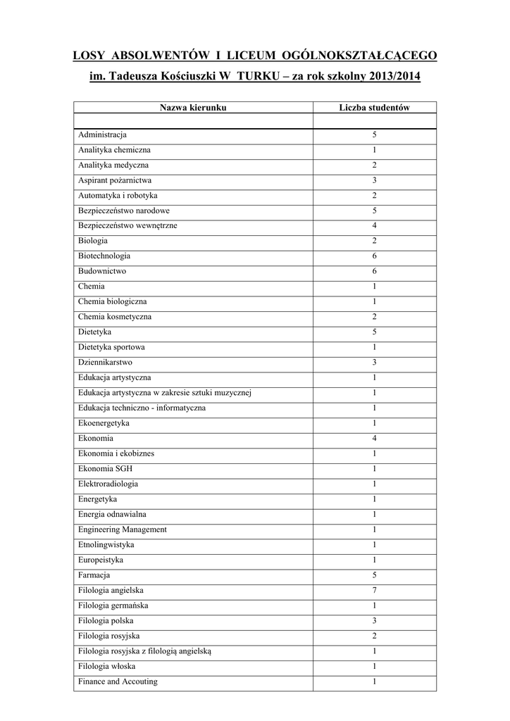 LOSY ABSOLWENTÓW I LICEUM OGÓLNOKSZTAŁCĄCEGO im. Tadeusza Kościuszki W TURKU – za rok szkolny 2013/2014 Nazwa kierunku Liczba studentów Administracja 5 Analityka chemiczna 1 Analityka medyczna 2 Aspirant pożarnictwa 3 Automatyka i robotyka 2 Bezpieczeństwo narodowe 5 Bezpieczeństwo wewnętrzne 4 Biologia 2 Biotechnologia 6 Budownictwo 6 Chemia 1 Chemia biologiczna 1 Chemia kosmetyczna 2 Dietetyka 5 Dietetyka sportowa 1 Dziennikarstwo 3 Edukacja artystyczna 1 Edukacja artystyczna w zakresie sztuki muzycznej 1 Edukacja techniczno - informatyczna 1 Ekoenergetyka 1 Ekonomia 4 Ekonomia i ekobiznes 1 Ekonomia SGH 1 Elektroradiologia 1 Energetyka 1 Energia odnawialna 1 Engineering Management 1 Etnolingwistyka 1 Europeistyka 1 Farmacja 5 Filologia angielska 7 Filologia germańska 1 Filologia polska 3 Filologia rosyjska 2 Filologia rosyjska z filologią angielską 1 Filologia włoska 1 Finance and Accouting 1 Finanse i rachunkowość 17 Fizjoterapia 8 Fizyka techniczna 2 GCSE English, Maths 1 Geodezja i kartografia 1 Gospodarka i inżynieria wodna 1 Gospodarka przestrzenna 1 Gospodarka turystyczna 3 Informacja naukowa i biblitekoznawstwo 1 Informatyka 11 Informatyka stosowana 1 Inzynieria biomedyczna 2 Inżynieria bezpieczeństwa 2 Inżynieria biotworzyw 1 Inżynieria chemiczna 1 Inżynieria rolnictwa 1 Inżynieria środowiska 2 Inżynieria zarządzania 4 Kognitywistyka 1 Komunikacja wizerunkowa 1 Kosmetologia 10 Kryminologia i kryminalistyka 1 Lekarski 5 Lekarsko - dentystyczny 2 Leśnictwo 2 Lingwistyka stosowana 1 Logistyka 13 Logopedia z audiologią 1 Marketing 1 Matematyka 2 Matematyka i informatyka 2 Matematyka, archiwistyka i zarządzanie 1 Mechanika i budowa maszyn 5 Mechatronika 1 Międzynarodowe stosunki gospodarcze 3 Międzynarodowe studia kulturalne 1 Nawigacja 2 Niderlandystyka 1 Oficer policji 2 Oficer pożarnictwa 2 Organizacja i zarządzanie 2 Pedagogika 6 Pedagogika resocjalizacyjna 2 Pedagogika specjalna 2 Pedagogika wczesnoszkolna 1 Pielęgniarstwo 2 Położnictwo 4 Praca socjalna 3 Prawo 15 Prawo autorskie 1 Projektowanie ubiorów 1 Psychologia 5 Rachunkowość 1 Ratownictwo medyczne 2 Resocjalizacja 1 Skandynawistyka 3 Socjoterapia i promocja zdrowia 1 Stosunki międzynarodowe 2 Technologia żywności 5 Teleinformatyka 1 Telekomunikacja 1 Towaroznawstwo 2 Transport 2 Weterynaria 2 Wojskoznawstwo 1 Wychowanie fizyczne w grupach dyspozycyjnych 2 Wychowanie wczesnoszkolne z językiem angielskim 1 Zarządzanie 6 Zarządzanie / logistyka 1 Zarządzanie finansami i rachunkowość 1 Zarządzanie i inżynieria produkcji 3 Zarządzanie państwem 1 Zdrowie publiczne 1 Zootechnika 2 Brak danych 46 Razem 338 87,98% absolwentów – podejmuje dalej naukę