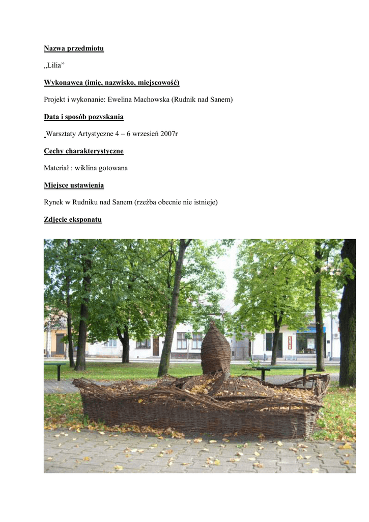 Nazwa przedmiotu „Lilia” Wykonawca (imię, nazwisko, miejscowość) Projekt i wykonanie: Ewelina Machowska (Rudnik nad Sanem) Data i sposób pozyskania Warsztaty Artystyczne 4 – 6 wrzesień 2007r Cechy charakterystyczne Materiał : wiklina gotowana Miejsce ustawienia Rynek w Rudniku nad Sanem (rzeźba obecnie nie istnieje) Zdjęcie eksponatu