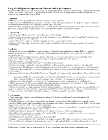 Rady dla inicjatorów śpiewu na śpiewankach i gitarzystów Zapiewajło! Od Ciebie w znacznej mierze zależy, czy płynąć będzie pieśń wspaniała, czy też rozlegać się będą dzikie wrzaski i żałosne zawodzenia. Dbaj więc o to, by śpiewanie (nawet na wesoło) stało na przyzwoitym poziomie muzycznym, nie przynoszącym wstydu kulturalnym ludziom. O gitarach • Publicznie przystoi grać jedynie na dobrych, dających się nastroić gitarach. • Gitara musi zawsze być idealnie nastrojona do kamertonu. Przy rozstrojonej gitarze nie da się śpiewać czysto. Strojąc nie do kamertonu utrudniasz śpiewanie i deformujesz słuch sobie i bliźniemu. • Śpiewanie idzie najlepiej, gdy gra się naraz tylko na jednej gitarze. Równoczesne granie na kilka gitar wychodzi z sensem tylko wtedy kiedy gitarzyści znają nawzajem swój sposób grania (a najlepiej jeśli razem ćwiczyli!). O obyczajach • Artyści są, jak wiadomo, narowiści. Ale trzeba z tym w sobie walczyć... • Gitarzysto! Nie zawłaszczaj imprezy dla siebie, daj też pograć innym. Jeśli będziesz grać "do upadłego", następni zrobią tak samo i już Cię do głosu nie dopuszczą. • Artysto! Uczestnicz w śpiewie nie tylko wtedy gdy sam grasz, wspomagaj też innych. • Gitarzysto! Nie bojkotuj gry innych i nie waż się im przeszkadzać (niestety, jest to proceder nagminny, ale okropnie niekulturalny)! O technice • Konieczne jest utrzymanie idealnego rytmu gry i śpiewu. Rytm nie może mieć żadnych wahań. Tylko z rytmicznie grającym gitarzystą śpiewa się łatwo i przyjemnie. Niedomagania rytmiczne bywają częstą przyczyną niepowodzeń w prowadzeniu śpiewu. • Zapiewajło musi śpiewać pewnie i nieco głośniej od innych. Akcenty muszą być zdecydowane, a dźwięki dobrze "postawione". Z gitarzystą, który pod nosem coś mruczy niepewnie, jest bardzo trudno śpiewać. • Wyraźnie zaznaczać trzeba także pauzy. • Śpiew prowadzącego musi być "stateczny", by łatwo było na nim podążyć. • Przy śpiewie na głosy ktoś musi wyraźnie prowadzić głos podstawowy. Zwykle jest to - niestety - rola zapiewajły. • Uwaga na tempo! Niemal wszyscy gitarzyści mają skłonności do zbyt szybkiej gry i do przyspieszania w trakcie piosenek. • Ważny jest wybór tonacji, tak by wszyscy mogli śpiewać (a więc nie powinno jej się dobierać jedynie wg głosu gitarzysty czy łatwości gry). • Znaczna część turystycznych "standardów" ma swoje "standardowe" tonacje, zwykle nieźle dobrane. Warto się ich trzymać, bo • grupie jest dużo łatwiej nauczyć się śpiewać (zwłaszcza na głosy) jeśli piosenka jest zawsze grana w tej samej tonacji; • gitara bardzo różnie brzmi w różnych tonacjach, rypiąc wszystko w C-durze gubimy istotę rzeczy. • Jeśli grupa umie śpiewać na głosy, to trzeba zwrócić uwagę na grane akordy: czy pasują one do układu głosów. • Póki nie grasz naprawdę dobrze, graj możliwie najprościej, ale czysto i rytmicznie. Nie warto grać w bardzo trudnych tonacjach bez wyraźnego uzasadnienia (na ogół lepiej użyć kapodastra). • Gdy już umiesz dużo, ucz się przygrywek. Ostatnio jakoś one zanikły, a wiele piosenek bez przygrywki traci charakter. Są przygrywki ogólnie znane (zwykle kalki z nagrań), dawniej były też "środowiskowe" - znane tylko w określonych kręgach. • Nie graj publicznie piosenek, których dobrze nie znasz. Niech lepiej zagra ktoś inny, a Ty posłuchaj. O repertuarze • Trzeba się raczej wystrzegać piosenek, które nie nadają się do śpiewu "ogniskowego", np. pieśni trudnych lub "zaangażowanych". • Piosenki mają wiele wersji. Godna polecenia jest wersja utarta w danym środowisku, niekoniecznie idealnie zgodna z oryginałem. Jednak należy tępić wersje całkowicie niezgodne z autorską albo muzycznie bezsensowne. Należy trzymać się za każdym razem tej samej wersji - ułatwi to śpiewanie grupie. • Większość śpiewanek powinny stanowić piosenki ogólnie znane i zgodne swym charakterem z rodzajem imprezy. Nowości należy wplatać co kilka "hitów", by grupa się nie nudziła. • Jeśli któryś z obecnych gitarzystów "specjalizuje się" w jakiejś piosence, to trzeba mu dać ją zagrać. • Pieśni elitarne albo o charakterze występów solowych (np. kabaretowe czy tzw. zaangażowane) stosowne są raczej na późniejszą porę i w bardzo ograniczonej dawce. • Piosenki śmieszne śmieszą tylko wtedy gdy są słyszane rzadko! • Wygłupy i wrzaski, zwłaszcza jeśli trwają długo, rozwalają imprezę i zwykle trudno jest wrócić do ładnego śpiewu. • Nie wszystkie pieśni nadają się do grupowego śpiewania. A w śpiewankach chodzi o wspólną zabawę, a nie o występy! Źródło: strona Tomasza Traczyka (traczyk.waw.pl). Więcej wskazówek: http://traczyk.waw.pl/lem/spiew.html