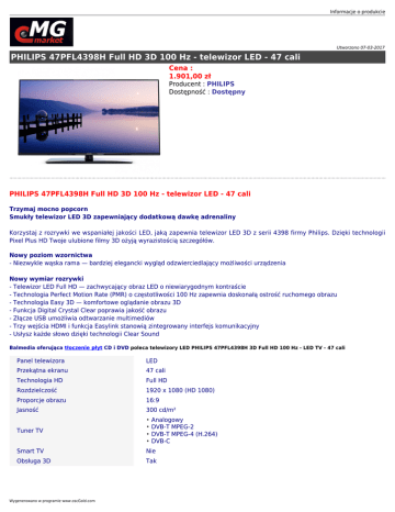Informacje o produkcie Utworzono 07-03-2017 PHILIPS 47PFL4398H Full HD 3D 100 Hz - telewizor LED - 47 cali Cena : 1.901,00 zł Producent : PHILIPS Dostępność : Dostępny PHILIPS 47PFL4398H Full HD 3D 100 Hz - telewizor LED - 47 cali Trzymaj mocno popcorn Smukły telewizor LED 3D zapewniający dodatkową dawkę adrenaliny Korzystaj z rozrywki we wspaniałej jakości LED, jaką zapewnia telewizor LED 3D z serii 4398 firmy Philips. Dzięki technologii Pixel Plus HD Twoje ulubione filmy 3D ożyją wyrazistością szczegółów. Nowy poziom wzornictwa - Niezwykle wąska rama — bardziej elegancki wygląd odzwierciedlający możliwości urządzenia Nowy wymiar rozrywki - Telewizor LED Full HD — zachwycający obraz LED o niewiarygodnym kontraście - Technologia Perfect Motion Rate (PMR) o częstotliwości 100 Hz zapewnia doskonałą ostrość ruchomego obrazu - Technologia Easy 3D — komfortowe oglądanie obrazu 3D - Funkcja Digital Crystal Clear poprawia jakość obrazu - Złącze USB umożliwia odtwarzanie multimediów - Trzy wejścia HDMI i funkcja Easylink stanowią zintegrowany interfejs komunikacyjny - Usłysz każde słowo dzięki technologii Clear Sound Balmedia oferująca tłoczenie płyt CD i DVD poleca telewizory LED PHILIPS 47PFL4398H 3D Full HD 100 Hz - LED TV - 47 cali Panel telewizora LED Przekątna ekranu 47 cali Technologia HD Full HD Rozdzielczość 1920 x 1080 (HD 1080) Proporcje obrazu 16:9 Jasność 300 cd/m² Tuner TV • Analogowy • DVB-T MPEG-2 • DVB-T MPEG-4 (H.264) • DVB-C Smart TV Nie Obsługa 3D Tak Wygenerowano w programie www.oscGold.com Technologie - LED - FullHD - 3D - Digital Crystal Clear - Perfect Motion Rate - Incredible Surround System dźwięku telewizora - Automatyczne ustawianie poziomu głośności - Wyraźne brzmienie - Incredible Surround - Regulacja tonów wysokich i niskich Moc głośników 16 W Telegazeta (pamięć) 1000 WiFi Nie Złącza HDMI 3 Złącza Component Brak Złącza SCART Tak Złącza S-Video Nie Złącza VGA Nie Pozostałe złącza we/wy telewizora LED PHILIPS 47PFL4398H - AV - USB - Antena IEC75 - Common Interface Plus (CI+) - Cyfrowe wyjście audio (optyczne) - Złącze usługi Standard VESA 400 x 200 Akcesoria w zestawie - Okulary 3D x 2 - Pilot zdalnego sterowania - Bateria AAA x 2 - Podstawa na biurko - Skrócona instrukcja obsługi - Broszura dot. kwestii prawnych i bezpieczeństwa - Broszura gwarancyjna - Instrukcja obsługi Wysokość 626 mm Wysokość z podstawą 681 mm Szerokość 1069 mm Głębokość 91 mm Głębokość z podstawą 270 mm Waga 11.4 kg Pozostałe parametry - Łatwa obsługa: Sterowanie jednym przyciskiem Home - Aktualizacje oprogramowania urządzenia: Aktualizowanie oprogramowania przez USB - Ustawienia formatu ekranu: 4:3, Automatyczne powiększenie, Format filmowy 16:9, Duże powiększenie, Nieskalowany, Panoramiczny - Odtwarzane formaty wideo: AVI, MKV, H264/MPEG-4 AVC, MPEG-1, MPEG-2, MPEG-4, WMV9/VC1 - Odtwarzane formaty muzyki: AAC, MP3, WMA (od wersji 2 do wersji 9.2) - Odtwarzane formaty obrazów: JPEG Gwarancja telewizora LED PHILIPS 47PFL4398H/12 - 24 miesiące.