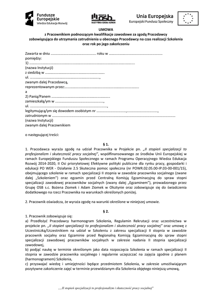 UMOWA z Pracownikiem podnoszącym kwalifikacje zawodowe za zgodą Pracodawcy zobowiązująca do utrzymania zatrudnienia u obecnego Pracodawcy na czas realizacji Szkolenia oraz rok po jego zakończeniu Zawarta w dniu .............................................. roku w ………………...................................... pomiędzy: 1) ……………………………………………………………………………………………..………. (nazwa Instytucji) z siedzibą w ………………………….……………………….……. ul. ………………………………………………………………….., zwanym dalej Pracodawcą, reprezentowanym przez:……………………………………………………………..……….. a 2) Panią/Panem ……………………………………………………….. zamieszkałą/ym w ................................................., ul. .............................................................................., legitymującą/ym się dowodem osobistym nr ..............................,..............................., zatrudnionym w ............................................................................................................................. (nazwa Instytucji) zwanym dalej Pracownikiem o następującej treści: § 1. 1. Pracodawca wyraża zgodę na udział Pracownika w Projekcie pn. „II stopień specjalizacji to profesjonalizm i skuteczność pracy socjalnej”, współfinansowanego ze środków Unii Europejskiej w ramach Europejskiego Funduszu Społecznego w ramach Programu Operacyjnego Wiedza Edukacja Rozwój 2014‐2020, II Osi priorytetowej Efektywne polityki publiczne dla rynku pracy, gospodarki i edukacji PO WER ‐ Działanie 2.5 Skuteczna pomoc społeczna (nr POWR.02.05.00-IP.03-00-001/15), obejmującego szkolenie w ramach specjalizacji II stopnia w zawodzie pracownika socjalnego (zwane dalej „Szkoleniem”) oraz egzamin przed Centralną Komisją Egzaminacyjną do spraw stopni specjalizacji zawodowej pracowników socjalnych (zwany dalej „Egzaminem”), prowadzonego przez Grupę OSB s.c. Bożena Ziomek i Adam Ziomek w Olsztynie oraz zobowiązuje się do świadczenia dodatkowego na rzecz Pracownika na warunkach określonych poniżej. 2. Pracownik oświadcza, że wyraża zgodę na warunki określone w niniejszej umowie. § 2. 1. Pracownik zobowiązuje się: a) Przedłożyć Pracodawcy harmonogram Szkolenia, Regulamin Rekrutacji oraz uczestnictwa w projekcie pn. „II stopień specjalizacji to profesjonalizm i skuteczność pracy socjalnej” oraz umowę z Uczestniczką/Uczestnikiem na udział w Szkoleniu z zakresu specjalizacji II stopnia w zawodzie pracownik socjalny oraz Egzaminie przed Regionalną Komisją Egzaminacyjną do spraw stopni specjalizacji zawodowej pracowników socjalnych w zakresie nadania II stopnia specjalizacji zawodowej, b) podjąć naukę w terminie określonym jako data rozpoczęcia Szkolenia w ramach specjalizacji II stopnia w zawodzie pracownika socjalnego i regularnie uczęszczać na zajęcia zgodnie z planem (harmonogramem) Szkolenia, c) przyswajać wiedzę i umiejętności będące przedmiotem Szkolenia, w zakresie umożliwiającym pozytywne zakończenie zajęć w terminie przewidzianym dla Szkolenia objętego niniejszą umową, „„II stopień specjalizacji to profesjonalizm i skuteczność pracy socjalnej” d) przedłożyć zaświadczenie poświadczającego ukończenie Szkolenia w ramach specjalizacji II stopnia w zawodzie pracownika socjalnego, e) przystąpić do Egzaminu na II stopień specjalizacji w zawodzie pracownik socjalny przed Centralną Komisją Egzaminacyjną do spraw stopni specjalizacji zawodowej pracowników socjalnych, f) przedłożyć dyplom potwierdzający uzyskanie II stopnia specjalizacji zawodowej pracowników socjalnych, 2. W każdym przypadku Pracownik jest zobowiązany do przedłożenia pisemnej informacji dotyczącej rezultatów udziału w Szkoleniu zgodnie z wymogami określonymi w Regulaminie Rekrutacji oraz uczestnictwa w projekcie pn. „II stopień specjalizacji to profesjonalizm i skuteczność pracy socjalnej” . 3. Pracownik zobowiązuje się do utrzymania zatrudnienia u Pracodawcy na czas realizacji Szkolenia oraz rok po jego zakończeniu. § 3. 1. Pracodawca zobowiązuje się do zwolnienia Pracownika z całości lub części dnia pracy, na czas niezbędny do punktualnego przybycia na zajęcia oraz udział w zajęciach w ramach Szkolenia. 2. Pracodawca zobowiązuje się do udzielenia 6 dniowego urlopu szkoleniowego przeznaczonego na przygotowanie się i przystąpienie do Egzaminu na II stopień specjalizacji w zawodzie pracownik socjalny przed Regionalną Komisją Egzaminacyjną do spraw stopni specjalizacji zawodowej pracowników socjalnych, zgodnie z przepisami ustawy z dnia 12 marca 2004 r. o pomocy społecznej (t.j.: Dz. U. z 2015 r. poz. 163 z późn. zm.) oraz rozporządzenia Ministra Pracy i Polityki Społecznej z dnia 17 kwietnia 2012 r. w sprawie specjalizacji w zawodzie pracownik socjalny (Dz. U. z 2012 r. poz. 486). 3. Za czas urlopu szkoleniowego oraz za czas zwolnienia z całości lub części dnia pracy pracownik zachowuje prawo do wynagrodzenia. § 4. 1. Jeżeli w trakcie trwania Szkolenia Pracownik bez uzasadnionych przyczyn nie podejmie podnoszenia kwalifikacji zawodowych albo przerwie podnoszenie tych kwalifikacji w ramach Szkolenia jest zobowiązany do zwrotu kosztów poniesionych przez Pracodawcę z tytułu dodatkowych świadczeń na ten cel za okres do momentu uzyskania przez Pracodawcę wiedzy o zaniechaniu lub przerwaniu podnoszenia kwalifikacji przez Pracownika. Za przerwanie podnoszenia kwalifikacji zawodowych uznaje się również nieprzystąpienie Pracownika do Egzaminu lub innej formy zaliczenia zajęć przewidzianej w programie Szkolenia. 2. Jeżeli Pracownik w czasie trwania szkolenia oraz w terminie określonym w umowie w § 2 ust. 3 rozwiąże stosunek pracy za wypowiedzeniem, z wy