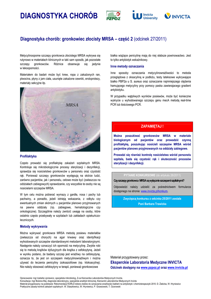 DIAGNOSTYKA CHORÓB Diagnostyka chorób: gronkowiec złocisty MRSA – część 2 (odcinek 27/2011) Metycylinooporne szczepy gronkowca złocistego MRSA wykrywa się rutynowo w materiałach klinicznych w taki sam sposób, jak pozostałe szczepy gronkowców. RóŜnice obserwuje się jedynie w lekooporności. białka wiąŜące penicylinę mają do niej słabsze powinowactwo. Jest to tylko antybiotyk wskaźnikowy. Materiałem do badań moŜe być krew, ropa z zakaŜonych ran, plwocina, płyny z jam ciała, usunięte zakaŜone cewniki, endoprotezy, materiały sekcyjne itp. Inne sposoby oznaczania metycylinowraŜliwości to metoda przeglądowa z oksacyliną w podłoŜu, testy lateksowe wykrywające białko PBP2a u S. aureus oraz oznaczanie najmniejszego stęŜenia hamującego metycyliny przy pomocy paska zawierajacego gradient antybiotyku. Inne metody oznaczania W przypadku wątpliwych wyników posiewów, moŜe być konieczne wykrycie u wyhodowanego szczepu genu mecA metodą real-time PCR lub ilościowego PCR. ZAPAMIĘTAJ ! MoŜna poszukiwać gronkowców MRSA w materiale biologicznym od pacjentów oraz prowadzić czynną profilaktykę, poszukując nosicieli szczepów MRSA wśród pacjentów planowo przyjmowanych na oddziały zabiegowe. Profilaktyka Często prowadzi się profilaktykę zakaŜeń szpitalnych MRSA. Kontroluje się mikrobiologicznie procesy sterylizacji i dezynfekcji, sprawdza się nosicielstwo gronkowców u personelu oraz czystość rąk. PoniewaŜ szczepy gronkowców występują na skórze ludzi, zarówno pacjentów, jak i personelu, celowe moŜe być (zwłaszcza na oddziałach zabiegowych) sprawdzanie, czy wszystkie te osoby nie są nosicielami szczepów MRSA. W tym celu moŜna pobierać wymazy z gardła, nosa i pachy lub pachwiny, a ponadto, jeŜeli istnieją wskazania, z odbytu czy ewentualnych zmian skórnych u pacjentów planowo przyjmowanych na pewne oddziały (np. zabiegowe, hematologiczne czy onkologiczne). Szczególnie naleŜy zwrócić uwagę na osoby, które ostatnio często przebywały w szpitalach lub zakładach opiekuńczoleczniczych. Prowadzi się równieŜ kontrolę nosicielstwa wśród personelu szpitala, bada się czystość rąk i skuteczność procesów sterylizacji i dezynfekcji. PYTANIE KONKURSOWE (do artykułu 26/2011) Czy szczepy gronkowca MRSA są wyłącznie szczepami szpitalnymi? Odpowiedzi naleŜy udzielić za pośrednictwem formularza dostępnego na stronie: www.invicta.pl/konkurs. Zwycięzcą konkursu z odcinka 25/2011 została Pani Barbara Trawicka Metody wykrywania MoŜna wykrywać gronkowce MRSA metodą posiewu materiałów (zwłaszcza od chorych) na agar krwawy oraz identyfikacji wyhodowanych szczepów standardowymi metodami laboratoryjnymi. Następnie naleŜy oznaczyć ich oporność na metycylinę. Zwykle robi się to metodą krąŜków dyfuzyjnych dla krąŜka z cefoksytyną. JeŜeli w wyniku podano, Ŝe badany szczep jest wraŜliwy na cefoksytynę, oznacza to, Ŝe jest on szczepem metycylinowraŜliwym i moŜna uŜywać do leczenia penicyliny izoksazolilowe (np. kloksacylinę). Nie naleŜy stosować cefoksytyny w terapii, poniewaŜ gronkowcowe Materiał przygotowany przez: Eksperckie Laboratoria Medyczne INVICTA Odcinek dostępny na www.pzpoz.pl oraz www.invicta.pl Opracowanie: mgr Izabella Lipniewicz, specjalista mikrobiolog, Z-ca Kierownika Laboratoriów Medycznych Invicta. Konsultacja: mgr BoŜena Maj, diagnosta laboratoryjny, specjalista analityki klinicznej, Kierownik Laboratoriów Medycznych Invicta Materiał przygotowany na podstawie: Rekomendacji KORLD doboru testów do oznaczania wraŜliwości bakterii na antybiotyki i chemioterapeutyki 2010. D. śabicka, W. Hryniewicz Praktyczne zasady kontroli zakaŜeń szpitalnych. W. Staszkiewicz, W. Hryniewicz, P. Grzesiowski, T. Ozorowski