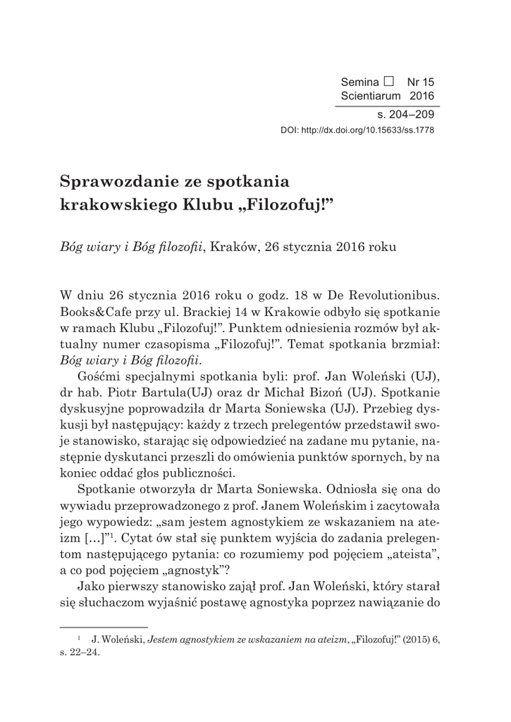 Semina Nr 15 Scientiarum 2016 s. 204–209 DOI: http://dx.doi.org/10.15633/ss.1778 Marta Węgrzyn Sprawozdanie ze spotkania krakowskiego Klubu „Filozofuj!” Bóg wiary i Bóg filozofii, Kraków, 26 stycznia 2016 roku W dniu 26 stycznia 2016 roku o godz. 18 w De Revolutionibus. Books&Cafe przy ul. Brackiej 14 w Krakowie odbyło się spotkanie w ramach Klubu „Filozofuj!”. Punktem odniesienia rozmów był aktualny numer czasopisma „Filozofuj!”. Temat spotkania brzmiał: Bóg wiary i Bóg filozofii. Gośćmi specjalnymi spotkania byli: prof. Jan Woleński (UJ), dr hab. Piotr Bartula(UJ) oraz dr Michał Bizoń (UJ). Spotkanie dyskusyjne poprowadziła dr Marta Soniewska (UJ). Przebieg dyskusji był następujący: każdy z trzech prelegentów przedstawił swoje stanowisko, starając się odpowiedzieć na zadane mu pytanie, następnie dyskutanci przeszli do omówienia punktów spornych, by na koniec oddać głos publiczności. Spotkanie otworzyła dr Marta Soniewska. Odniosła się ona do wywiadu przeprowadzonego z prof. Janem Woleńskim i zacytowała jego wypowiedz: „sam jestem agnostykiem ze wskazaniem na ateizm […]”1. Cytat ów stał się punktem wyjścia do zadania prelegentom następującego pytania: co rozumiemy pod pojęciem „ateista”, a co pod pojęciem „agnostyk”? Jako pierwszy stanowisko zajął prof. Jan Woleński, który starał się słuchaczom wyjaśnić postawę agnostyka poprzez nawiązanie do 1 J. Woleński, Jestem agnostykiem ze wskazaniem na ateizm, „Filozofuj!” (2015) 6, s. 22–24. Sprawozdanie ze spotkania krakowskiego Klubu „Filozofuj!” 205 kantowskich rzeczy samych w sobie. Zdaniem Immanuela Kanta rzeczy same w sobie oznaczają sferę bytu, która istnieje niezależnie od świadomości poznającego podmiotu. Oznacza ona rzeczywistość, o której nic nie wiemy i nic wiedzieć nie możemy. Podobnie jest – zdaniem prelegenta – w przypadku agnostyka, z tym że Bóg nie tylko przekracza nasze zdolności poznawcze, ale również nie może być obiektem naszej wiedzy. Wiara w istnienie Boga nie jest przedmiotem wiedzy w sensie naukowym. Filozofia i teologia znają wiele dowodów na istnienie Boga. Różne rodzaje rozumowania i argumentacji służyły uzasadnieniu twierdzenia o jego realnym istnieniu. Zdaniem prof. Jana Woleńskiego dowody te są albo naiwne, albo wadliwe. Podany został przykład dróg św. Tomasza, które według prelegenta w istocie są sylogizmami. Język teologiczny nie przystaje do języka naukowego. Profesor zawiesza sąd w kwestii istnienia Boga. Uważa, że nie ma poprawnego dedukcyjnego dowodu na istnienie Boga, a co więcej, zdaniem prelegenta brak empirycznych świadectw za jego egzystencją. Zdanie agnostyka: „nie wiem, czy Bóg istnieje, i nie wiem, czy Bóg nie istnieje” jest według profesora poglądem czysto negatywnym. Z kolei zdanie teisty: „wiem, że Bóg istnieje” jest zdaniem logicznie niepoprawnym, bowiem nie mamy tutaj przedmiotu naszej wiedzy. Prelegent dodaje, że teista może bronić swojego poglądu, jak to w rozmowie z nim uczynił jeden z jezuitów, mówiąc, że to akt wiary konstytuuje swój przedmiot. Następnie prof. Jan Woleński, kontynuując temat ateizmu, powołał się na statystyki, które wskazują, że wśród naukowców, w tym głównie przyrodoznawców, większość deklaruje się jako osoby niewierzące. Z kolei wśród naukowców, którzy uważają się za osoby wierzące, występuje konflikt między wiarą a praktyką. Profesor skupił się również na omówieniu roli religii w życiu społecznym. Jego zdaniem religia odegrała doniosłą rolę w rozwoju cywilizacji. Stała się zjawiskiem społecznym, psychologicznym i obyczajowym. Profesor dodaje również, że możemy spotkać się z różnymi ocenami religii, ale w gruncie rzeczy nie mamy apriorycznej racji do jej oceny. Po wypowiedzi prof. Jana Woleńskiego prowadząca spotkanie przywołała postać Georges’a Bataille’a i jego hasło „religii bez Boga” 206 Marta Węgrzyn czy też „religijnego ateizmu”, gdzie postawa religijna przejawia się między innymi poprzez zachwyt nad pięknem wszechświata. Doktor Marta Soniewska zadała prof. Janowi Woleńskiemu pytanie: czy przypisywanie wszechświatowi pewnych wartości jest postawą religijną i czy taka postawa jest według profesora do przyjęcia? Prelegent, próbując odpowiedzieć na pytanie, odwołał się do polskiego filozofa Mariana Przełęckiego, który zasadniczo głosił podobne tezy, ale pod hasłem „chrześcijaństwa bez Boga”. Dla prof. Jana Woleńskiego takie wyrażenia są grą słów. Wszechświatem można się zachwycać z różnych powodów – nie tylko religijnych, ale także estetycznych. Zdaniem autora Granic niewiary oksymorony te wynikają być może z potrzeby jakiegoś kompromisu, nie są one jednak dla niego wyrażeniami intelektualnie atrakcyjnymi. Następnie głos w dyskusji zabrał dr hab. Piotr Bartula, który zgodził się z wygłoszonymi przez wcześniejszego prelegenta tezami. Na pytanie, czym jest agnostycyzm, a czym ateizm i po której stronie sytuują się jego poglądy, odpowiedział, że jest ignorantem z odchyleniem mistycznym. Bartula w kontekście wcześniejszej rozmowy o „religijnym ateizmie” przywołał postać Simone Weil. Jego zdaniem ta francuska filozof jest ateistyczną duchowością, która odrzuca społeczne funkcje religii. Prelegent wyznał, że czuje się w pewnym sensie ateistą, któremu Bóg przymusowo towarzyszy od dziecka. Jego zdaniem religia zależy od urodzenia, a zatem od rodziny, w której się wychowujemy, oraz od miejsca, w którym mieszkamy. Prelegent powołał się na prof. Ireneusza Ziemińskiego, piszącego o przedfilozoficznych decyzjach i o uległości wobec wzorów kulturowych. Przeszedł w tym miejscu do kwestii winy, a ściślej do ujęcia człowieka jako „inkubatora winy”. Wyraził zdanie, że winę wszczepia w nas religia, a poczucie winy przynosi negatywne skutki dla 