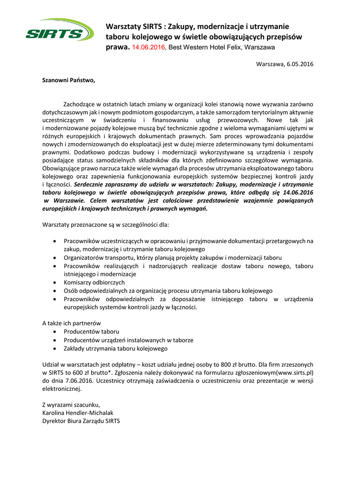 Warsztaty SIRTS : Zakupy, modernizacje i utrzymanie taboru kolejowego w świetle obowiązujących przepisów prawa. 14.06.2016, Best Western Hotel Felix, Warszawa Warszawa, 6.05.2016 Szanowni Państwo, Zachodzące w ostatnich latach zmiany w organizacji kolei stanowią nowe wyzwania zarówno dotychczasowym jak i nowym podmiotom gospodarczym, a także samorządom terytorialnym aktywnie uczestniczącym w świadczeniu i finansowaniu usług przewozowych. Nowe tak jak i modernizowane pojazdy kolejowe muszą być technicznie zgodne z wieloma wymaganiami ujętymi w różnych europejskich i krajowych dokumentach prawnych. Sam proces wprowadzania pojazdów nowych i zmodernizowanych do eksploatacji jest w dużej mierze zdeterminowany tymi dokumentami prawnymi. Dodatkowo podczas budowy i modernizacji wykorzystywane są urządzenia i zespoły posiadające status samodzielnych składników dla których zdefiniowano szczegółowe wymagania. Obowiązujące prawo narzuca także wiele wymagań dla procesów utrzymania eksploatowanego taboru kolejowego oraz zapewnienia funkcjonowania europejskich systemów bezpiecznej kontroli jazdy i łączności. Serdecznie zapraszamy do udziału w warsztatach: Zakupy, modernizacje i utrzymanie taboru kolejowego w świetle obowiązujących przepisów prawa, które odbędą się 14.06.2016 w Warszawie. Celem warsztatów jest całościowe przedstawienie wzajemnie powiązanych europejskich i krajowych technicznych i prawnych wymagań. Warsztaty przeznaczone są w szczególności dla: Pracowników uczestniczących w opracowaniu i przyjmowanie dokumentacji przetargowych na zakup, modernizację i utrzymanie taboru kolejowego Organizatorów transportu, którzy planują projekty zakupów i modernizacji taboru Pracowników realizujących i nadzorujących realizacje dostaw taboru nowego, taboru istniejącego i modernizacje Komisarzy odbiorczych Osób odpowiedzialnych za organizację procesu utrzymania taboru kolejowego Pracowników odpowiedzialnych za doposażanie istniejącego taboru w urządzenia europejskich systemów kontroli jazdy w łączności. A także ich partnerów Producentów taboru Producentów urządzeń instalowanych w taborze Zakłady utrzymania taboru kolejowego Udział w warsztatach jest odpłatny – koszt udziału jednej osoby to 800 zł brutto. Dla firm zrzeszonych w SIRTS to 600 zł brutto*. Zgłoszenia należy dokonywać na formularzu zgłoszeniowym(www.sirts.pl) do dnia 7.06.2016. Uczestnicy otrzymają zaświadczenia o uczestniczeniu oraz prezentacje w wersji elektronicznej. Z wyrazami szacunku, Karolina Hendler-Michalak Dyrektor Biura Zarządu SIRTS Warsztaty SIRTS : Zakupy, modernizacje i utrzymanie taboru kolejowego w świetle obowiązujących przepisów prawa. 14.06.2016, Best Western Hotel Felix, Warszawa Program: 10:00 Rozpoczęcie warsztatów, Sesja I 1. Wprowadzenie do zagadnień interoperacyjności kolei. Marek Pawlik, Instytut Kolejnictwa /potwierdzone 2. Wymagania prawne w zakresie wprowadzania do eksploatacji pojazdów kolejowych z uwzględnieniem zagadnień od momentu podpisania umowy do wprowadzania pojazdu do eksploatacji. Marek Pawlik, Instytut Kolejnictwa/potwierdzone 3. Standardy techniczne i wymagania interoperacyjności w specyfikacjach na zakup taboru kolejowego. Jan Raczyński, Instytut Kolejnictwa /potwierdzone Dyskusja 12:00 – 12:20 Przerwa kawowa 12:20 Sesja II 4. Zasady sporządzania studiów wykonalności na zakup taboru kolejowego. Tadeusz Dyr, Uniwersytet Technologiczno-Humanistyczny im. Kazimierza Pułaskiego w Radomiu/ potwierdzone 5. Wymagania techniczne dla podzespołów taboru kolejowego przy jego budowie, utrzymaniu i naprawach. Instytut Pojazdów Szynowych Tabor/potwierdzone 6. Składniki interoperacyjności w taborze kolejowym – wprowadzenie do obrotu. Instytut Pojazdów Szynowych Tabor /potwierdzone Dyskusja 14:15 – 15:00 Obiad 15:00 Sesja III 7. Uwarunkowania dla organizacji procesu utrzymania taboru kolejowego. Stan obecny i planowane nowe regulacje prawne. Jan Raczyński, Instytut Kolejnictwa/potwierdzone 8. Wymagania techniczne w zakresie wyposażania pojazdów trakcyjnych w system ETCS I GSM-R. Marek Pawlik, Instytut Kolejnictwa/potwierdzone 9. Wymagania w zakresie ochrony środowiska w specyfikacjach na zakup i modernizację taboru kolejowego. Jan Raczyński, Instytut Kolejnictwa /potwierdzone Dyskusja 16:45 Zakończenie warsztatów, rozdanie prezentacji w wersji elektronicznej, rozdanie zaświadczeń o uczestniczeniu. Warsztaty SIRTS : Zakupy, modernizacje i utrzymanie taboru kolejowego w świetle obowiązujących przepisów prawa. 14.06.2016, Best Western Hotel Felix, Warszawa Formularz zgłoszeniowy Prosimy o przesłanie wypełnionego formularza do Biura Zarządu SIRTS e-mailem [email protected] lub faxem na numer + 48 22 473 15 02 do 7.06.2016r. Dane uczestnika Nazwisko Imiona E-mail Tel. bezp. Stanowisko służbowe Tel. kom. Dane uczestnika Nazwisko Imiona E-mail Tel. bezp. Stanowisko służbowe Tel. kom. Dane przedsiębiorstwa do wystawienia faktury: Nazwa Ulica Nr Kod pocztowy Miejscowość Telefon E-mail NIP Warunki zapłaty Opłata za uczestnictwo jednej osoby wynosi 800,00 PLN brutto dla firm niezrzeszonych w SIRTS, 600 zł brutto dla członków wspierających*. Zobowiązanie zakładu pracy do pokrycia kosztów udziału w warsztatach Kwotę w wysokości PLN słownie przekażemy na rachunek bankowy Stowarzyszenia SIRTS 14 czerwca 2016 nr 14 2130 0004 2001 0377 5608 0001 w Volkswagen Bank Polska do dnia Tytuł wpłaty: udział w warsztatach 14.06.2016, nazwisko uczestnika + nazwa firmy Wyrażam zgodę na przetwarzanie moich danych osobowych podanych w formularzu zgłoszeniowym przez Stowarzyszenie na rzecz Interoperacyjności i Rozwoju Transportu Szynowego, zgodnie z ustawą z dnia 29.08.1997 r. o ochronie danych osobowych (Dz. U. z 2002 r. Nr 101, poz. 926 z późn. zm.). Wyrażam zgodę na otrzymywanie od Stowarzyszenia na rzecz Interoperacyjności i Rozwoju Transportu Szynowego korespondencji dro