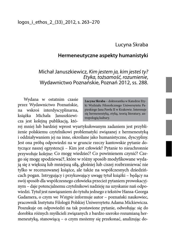 logos_i_ethos_2_(33)_2012, s. 263–270 Lucyna Skraba Hermeneutyczne aspekty humanistyki Michał Januszkiewicz, Kim jestem ja, kim jesteś ty? Etyka, tożsamość, rozumienie, Wydawnictwo Poznańskie, Poznań 2012, ss. 288. Wydana w ostatnim czasie Lucyna Skraba – doktorantka w Katedrze Etyprzez Wydawnictwo Poznańskie, ki Wydziału Filozoficznego Uniwersytetu Pana wskroś interdyscyplinarna, pieskiego Jana Pawła II w Krakowie. Interesuje hermeneutyką, etyką, teorią literatury, anksiążka Michała Januszkiewi- się tropologią kultury. cza jest kolejną publikacją, której mniej lub bardziej wprost wyartykułowanym zadaniem jest przybliżenie polskiemu czytelnikowi problematyki związanej z hermeneutyką i oddziaływaniem jej na inne, określane jako humanistyczne, dyscypliny. Jest ona próbą odpowiedzi na w gruncie rzeczy kantowskie pytanie dotyczące naszej egzystencji – Kim jest człowiek? Pytanie to nieuchronnie przywołuje kolejne: Co mogę wiedzieć? Co powinienem czynić? Czego się mogę spodziewać?, które w różny sposób modyfikowane wydają się z większą lub mniejszą siłą, głośniej lub ciszej rozbrzmiewać nie tylko w recenzowanej książce, ale także na współczesnych dziedzińcach pogan. Intrygujący i przykuwający uwagę tytuł książki – będący na swój sposób dla współczesnego człowieka przecież pytaniem prowokacyjnym – daje potencjalnemu czytelnikowi nadzieję na uzyskanie nań odpowiedzi. Tytuł jest nawiązaniem do tytułu jednego z tekstów Hansa-Georga Gadamera, o czym we Wstępie informuje autor – poznański naukowiec, pracownik Instytutu Filologii Polskiej Uniwersytetu Adama Mickiewicza. Poszukuje on odpowiedzi na tak postawione pytanie, odwołując się do dorobku różnych myślicieli związanych z bardzo szeroko rozumianą hermeneutyką, stanowiącą – o czym możemy się przekonać, analizując do- 264 Lucyna Skraba robek naukowy Januszkiewicza – od wielu lat jego pole badawcze. Książka, której pełny tytuł brzmi: Kim jestem ja, kim jesteś ty? Etyka, tożsamość, rozumienie, składa się z XV rozdziałów, przyporządkowanych (odnosi się w trakcie lektury wrażenie, że arbitralnie) do jednej z trzech części: W stronę hermeneutyki, W stronę antropologii i religii, Tożsamość i etyka, na które została podzielona publikacja. Niektóre z tekstów – takie informacje możemy znaleźć w Nocie edytorskiej – znane są czytelnikom z innych publikacji. Patrząc z perspektywy czytelnika, który niekoniecznie może mieć wiedzę na temat hermeneutyki, niezwykle ważny dla rozumienia i ukierunkowania interpretacji całej, w sumie obszernej i wewnętrznie zróżnicowanej, publikacji jest wspomniany wyżej Wstęp, który mógłby stanowić osobny rozdział książki. Autor tłumaczy w nim zarówno tytuł swojej książki, której problematyka hermeneutyczna rozwijana jest w horyzontach etyki, tożsamości i rozumienia (zob. s. 9), mimo że wewnętrznego podziału na owe części dokonuje, jak się zdaje, według innego kryterium. We Wstępie przywołuje najważniejsze założenia filozofii Heideggera, Gadamera czy Ricoeura, których niezwykle istotny wpływ na oblicze współczesnej (również ponowoczesnej) hermeneutyki trudno zakwestionować. Januszkiewicz formułuje na początku niezwykle interesującą tezę mówiącą, że „charakter nowoczesnej i późnonowoczesnej hermeneutyki przyjmuje postać trójkąta hermeneutycznego, na który składają się trzy wymienione problemy” (tamże), zaś związki i zależności między bokami, którego podstawą jest rozumienie, dostrzega w filozofii wspomnianych myślicieli. Dodaje dalej, iż: Metafora trójkąta hermeneutycznego pokazuje zarazem uniwersalność problemu hermeneutycznego, który opisywać możemy na gruncie trzech fundamentalnych zwrotów w humanistyce nowoczesnej: zwrotu lingwistycznego (jeżeli przyjąć za Gadamerem, że rozumienie dokonuje się w horyzoncie tego, co językowe), zwrotu etycznego i zwrotu narratywistycznego (tożsamość). Innymi słowy: współczesna humanistyka okazuje się nieuchronnie hermeneutyką (s. 9–10). Wymienieni myśliciele nie są oczywiście jedynymi, których refleksja filozoficzna czy też literaturoznawcza (autor wielokrotnie odnosi się do Hermeneutyczne aspekty humanistyki 265 wyników badań Michała P. Markowskiego) jest przywoływana na kolejnych kartach książki. Oprócz wspomnianych filozofów, innymi, do których w taki czy inny sposób odwołuje się autor w swojej książce, są: Platon, F. D. Schleiermacher, W. Dilthey, F. Nietzsche, J. Derrida, J. D. Caputo, R. Rorty czy G. Vattimo. Przyjrzyjmy się więc kolejno rozdziałom, których adresatami naprzemiennie będę zarówno filozofowie, może nie tylko ci zainteresowani hermeneutyką, kulturoznawcy, jak i wszyscy ci, którzy chcą dotrzeć do sensu, który skrywa literatura. Pierwszą część książki rozpoczyna opublikowany kilka lat temu na łamach miesięcznika „Znak” artykuł Czy mamy dziś kryzys humanistyki?. Tekst, jak się wydaje, w dalszym ciągu aktualny i domagający się odpowiedzi na postawione w tytule pytanie. Autor zastanawia się w nim nad wymiarami tego kryzysu, skupiając się przede wszystkim w swoich analizach na perspektywie teoretycznej i wskazując za Rortym na literacki wymiar humanistyki. Rozważaniom tym towarzyszą uwagi dotyczące treści książki J. M. Elliasa Literature Lost: Social Agendas and Corruption of the Humanistes, w której amerykański teoretyk literatury krytykuje ponowoczesną i zorientowaną literaturoznawczo humanistykę. Januszkiewicz przypomina współczesnemu człowiekowi, że „tylko humanistyka potrafi podjąć debatę nad pytaniami zasadniczymi: Kim jesteśmy? Co mamy począć z naszym życiem? Czy istnieją granice ludzkiej ingerencji w świat natury?” (s. 25). Humanistyka jest, jak się okazuje, niezbędna, ponieważ – jak dodaje dalej poznański teoretyk literatury – „z jednej str