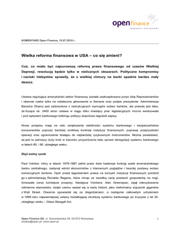 KOMENTARZ Open Finance, 15.07.2010 r. Wielka reforma finansowa w USA – co się zmieni? Coś, co miało być najsurowszą reformą prawa finansowego od czasów Wielkiej Depresji, rewolucją będzie tylko w nielicznych obszarach. Polityczne kompromisy i naciski lobbystów sprawiły, że z wielkiej chmury na banki spadnie bardzo mały deszcz. Ustawa regulująca amerykański sektor finansowy została zaakceptowana przez Izbę Reprezentantów i obecnie czeka tylko na ostateczne głosowanie w Senacie oraz podpis prezydenta. Administracja Baracka Obamy jest zadowolona z restrykcyjnych wymogów wobec banków, ale prawda jest taka, że licząca ok. 2400 stron ustawa w ciągu kilku miesięcy prac legislacyjnych mocno ewoluowała i pod wpływem bankowego lobbingu politycy stopniowo łagodzili zapisy. Nowe przepisy mają na celu zwiększenie stabilności systemu bankowego i bezpieczeństwa konsumentów poprzez bardziej wnikliwą kontrolę instytucji finansowych, poprawę przejrzystości operacji oraz ograniczenie dostępu do najbardziej ryzykownych instrumentów. Można powiedzieć, że jest to pierwszy duży krok w kierunku przywrócenia ładu sprzed deregulacji systemu bankowego w latach 80. i 90. ubiegłego wieku. Zbyt wolny rynek Paul Volcker, który w latach 1979-1987 pełnił przez dwie kadencje funkcję szefa amerykańskiego banku centralnego, zasłynął wśród ekonomistów z klarownych poglądów i twardej postawy wobec komercyjnych banków. Opór przed łagodzeniem prawa na korzyść instytucji finansowych poróżnił go z administracją Ronalda Regana, która chcąc za wszelką cenę postawić gospodarkę na nogi, forsowała coraz luźniejsze przepisy. Następca Volckera, Alan Greenspan, zajął zdecydowanie odmienne stanowisko, dzięki czemu wpisał się w karty historii, jako nieformalny sojusznik gigantów z Wall Street. Otwarcie opowiadał się za złagodzeniem, a następnie całkowitym uchyleniem w 1999 roku najważniejszej ustawy kształtującej strukturę systemu bankowego po kryzysie z lat 30. ubiegłego wieku – Glass Steagall Act. Open Finance SA ul. Domaniewska 39, 02-672 Warszawa [email protected], www.open.pl 1 Na mocy Glass Steagall Act, w 1933 roku, w celu ograniczenia spekulacji na rynkach finansowych, grubą kreską oddzielono klasyczne banki przyjmujące od klientów pieniądze na lokaty i udzielające kredytów od banków inwestycyjnych, które zajmowały się bardziej ryzykownymi operacjami. Uchylenie Glass Steagall Act za rządów Billa Clintona było jedną z przyczyn obecnego kryzysu finansowego, ponieważ w praktyce umożliwiło gigantom takim, jak np. Citigroup, który w 1999 roku był największym bankiem w USA, podejmowanie nadmiernego ryzyka. Jak okazało się później, instytucje finansowe wykorzystywały wszelkie możliwe sposoby, aby w krótkim terminie pomnożyć zyski (np. poprzez emitowanie i handlowanie instrumentami opartymi o kredyty hipoteczne, tworzenie z nich trudnych do przeanalizowania produktów w postaci instrumentów CDO, które następnie trafiały do tzw. podmiotów specjalnego przeznaczenia zależnych od banku), a to przeważnie stało w sprzeczności z interesami klientów. Doprowadziło to do powstania tak skomplikowanych zależności między bankami, firmami ubezpieczeniowymi, funduszami emerytalnymi i funduszami hedgingowymi, że gdy pękła bańka na rynku kredytów, cały system finansowy runął w gruzach. Najnowsze zmiany w prawie mają zapobiec powtórzeniu podobnej sytuacji w przyszłości. Prześledźmy więc najważniejsze reformy. Reguła Volckera Kiedy na początku 2009 roku Barack Obama zaprosił Paula Volckera do grona swoich doradców ekonomicznych, były szef Fed zaproponował uporządkowanie chaosu panującego wówczas na Wall Street, przedstawiając pakiet regulacji, określany jako Reguła Volckera (Volcker’s Rule). Zaproponował m.in., by całkowicie zabronić bankom inwestowania własnych środków w fundusze hedgingowe i private equity (co obecnie jest na Wall Street na porządku dziennym) oraz ograniczyć możliwości aktywnego tradingu (krótkoterminowej spekulacji, dokonywanej głównie przez automaty oparte na algorytmach wykorzystujących nieefektywność rynków), ponieważ nie leży to w interesie klientów powierzających bankom pieniądze w formie depozytów. W toku prac nad reformą systemu finansowego, Reguła Volckera była stopniowo modyfikowana i jej ostateczna forma, według samego pomysłodawcy, zasługuje w szkolnej skali co najwyżej na słabą czwórkę. Oto najważniejsze postanowienia Reguły Volckera: • banki mogą inwestować w fundusze hedgingowe i private equity maksymalnie do 3 proc. kapitałów własnych (mierzonych wskaźnikiem Tier1); • bank nie może kontrolować więcej niż 3 proc. jednostek udziałowych danego funduszu; • banki nie mogą być powiązane kapitałowo z funduszami, w które lokują środki, ani poręczać ich zobowiązań; Open Finance SA ul. Domaniewska 39, 02-672 Warszawa [email protected], www.open.pl 2 • zakaz zawierania transakcji stwarzających „istotny konflikt interesu” pomiędzy bankiem a jego klientami; • zakaz zawierania transakcji skutkujących bezpośrednim lub pośrednim „istotnym wzrostem ekspozycji na ryzykowne aktywa lub ryzykowne strategie inwestycyjne”; • zakaz zawierania transakcji zagrażających bezpieczeństwu banku i finansowej stabilności Stanów Zjednoczonych. Ekspozycja wybranych banków na fundusze hedgingowe i private equity (w mld USD) Wells Fargo 98 Maksymalna dopuszczalna ekspozycja wg Reguły Volckera* 2,9 6,4 2,2 Bank of America 155 4,7 9,1 2,0 JPMorgan Chase 131 3,9 7,3 1,9 Citigroup 120 3,6 1,4 0,4 Kapitał własny (Tier1) Bank Obecna ekspozycja** Stosunek obecnej ekspozycji do dopuszczalnej wg Reguły Volckera *3 proc. kapitału własnego; ** ujawnione inwestycje w fundusze hedgingowe i private equity. Źródło. Goldman Sachs Research. Postanowienia o konflikcie interesu i ryzykownych aktywach pozostawiają
