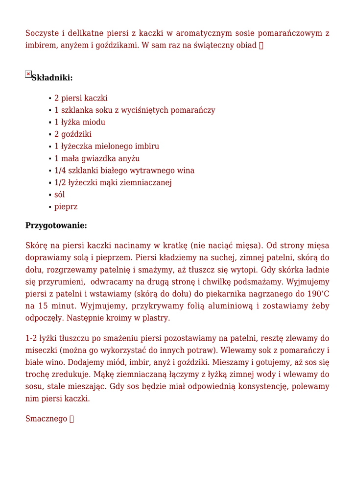 Soczyste i delikatne piersi z kaczki w aromatycznym sosie pomarańczowym z imbirem, anyżem i goździkami. W sam raz na świąteczny obiad Składniki: 2 piersi kaczki 1 szklanka soku z wyciśniętych pomarańczy 1 łyżka miodu 2 goździki 1 łyżeczka mielonego imbiru 1 mała gwiazdka anyżu 1/4 szklanki białego wytrawnego wina 1/2 łyżeczki mąki ziemniaczanej sól pieprz Przygotowanie: Skórę na piersi kaczki nacinamy w kratkę (nie naciąć mięsa). Od strony mięsa doprawiamy solą i pieprzem. Piersi kładziemy na suchej, zimnej patelni, skórą do dołu, rozgrzewamy patelnię i smażymy, aż tłuszcz się wytopi. Gdy skórka ładnie się przyrumieni, odwracamy na drugą stronę i chwilkę podsmażamy. Wyjmujemy piersi z patelni i wstawiamy (skórą do dołu) do piekarnika nagrzanego do 190’C na 15 minut. Wyjmujemy, przykrywamy folią aluminiową i zostawiamy żeby odpoczęły. Następnie kroimy w plastry. 1-2 łyżki tłuszczu po smażeniu piersi pozostawiamy na patelni, resztę zlewamy do miseczki (można go wykorzystać do innych potraw). Wlewamy sok z pomarańczy i białe wino. Dodajemy miód, imbir, anyż i goździki. Mieszamy i gotujemy, aż sos się trochę zredukuje. Mąkę ziemniaczaną łączymy z łyżką zimnej wody i wlewamy do sosu, stale mieszając. Gdy sos będzie miał odpowiednią konsystencję, polewamy nim piersi kaczki. Smacznego