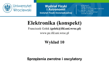 Elektronika (konspekt) Franciszek Gołek ([email protected]) www.pe.ifd.uni.wroc.pl Wykład 10 Sprzężenia zwrotne i oscylatory Ograniczenia WO. W wielu rozważaniach wzmacniacze operacyjne traktowane są jako wzmacniacze idealne. W praktyce jednak należy uwzględniać pewne istotne ograniczenia: 1) Zwykle zasilanie WO wynosi od USS = ± 10 do ± 20 V, są też wzmacniacze zasilane z jedna polaryzacją np. + 5 V. Ten fakt oznacza, że wzmacniacze nie mogą wygenerować napięcia większego niż wartości zasilające. Maksymalne napięcie wyjściowe co do modułu jest zwykle o około 1,5 V niższe od zasilającego! 2) Ofset napięcia i prądu wejściowego powoduje, że przy zerowym sygnale na wyjściu może pojawiać się niezerowe napięcie wyjściowe. 3) Dryf czasowy i temperaturowy ofsetu i parametrów wzmacniacza. 4) Ważnym ograniczeniem jest nie przekraczanie na zaciskach wejściowych napięcia zasilania. Takie przekroczenie może prowadzić do zniszczenia wzmacniacza operacyjnego. Pewnym zabezpieczeniem jest stosowanie rezystorów włączonych szeregowo do wejść. 5) Przy wzmacnianiu sygnałów W.CZ. przeszkodą jest ograniczenie od góry pasma wzmacnianych częstotliwości. Sytuację poprawia ujemne sprzężenie zwrotne. Sprzężenia zwrotne Ujemne sprzężenie zwrotne USZ – samoregulacja. Ma ono miejsce, gdy sygnał wejściowy jest osłabiany przez część β (może to być ułamek zespolony) sygnału wyjściowego. Np. napięcie sprzężenia zwrotnego jest odejmowane od napięcia sygnału wejściowego. Dodatnie sprzężenie zwrotne DSZ – możliwość samowzbudzenia. DSZ ma miejsce, gdy część sygnału wyjściowego jest dodawana do sygnału wejściowego tak, że powiększa to sygnały wejściowy i wyjściowy. USZ: Uwzmacniane = Uwzm = Uwe- β Uwy Uwy=KUUwzm.= KU(Uwe- β Uwy) Wszystko w postaci zespolonej! Wypadkowe wzmocnienie napięciowe: KUW= Uwy/Uwe Uwy/Uwe = KU(Uwe- β Uwy)/Uwe = KU- KU βUwy/Uwe Uwy/Uwe = KU/(1+ βKU) Wypadkowe wzmocnienie KUW dla USZ: (Harold Stephen Black 1927 USA) DSZ: Tu znak β jest przeciwny i wypadkowe wzmocnienie KUW dla DSZ ma postać: Przykład. Wzmacniacz operacyjny o wzmocnieniu kU=105 i niestabilności tego wzmocnienia 10% został zaopatrzony w układ sprzężenia zwrotnego obniżającego wzmocnienie do wartości k’U=102. Ile wynosi współczynnik sprzężenia zwrotnego β i jaka jest niestabilność wzmocnienia po tej zmianie? Rozwiązanie: Zakładamy, że niestabilności leżą w zakresie niskich częstotliwości co pozwala zaniedbać przesunięcia fazy i uwzględnić tylko moduły wielkości β i KU. Bez sprzężenia było: ∆kU/kU = 0.1. Do określenia ∆kUW/kUW posłużymy się pochodną z kUW: Filtry aktywne Filtry aktywne buduje się wstawiając w obwodzie ujemnego sprzężenia zwrotnego wzmacniacza impedancję zależną od częstotliwości. Filtr aktywny pasmowo-przepustowy (drugiego rzędu) Dwa kaskadowo połączone filtry: filtr dolno-przepustowy i górnoprzepustowy (rozdzielone wtórnikiem napięciowym). Dzięki dużej impedancji wejściowej wtórnika napięciowego drugi filtr nie obciąża pierwszego. Filtr aktywny górno-przepustowy dwubiegunowy (Typ ZNSN -źródło napięciowe sterowane napięciem). Zwiększając ilość biegunów (np. przez kaskadowe łączenie filtrów aktywnych) zwiększamy stromość charakterystyki częstotliwościowej na brzegach pasma. Oscylatory (generatory) Najogólniej generatory to układy przetwarzające energię. Nawet przy naturalnym przepływie energii często dochodzi do generowania rozmaitych przebiegów i zjawisk (np. fala akustyczna przy wodospadzie, rozmaite zjawiska przyrodnicze, liczne zabawki – zwłaszcza te demonstrujące rzekome perpetum mobile). W elektronice generatory są układami wytwarzającymi określone przebiegi elektryczne. Wzmacniacze z dodatnim sprzężeniem zwrotnym są w elektronice podstawowym typem generatorów (jak dotąd). Stosowane są również (chociaż rzadziej) tzw. generatory relaksacyjne, generatory samodławne oraz generatory z elementem o ujemnej rezystancji dynamicznej odtłumiającym obwody rezonansowe. Zastosowania generatorów są bardzo szerokie i bardzo częste. Ich rolą jest nie tylko generowanie określonych przebiegów napięcia ale też bardzo często stanowią sobą układy odmierzające czas. Generator jako źródło sygnału okresowego jest podstawowym elementem praktycznie wszystkich urządzeń cyfrowych (tzw. zegary). Generatory są stosowane w multimetrach cyfrowych, oscyloskopach, cyfrowych układach pomiarowych, sprzęcie audio-wideo, komputerach, peryferyjnych układach komputerowych (drukarki, terminale itp.) i wielu innych. Generator jako wzmacniacz z dodatnim sprzężeniem zwrotnym Wielkości KU (wzmocnienia) i β (współczynnik sprzężenia zwrotnego), opisujące działanie wzmacniacza i obwodu sprzężenia zwrotnego są oczywiście funkcjami zespolonymi zależnymi od częstotliwości ω. Warunkiem podtrzymywania oscylacji jest, aby mianownik wyrażenia: 1– βKU = 0, czyli βKU= βejϕ kUejψ = βkUej(ϕ+ψ) =1 co daje warunek amplitudy: IβKUI = βkU = 1 wynosił „0”, tj. aby i warunek fazy: ϕ + ψ = n2π Zatem: Re(βKU) = 1 i Im(βKU) = 0 Gdy włączamy zasilanie to w pierwszej chwili mamy szum i stan nieustalony. Ale ta składowa „szumu”, której częstotliwość spełnia warunek fazy szybko rośnie aż osiągnie warunek amplitudy. Ograniczenie dalszego wzrostu amplitudy wynika z osłabienia wartości Ku wzmacniacza dla . Generator drabinkowy Jest to generator z trzystopniowym przesuwaniem fazy. Przesuwanie fazy sygnału z kolektora o 180o (przed podaniem go na bazę) odbywa się na trzech stopniach RC. Generator Meissnera W generatorze Meissnera dodatnie sprzężenie zwrotne realizowane jest za pomocą transformatora. Przykład generatora z obwodem rezonansowym w obwodzie kolektora. Mikrowaga kwarcowa. W roku 1920 Walter Cady zaproponował wykorzystanie kwarcu do budowy bardzo stabilnych oscylatorów. Duża do