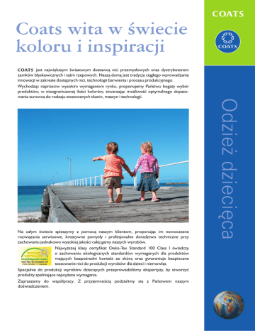 Coats wita w świecie koloru i inspiracji Na całym świecie spieszymy z pomocą naszym klientom, proponując im nowoczesne rozwiązania serwisowe, kreatywne pomysły i profesjonalne doradztwo techniczne przy zachowaniu jednakowo wysokiej jakości całej gamy naszych wyrobów. Najwyższej klasy certyfikat Oeko-Tex Standard 100 Class I świadczy o zachowaniu ekologicznych standardów wymaganych dla produktów mających bezpośredni kontakt ze skórą oraz gwarantuje bezpieczne stosowanie nici do produkcji wyrobów dla dzieci i niemowląt. Specjalnie do produkcji wyrobów dziecięcych przeprowadziliśmy ekspertyzy, by stworzyć produkty spełniające najwyższe wymagania. Zapraszamy do współpracy. Z przyjemnością podzielimy się z Państwem naszym doświadczeniem. Odzież dziecięca COATS jest największym światowym dostawcą nici przemysłowych oraz dystrybutorem zamków błyskawicznych i taśm rzepowych. Naszą dumą jest tradycja ciągłego wprowadzania innowacji w zakresie dostępnych nici, technologii barwienia i procesu produkcyjnego. Wychodząc naprzeciw wysokim wymaganiom rynku, proponujemy Państwu bogaty wybór produktów, w nieograniczonej ilości kolorów, stwarzając możliwość optymalnego dopasowania surowca do rodzaju stosowanych tkanin, maszyn i technologii. Rekomendacje Artykuł TKT 120 epic epic Nić rdzeniowa z oplotem z poliestrowych włókien ciętych 100 80 epic multicolor epic multicolor Nić rdzeniowa z oplotem z poliestrowych włókien ciętych, barwiona odcinkowo 120 80 seamsoft gramax gramax Nić z przędzy poliestrowej teksturowanej (mikrofilament) Nić z przędzy poliestrowej teksturowanej 160 Ściegi overlockowe, drabinkowe, flatlockowe, seamlockowe 140 Ściegi overlockowe, drabinkowe, flatlockowe, seamlockowe 80 Ściegi overlockowe, drabinkowe, flatlockowe, seamlockowe 160 Ściegi overlockowe, drabinkowe, flatlockowe, seamlockowe 90 Ściegi overlockowe, drabinkowe, flatlockowe, seamlockowe 120 astra astra Nić z poliestrowych włókien ciętych 80 eloflex eloflex Nić z polibutylenowych włókien ciągłych (rozciągliwość do 60%) 120 120 dual duty dual duty Ściegi jedno- i dwuigłowe stębnowe płaskie; jednoi dwuigłowe ściegi łańcuszkowe, ściegi drabinkowe, z przeplataczem górnym lub bez, oraz ściegi overlockowe, flatlockowe, seamlockowe i kroszetkowe Ściegi jedno- i dwuigłowe stębnowe płaskie; jednoi dwuigłowe ściegi łańcuszkowe, ściegi drabinkowe, z przeplataczem górnym lub bez, oraz ściegi overlockowe, flatlockowe, seamlockowe i kroszetkowe Ściegi jedno- i dwuigłowe stębnowe płaskie; jednoi dwuigłowe ściegi łańcuszkowe, ściegi drabinkowe, z przeplataczem górnym lub bez, oraz ściegi overlockowe, flatlockowe, seamlockowe i kroszetkowe Ściegi jedno- i dwuigłowe stębnowe płaskie; jednoi dwuigłowe ściegi łańcuszkowe, ściegi drabinkowe, z przeplataczem górnym lub bez, oraz ściegi overlockowe, flatlockowe, seamlockowe i kroszetkowe Ściegi jedno- i dwuigłowe stębnowe płaskie; jednoi dwuigłowe ściegi łańcuszkowe, ściegi drabinkowe, z przeplataczem górnym lub bez, oraz ściegi overlockowe, flatlockowe, seamlockowe i kroszetkowe Nić rdzeniowa z oplotem z włókien bawełnianych 75 Ściegi jedno- i dwuigłowe stębnowe płaskie; jednoi dwuigłowe ściegi łańcuszkowe, ściegi drabinkowe, z przeplataczem górnym lub bez, oraz ściegi overlockowe, flatlockowe, seamlockowe i kroszetkowe Ściegi jedno- i dwuigłowe stębnowe płaskie; jednoi dwuigłowe ściegi łańcuszkowe, ściegi drabinkowe, z przeplataczem górnym lub bez, oraz ściegi overlockowe, flatlockowe, seamlockowe i kroszetkowe Ściegi overlockowe, drabinkowe, flatlockowe, seamlockowe (szczególnie w dzianinach i tkaninach z udziałem przędz elastomerowych) Ściegi jedno- i dwuigłowe stębnowe płaskie; jednoi dwuigłowe ściegi łańcuszkowe, ściegi drabinkowe, z przeplataczem górnym lub bez, oraz ściegi overlockowe, flatlockowe, seamlockowe i kroszetkowe Ściegi jedno- i dwuigłowe stębnowe płaskie; jednoi dwuigłowe ściegi łańcuszkowe, ściegi drabinkowe, z przeplataczem górnym lub bez, oraz ściegi overlockowe, flatlockowe, seamlockowe i kroszetkowe Taśma zamkowa S40 + suwaki Poliestrowa taśma zamkowa spiralna i suwaki metalowe n.d. Alternatywna forma zapięcia. Taśmy rzepowe Poliamidowe taśmy rzepowe (haczyk i pętelka) 16 i 20 mm n.d. Alternatywna forma zapięcia. Coats Polska Sp. z o.o., ul. Kaczeńcowa 16, 91-214 Łódź Tel.: +48 42 25 40 400, Fax +48 42 25 40 422 www.coats.pl Odzież dziecięca seamsoft Zastosowanie