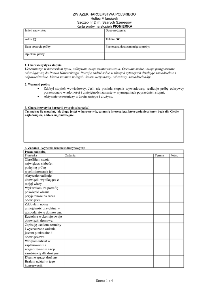 ZWIĄZEK HARCERSTWA POLSKIEGO Hufiec Milanówek Szczep nr 2 im. Szarych Szeregów Karta próby na stopień PIONIERKA Imię i nazwisko: Data urodzenia: Adres @: Telefon : Data otwarcia próby: Planowana data zamknięcia próby: Opiekun próby: 1. Charakterystyka stopnia Uczestnicząc w harcerskim życiu, odkrywam swoje zainteresowania. Oceniam siebie i swoje postępowanie odwołując się do Prawa Harcerskiego. Potrafię radzić sobie w różnych sytuacjach działając samodzielnie i odpowiedzialnie. Można na mnie polegać. Jestem uczynna/ny, odważany, samodzielna/ny. 2. Warunki próby: Zdobył stopień wywiadowcy. Jeśli nie posiada stopnia wywiadowcy, realizuje próbę odkrywcy poszerzoną o wiadomości i umiejętności zawarte w wymaganiach poprzednich stopni, Aktywnie uczestniczy w życiu zastępu i drużyny. 3. Charakterystyka harcerki (wypełnia harcerka): Tu napisz: ile masz lat, jak długo jesteś w harcerstwie, czym się interesujesz, które zadanie z karty będą dla Ciebie najłatwiejsze, a które najtrudniejsze. 4. Zadania (wypełnia harcerz z drużynowym): Praca nad sobą Pionierka Zadania Termin Określiłam swoją największą słabość i podejmę próbę wyeliminowania jej. Aktywnie realizuję obowiązki wynikające z mojej wiary. Wykazałam, że potrafię poświęcić własną przyjemność na rzecz obowiązku. Zdobyłam nową umiejętność przydatną w gospodarstwie domowym. Rzetelnie wykonuję swoje obowiązki domowe. Zapisuję ustalone terminy i wyznaczone zadania, jestem punktualna i obowiązkowa. Wziąłam udział w zaplanowaniu i zorganizowaniu akcji zarobkowej dla drużyny. Dbam o sprzęt drużyny. Brałam udział w jego konserwacji. Strona 1 z 4 Potw. ZWIĄZEK HARCERSTWA POLSKIEGO Hufiec Milanówek Szczep nr 2 im. Szarych Szeregów Karta próby na stopień PIONIERKA Dbam o zdrowie i pamiętam o aktywnym odpoczynku, odpowiedniej ilości snu, prawidłowym odżywianiu się, umiem radzić sobie z problemami okresu dojrzewania. Załatwiłam powierzoną mi sprawę w instytucji lub urzędzie. Zorganizowałam wyjście zastępu lub drużyny (grupy koleżanek lub kolegów) do kina, teatru, na koncert, do muzeum lub inną imprezę kulturalną. Potrafię w prostych sytuacjach porozumieć się w języku obcym. Umiejętnie korzystam z Internetu (wyszukuję potrzebne informacje, posiadam adres e-mail). Doskonalenie harcerskie Pionierka Zadania Termin Potrafię wskazać główne etapy w dziejach harcerstwa. Odwiedziłam komendę mojego hufca. Znam adres komendy mojej chorągwi i Głównej Kwatery. Wiem, jak nazywa się komendant hufca, komendant chorągwi, Naczelnik ZHP i Przewodniczący ZHP. Wiem, jakie inne organizacje harcerskie działają w Polsce. Czytam książki o tematyce harcerskiej. Znam strukturę ZHP. Potrafię ocenić czynności życiowe (tętno i oddech), znam prawidłowe tętno dzieci i dorosłych. Potrafię postąpić w przypadku utraty przytomności, ułożyć chorego w pozycji bocznej bezpiecznej. Umiem zastosować różne sposoby przenoszenia poszkodowanych. Potrafię postępować w przypadku zatrucia pokarmowego. Odnalazłam na mapie Strona 2 z 4 Potw. ZWIĄZEK HARCERSTWA POLSKIEGO Hufiec Milanówek Szczep nr 2 im. Szarych Szeregów Karta próby na stopień PIONIERKA miejsce, w którym się znajduję, poprowadziłam w czasie gry terenowej lub wycieczki zastęp wg mapy topograficznej. Na podstawie mapy topograficznej określiłam długość trasy, nachylenie terenu, przybliżony czas marszu, azymut na dany punkt. Zmierzyłam w terenie odległość i wysokość. Kierowałam budową urządzenia obozowego wg własnego projektu. Umiem sprawnie posługiwać się sprzętem pionierskim. Potrafię zawiązać co najmniej 10 węzłów i znam ich zastosowanie. Brałam udział w organizacji wycieczki zastępu lub drużyny. Wyrobiłam w sobie pożyteczne nawyki ekologiczne (oszczędzam wodę, gaszę światło, segreguję odpady). Wiem, co to jest park narodowy, park krajobrazowy i rezerwat przyrody. Wymienię kilka polskich parków narodowych oraz wskażę występujące w nich osobliwości przyrodnicze. Odwiedziłam jeden z parków narodowych, krajobrazowych lub rezerwatów. Poszukiwanie pól służby Pionierka Zadania Termin Poznaję historię swojej miejscowości. Wiem, co wyróżnia ją spośród innych (np. znane postacie, historyczne wydarzenia, zabytki, sztuka ludowa). Wiem, na czym polega demokracja. Brałem udział w demokratycznym podejmowaniu decyzji. Strona 3 z 4 Potw. ZWIĄZEK HARCERSTWA POLSKIEGO Hufiec Milanówek Szczep nr 2 im. Szarych Szeregów Karta próby na stopień PIONIERKA Bohater Szczepu Pionierka Zadania Termin Potw. Znam historię bohatera swojego szczepu. Potrafię ją opowiedzieć. Przeczytałem książkę o W okresie próby uczestniczyłam/em w obozie lub zimowisku harcerskim oraz w co najmniej dwóch biwakach lub rajdach, zrealizowałam/em co najmniej trzy projekty, w tym przynajmniej jeden na rzecz środowiska (np. szkoły, osiedla). Zdobyłam/em w tym czasie przynajmniej trzy sprawności (dwugwiazdkowe lub trzygwiazdkowe). Próba została zamknięta ........................ w rozkazie .................... z wynikiem pozytywnym/negatywnym. Strona 4 z 4