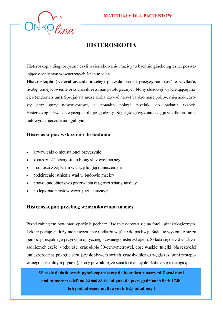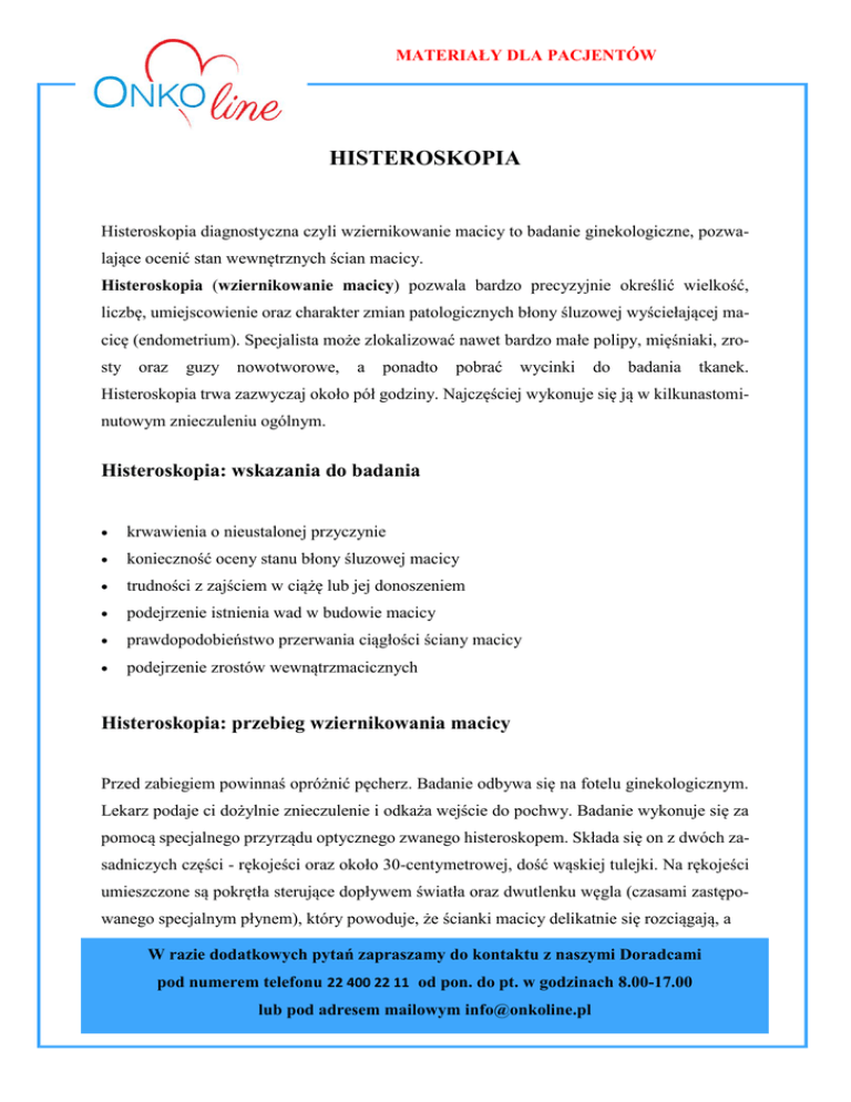 MATERIAŁY DLA PACJENTÓW HISTEROSKOPIA Histeroskopia diagnostyczna czyli wziernikowanie macicy to badanie ginekologiczne, pozwalające ocenić stan wewnętrznych ścian macicy. Histeroskopia (wziernikowanie macicy) pozwala bardzo precyzyjnie określić wielkość, liczbę, umiejscowienie oraz charakter zmian patologicznych błony śluzowej wyściełającej macicę (endometrium). Specjalista może zlokalizować nawet bardzo małe polipy, mięśniaki, zrosty oraz guzy nowotworowe, a ponadto pobrać wycinki do badania tkanek. Histeroskopia trwa zazwyczaj około pół godziny. Najczęściej wykonuje się ją w kilkunastominutowym znieczuleniu ogólnym. Histeroskopia: wskazania do badania krwawienia o nieustalonej przyczynie konieczność oceny stanu błony śluzowej macicy trudności z zajściem w ciążę lub jej donoszeniem podejrzenie istnienia wad w budowie macicy prawdopodobieństwo przerwania ciągłości ściany macicy podejrzenie zrostów wewnątrzmacicznych Histeroskopia: przebieg wziernikowania macicy Przed zabiegiem powinnaś opróżnić pęcherz. Badanie odbywa się na fotelu ginekologicznym. Lekarz podaje ci dożylnie znieczulenie i odkaża wejście do pochwy. Badanie wykonuje się za pomocą specjalnego przyrządu optycznego zwanego histeroskopem. Składa się on z dwóch zasadniczych części - rękojeści oraz około 30-centymetrowej, dość wąskiej tulejki. Na rękojeści umieszczone są pokrętła sterujące dopływem światła oraz dwutlenku węgla (czasami zastępowanego specjalnym płynem), który powoduje, że ścianki macicy delikatnie się rozciągają, a W razie dodatkowych pytań zapraszamy do kontaktu z naszymi Doradcami pod numerem telefonu 22 400 22 11 od pon. do pt. w godzinach 8.00-17.00 lub pod adresem mailowym [email protected] MATERIAŁY DLA PACJENTÓW poszczególne fragmenty błony śluzowej stają lepiej widoczne. Wnętrze tulejki wypełniają przewody zasilające źródło światła i maleńką kamerę oraz przewód umożliwiający wtłaczanie gazu do macicy. W czasie zabiegu histeroskop podłączony jest do monitora, który przekazuje obraz rejestrowany przez kamerę. Dzięki temu, manipulując przyrządem, specjalista jest w stanie bardzo dokładnie obejrzeć każdy fragment jamy macicy. Przez tulejkę histeroskopu można do niej wprowadzić również mikronarzędzia, np. specjalne szczypce, którymi ginekolog pobiera wycinki śluzówki do badania histopatologicznego. Histeroskopia: po wziernikowaniu macicy Jeśli nie odczuwasz żadnych dolegliwości, możesz tego samego dnia wrócić do domu. Powinnaś jednak dużo wypoczywać, unikać wysiłku, a zwłaszcza dźwigania, ponieważ może to spowodować krwawienie z dróg rodnych. W przypadku, gdy lekarz pobrał próbki błony śluzowej do analizy, może ci zalecić przyjmowanie przez kilka dni antybiotyku, aby zapobiec infekcji. Histeroskopia jest badaniem bezpiecznym, powikłania zdarzają się bardzo rzadko. Czasem pojawia się lekkie krwawienie i ból w dole brzucha. Jeśli te dolegliwości nie ustępują, zgłoś się do lekarza. W razie dodatkowych pytań zapraszamy do kontaktu z naszymi Doradcami pod numerem telefonu 22 400 22 11 od pon. do pt. w godzinach 8.00-17.00 lub pod adresem mailowym [email protected]