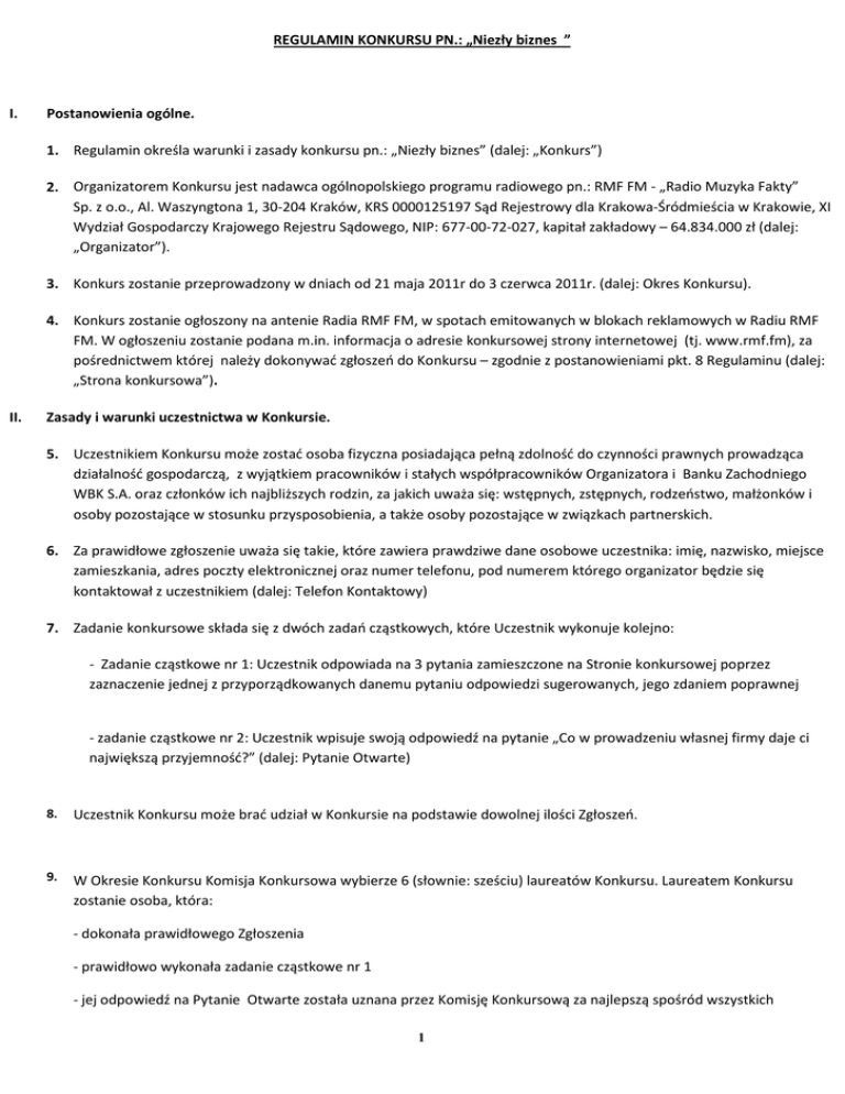 REGULAMIN KONKURSU PN.: „Niezły biznes ” I. Postanowienia ogólne. 1. Regulamin określa warunki i zasady konkursu pn.: „Niezły biznes” (dalej: „Konkurs”) 2. Organizatorem Konkursu jest nadawca ogólnopolskiego programu radiowego pn.: RMF FM - „Radio Muzyka Fakty” Sp. z o.o., Al. Waszyngtona 1, 30-204 Kraków, KRS 0000125197 Sąd Rejestrowy dla Krakowa-Śródmieścia w Krakowie, XI Wydział Gospodarczy Krajowego Rejestru Sądowego, NIP: 677-00-72-027, kapitał zakładowy – 64.834.000 zł (dalej: „Organizator”). 3. Konkurs zostanie przeprowadzony w dniach od 21 maja 2011r do 3 czerwca 2011r. (dalej: Okres Konkursu). 4. Konkurs zostanie ogłoszony na antenie Radia RMF FM, w spotach emitowanych w blokach reklamowych w Radiu RMF FM. W ogłoszeniu zostanie podana m.in. informacja o adresie konkursowej strony internetowej (tj. www.rmf.fm), za pośrednictwem której należy dokonywać zgłoszeń do Konkursu – zgodnie z postanowieniami pkt. 8 Regulaminu (dalej: „Strona konkursowa”). II. Zasady i warunki uczestnictwa w Konkursie. 5. Uczestnikiem Konkursu może zostać osoba fizyczna posiadająca pełną zdolność do czynności prawnych prowadząca działalność gospodarczą, z wyjątkiem pracowników i stałych współpracowników Organizatora i Banku Zachodniego WBK S.A. oraz członków ich najbliższych rodzin, za jakich uważa się: wstępnych, zstępnych, rodzeństwo, małżonków i osoby pozostające w stosunku przysposobienia, a także osoby pozostające w związkach partnerskich. 6. Za prawidłowe zgłoszenie uważa się takie, które zawiera prawdziwe dane osobowe uczestnika: imię, nazwisko, miejsce zamieszkania, adres poczty elektronicznej oraz numer telefonu, pod numerem którego organizator będzie się kontaktował z uczestnikiem (dalej: Telefon Kontaktowy) 7. Zadanie konkursowe składa się z dwóch zadań cząstkowych, które Uczestnik wykonuje kolejno: - Zadanie cząstkowe nr 1: Uczestnik odpowiada na 3 pytania zamieszczone na Stronie konkursowej poprzez zaznaczenie jednej z przyporządkowanych danemu pytaniu odpowiedzi sugerowanych, jego zdaniem poprawnej - zadanie cząstkowe nr 2: Uczestnik wpisuje swoją odpowiedź na pytanie „Co w prowadzeniu własnej firmy daje ci największą przyjemność?” (dalej: Pytanie Otwarte) 8. Uczestnik Konkursu może brać udział w Konkursie na podstawie dowolnej ilości Zgłoszeń. 9. W Okresie Konkursu Komisja Konkursowa wybierze 6 (słownie: sześciu) laureatów Konkursu. Laureatem Konkursu zostanie osoba, która: - dokonała prawidłowego Zgłoszenia - prawidłowo wykonała zadanie cząstkowe nr 1 - jej odpowiedź na Pytanie Otwarte została uznana przez Komisję Konkursową za najlepszą spośród wszystkich 1 odpowiedzi na Pytanie Otwarte wpisane przez Uczestników Konkursu do dnia, w którym Komisja Konkursowa dokonuje wyboru najlepszej odpowiedzi na Pytanie Otwarte. 10. Laureaci Konkursu będą ogłaszani na antenie radia RMF FM w dniach od 23 maja 2011r. do 3 czerwca 2011r. od poniedziałku do piątku w godz. 06:00-09:00. Laureaci będą wyłaniani przez Komisję Konkursową w dowolnych dniach w Okresie Konkursu, wg uznania Komisji Konkursowej. IV. Nagrody. 11. Fundatorami Nagród są Organizator oraz Bank Zachodni WBK SA (dalej: „BZWBK”). 12. Na potrzeby Konkursu, Organizator oraz BZWBK ufundowali 6 nagród pieniężno-rzeczowych czyli po 1 nagrodzie dla każdego z Laureatów. 14. Jedną nagrodę pieniężno-rzeczową (dalej: Nagroda) stanowi: - kwota pieniężna w wysokości 2247 zł (dalej: Kwota Pieniężna) - rachunek bieżący BZWBK w taryfie Biznes Pakiet OPTI, który zwolniony z opłaty za prowadzenie przez okres 9 miesięcy licząc od miesiąca w którym rachunek został otwarty (dalej: Konto); Fundatorem Części Pieniężnej Nagrody jest Organizator. Fundatorem Konta jest BZWBK. Łączna wartość Nagrody wynosi 2 472 zł. 15. Konto w żadnym wypadku nie podlega zamianie na jakikolwiek ekwiwalent (w tym w szczególności na kwotę pieniężną). 16. Każdemu Zwycięzcy Edycji przyznana zostaje jedna Nagroda 17. Organizator skontaktuje się z każdym Zwycięzcą Edycji Konkursu w terminie do 14 dni roboczych od dnia zakończenia każdej Edycji, dzwoniąc pod numery telefonów podane przez Zwycięzców. 18. Zwycięzca nie otrzymuje Nagrody, jeżeli z przyczyn niezależnych od Organizatora nie uda się osobie upoważnionej przez Organizatora skontaktować z nim telefonicznie w ciągu 7 dni roboczych od dnia zakończenia danej Edycji, wykonując trzy próby telefonicznego skontaktowania się. V. Realizacja prawa do Nagrody. 19. Wydanie Nagrody: - nastąpi wyłącznie poprzez przelanie przez Organizatora w ciągu 30 dni od dnia założenia konta firmowego BZWBK przez Laureata kwoty pieniężnej po potrąceniu przez Organizatora należnego podatku od nagród w wysokości 247 zł - kwota pieniężna zostanie przelana na konto firmowe BZWBK założone przez Laureata Konkursu w dowolnym oddziale BZWBK S.A. w terminie do 31 lipca 2011. Informacje o Laureatach będą przekazywane do Banku Zachodniego WBK przez Organizatora w terminie 2 dni roboczych od daty wyłonienia każdego ze Zwycięzców. 2 20. Niedopuszczalna jest jakakolwiek inna forma przekazania Kwoty Pieniężnej niż wskazania w pkt. 20 powyżej. W szczególności kwota Pieniężna nie może zostać wydana w gotówce ani przelana na inne konto bankowe w BZWBK ani 21. inne założone w innym banku niż BZ WBK. Laureat, który uzyskał prawo do Nagrody zobowiązany jest podpisać w wybranym oddziale Banku Zachodniego WBK 22. umowę rachunku bieżącego w nieprzekraczalnym terminie 60 dni od dnia uzyskania prawa do Nagrody, a następnie przekazać Organizatorowi numer firmowego rachunku bankowego w BZ WBK należącego do Laureata drogą mailową pod adres: [email protected] Niewykonanie przez Laureata obowiązku wskazanego w pkt. 21) Regulaminu, w terminie tam wskazanym, skutkuje utratą prawa do Nagrody. VI. Reklamacje. 21. Prawo do skład