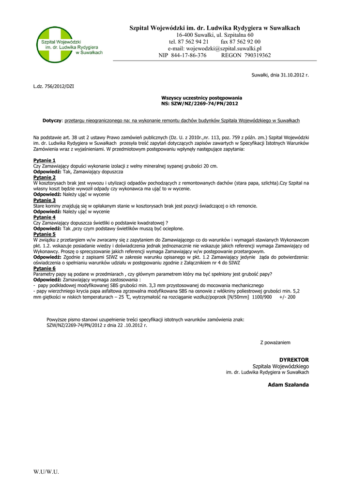 Szpital Wojewódzki im. dr. Ludwika Rydygiera w Suwałkach 16-400 Suwałki, ul. Szpitalna 60 tel. 87 562 94 21 fax 87 562 92 00 e-mail: [email protected] NIP 844-17-86-376 REGON 790319362 Suwałki, dnia 31.10.2012 r. L.dz. 756/2012/DZI Wszyscy uczestnicy postępowania NS: SZW/NZ/2269-74/PN/2012 Dotyczy: przetargu nieograniczonego na: na wykonanie remontu dachów budynków Szpitala Wojewódzkiego w Suwałkach Na podstawie art. 38 ust 2 ustawy Prawo zamówień publicznych (Dz. U. z 2010r.,nr. 113, poz. 759 z późn. zm.) Szpital Wojewódzki im. dr. Ludwika Rydygiera w Suwałkach przesyła treść zapytań dotyczących zapisów zawartych w Specyfikacji Istotnych Warunków Zamówienia wraz z wyjaśnieniami. W przedmiotowym postępowaniu wpłynęły następujące zapytania: Pytanie 1 Czy Zamawiający dopuści wykonanie izolacji z wełny mineralnej sypanej grubości 20 cm. Odpowiedź: Tak, Zamawiający dopuszcza Pytanie 2 W kosztorysach brak jest wywozu i utylizacji odpadów pochodzących z remontowanych dachów (stara papa, szlichta).Czy Szpital na własny koszt będzie wywoził odpady czy wykonawca ma ująć to w wycenie. Odpowiedź: Należy ująć w wycenie Pytanie 3 Stare kominy znajdują się w opłakanym stanie w kosztorysach brak jest pozycji świadczącej o ich remoncie. Odpowiedź: Należy ująć w wycenie Pytanie 4 Czy Zamawiający dopuszcza świetliki o podstawie kwadratowej ? Odpowiedź: Tak ,przy czym podstawy świetlików muszą być ocieplone. Pytanie 5 W związku z przetargiem w/w zwracamy się z zapytaniem do Zamawiającego co do warunków i wymagań stawianych Wykonawcom pkt. 1.2. wskazuje posiadanie wiedzy i doświadczenia jednak jednoznacznie nie wskazuje jakich referencji wymaga Zamawiający od Wykonawcy. Proszę o sprecyzowanie jakich referencji wymaga Zamawiający w/w postępowanie przetargowym. Odpowiedź: Zgodnie z zapisami SIWZ w zakresie warunku opisanego w pkt. 1.2 Zamawiający jedynie żąda do potwierdzenia: oświadczenia o spełnianiu warunków udziału w postępowaniu zgodnie z Załącznikiem nr 4 do SIWZ Pytanie 6 Parametry papy są podane w przedmiarach , czy głównym parametrem który ma być spełniony jest grubość papy? Odpowiedź: Zamawiający wymaga zastosowania : - papy podkładowej modyfikowanej SBS grubości min. 3,3 mm przystosowanej do mocowania mechanicznego - papy wierzchniego krycia papa asfaltowa zgrzewalna modyfikowana SBS na osnowie z włókniny poliestrowej grubości min. 5,2 mm giętkości w niskich temperaturach – 25 C, wytrzymałość na rozciąganie wzdłuż/poprzek [N/50mm] 1100/900 +/- 200 Powyższe pismo stanowi uzupełnienie treści specyfikacji istotnych warunków zamówienia znak: SZW/NZ/2269-74/PN/2012 z dnia 22 .10.2012 r. Z poważaniem DYREKTOR Szpitala Wojewódzkiego im. dr. Ludwika Rydygiera w Suwałkach Adam Szałanda W.U/W.U.