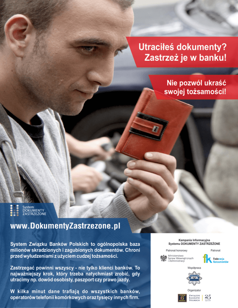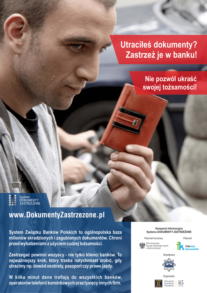 Utraciłeś dokumenty? Zastrzeż je w banku! Nie pozwól ukraść swojej tożsamości! System Związku Banków Polskich to ogólnopolska baza milionów skradzionych i zagubionych dokumentów. Chroni przed wyłudzeniami z użyciem cudzej tożsamości. Kampania Informacyjna Systemu DOKUMENTY ZASTRZEŻONE Patronat honorowy Patronat Zastrzegać powinni wszyscy - nie tylko klienci banków. To najważniejszy krok, który trzeba natychmiast zrobić, gdy utracimy np. dowód osobisty, paszport czy prawo jazdy. Współpraca W kilka minut dane trafiają do wszystkich banków, operatorów telefonii komórkowych oraz tysięcy innych firm. Organizator
