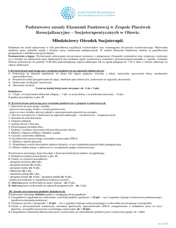 Podstawowe zasady Ekonomii Punktowej w Zespole Placówek Resocjalizacyjno – Socjoterapeutycznych w Oławie. Młodzieżowy Ośrodek Socjoterapii. Dokument ten został opracowany w celu prawidłowej socjalizacji wychowanków oraz wspomagania ich procesu wychowawczego. Wprowadza możliwie jasne, jednolite zasady i kryteria oceny zachowania podopiecznych. W ramach Ekonomii Punktowej, nieletni są gratyfikowani przepustkami i dodatkowymi przywilejami. Postanowienia wstępne: Wychowanek zobowiązany jest powracać terminowo z urlopowania. Przepustki weekendowe oraz świąteczne wydawane są w terminie od zakończenia zajęć edukacyjnych (po uzyskaniu zgody wychowawcy związanej z pozostawieniem porządku w sypialni, wymianie bielizny pościelowej) do godziny 19.00 dnia poprzedzającego zajęcia edukacyjne lub za zgodą pedagoga do 7.30 w dniu w którym odbywają się zajęcia edukacyjne. I. Kryteria brane pod uwagę przy ocenianiu punktowym na zajęciach edukacyjnych: 1. Frekwencja na lekcjach (spóźnienia na lekcje lub zajęcia grupowe, ucieczka z lekcji, samowolne opuszczenie klasy, nieobecność usprawiedliwiona), 2. Stosunek do nauki (przygotowanie do zajęć, odrabianie prac domowych, zachowanie na zajęciach, aktywność), 3. Zachowanie na lekcjach i przerwach, 4. Aktywność na lekcji. Uczeń na każdej lekcji może otrzymać: od - 5 do + 5 pkt. Dodatkowo: 1. + 10 pkt. za ocenę bardzo dobrą lub celującą, + 5 pkt. za ocenę dobrą, a za niedostateczną ocenę: - 10 pkt., 2. punkty przewidziane w pkt. III. II. Kryteria brane pod uwagę przy ocenianiu punktowym w grupach wychowawczych: 1. Aktywność na rzecz grupy, ośrodka: - praca na rzecz grupy, troska o wystrój pomieszczeń, - praca na rzecz ośrodka, aktywny udział w reprezentowaniu placówki na zewnątrz, 2. Aktywne uczestnictwo i zachowanie na zajęciach edukacyjno – wychowawczo – terapeutycznych, 3. Stosunek do osób dorosłych, 4. Uleganie nałogom, 5. Agresja słowna i fizyczna, 6. Przestrzeganie porządku dnia, 7. Kradzież, wymiana, pożyczanie lub przywłaszczenie mienia, 8. Dbałość o higienę osobistą i schludny wygląd, 9. Ucieczki, samowolne oddalenia, 10. Kształtowanie pozytywnego wizerunku wychowanka ZPR-S, 11. Dbałość o mienie placówki, 12. Wypełnianie swoich obowiązków podczas dyżurów, w tym wypełnianie poleceń kadry pedagogicznej, 13. Dbanie o dobre relacje w placówce (w szczególności grupie wychowawczej). Wychowawca sprawujący dyżur decyduje o ilości przewidzianych punków uwzględniając: A. Dodatkowo punkty przewidziane w pkt. III, B. Punkty za czynności porządkowe: - sprzątanie korytarza do 6 pkt., - sprzątanie łazienki do 10 pkt., - sprzątanie toalety do 10 pkt., - odkurzanie do 5 pkt., - zamiatanie pokoju do 5 pkt., - sprzątanie kuchni do 10 pkt.- sprzątanie jadalni do 10 pkt., - punkty przewidziane w regulaminie konkursu czystości, C. Aktywną pracę wychowanka na nauce własnej – do 15 pkt., D. Aktywną pracę wychowanka na zajęciach programowych – do 15 pkt. III. Zasady przyznawania punktów dodatkowych. Wychowanek otrzymuje dodatnie punkty w następujących przypadkach: 1. Cotygodniowe regulaminowe zachowanie, czyli brak punktów ujemnych: + 10 pkt. – raz w tygodniu (wpisuje wychowawca podsumowujący tygodniową ekonomię punktową), 2. Terminowy powrót z przepustki: + 10 pkt. – raz w tygodniu (wpisuje osoba przyjmująca wychowanka powracającego z przepustki), 3. Udział w uroczystościach, konkursach, zawodach sportowych, reprezentowaniu ZPR-S, zaangażowanie w dodatkowe prace na rzecz placówki, szczególnie pozytywnie wyróżniające zachowanie: do + 50 pkt., 4. Cotygodniowa samoocena dokonywana przez wychowanka, po zatwierdzeniu punktów przez wychowawcę grupy: do +10pkt. Strona 1 z 3 IV. Wychowanek otrzymuje ujemne punkty w następujących przypadkach: 1. Ucieczka: - 100 pkt., 2. Samowolne oddalenie (wychowanek odłącza się od grupy, ale pozostaje w zasięgu wzroku wychowawcy - 20 pkt.), 3. Udzielenie pomocy w ucieczce innemu wychowankowi: do -50 pkt., 4. Niepowiadomienie wychowawcy/nauczyciela o rażącym łamaniu regulaminu przez innego wychowanka ( np. bójka, ucieczka, zażywanie środków psychoaktywnych ): do - 20 pkt., 5. Stosowanie przemocy psychicznej ( np. zastraszanie, wyłudzanie mienia, manipulowanie) : do - 50 pkt., 6. Przywłaszczenie, wymiana, pożyczanie lub handel rzeczami osobistymi, odzieżą : do – 30 pkt., 7. Nieterminowy powrót z przepustki (spóźnienie w dniu powrotu z przepustki ): do - 5 pkt. (wpisuje osoba przyjmująca wychowanka powracającego z przepustki), 8. Brak przepustki, podpisu rodzica/opiekuna lub nie zrealizowanie zaleceń z przepustki: - 2 pkt. (wpisuje osoba przyjmująca wychowanka powracającego z przepustki), 5. Każdy dzień nieobecności nieusprawiedliwionej: - 15 pkt. (wpisuje wychowawca podsumowujący dzień), 9. Powrót z przepustki pod wpływem jakichkolwiek środków odurzających: do - 50 pkt., 10. Palenie papierosów: do – 15 pkt., 11. Wulgaryzmy: do - 5 pkt., 12. Niszczenie mienia: do - 50 pkt. (niezależnie od pokrycia kosztów szkód), 14. Posiadanie lub używanie bez zezwolenia kadry przedmiotów zabronionych ( np. telefonów i akcesoriów komórkowych, sprzętu elektronicznego, pieniędzy): do - 50 pkt., 15. Wnoszenie, posiadanie lub używanie ostrych niebezpiecznych narzędzi oraz środków odurzających, w tym odżywek i suplementów sportowych: -50 pkt., 16. Wszelkie próby samookaleczenia się, w tym także wykonywania tatuaży: - 50 pkt., 17. Przebywanie w nie swojej sypialni bez pozwolenia wychowawcy: - 10 pkt., 18. Nie wykonanie polecenia: do - 10 pkt., 19. Zamykanie drzwi w pokojach: - 5 pkt. , 20. Znieważenie, lekceważenie wychowawcy: - 50 pkt., 21. Utrudnianie prowadzenia zajęć, nie uczestniczenie w zajęciach lub zakłócanie realizacji planu dnia: do - 50 pkt., 22. Nie przestrzeganie innych postanowień, ustaleń i zarządzeń, rażąco naganne zachowanie: do - 50 pkt.
