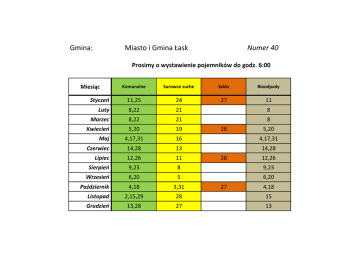 Gmina: Miasto i Gmina Łask Numer 40 Prosimy o wystawienie pojemników do godz. 6:00 Miesiąc Komunalne Surowce suche Szkło Bioodpady Styczeń 11,25 24 27 11 Luty 8,22 21 8 Marzec 8,22 21 8 Kwiecień 5,20 19 4,17,31 16 4,17,31 Czerwiec 14,28 13 14,28 Lipiec 12,26 11 Sierpień 9,23 8 9,23 Wrzesień 6,20 5 6,20 Październik 4,18 3,31 Listopad 2,15,29 28 15 Grudzień 13,28 27 13 Maj 28 28 27 5,20 12,26 4,18