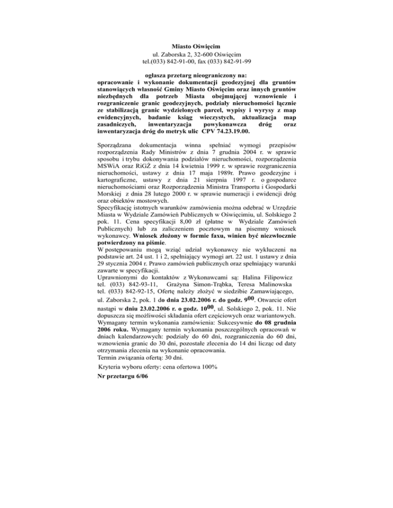 Miasto Oświęcim ul. Zaborska 2, 32-600 Oświęcim tel.(033) 842-91-00, fax (033) 842-91-99 ogłasza przetarg nieograniczony na: opracowanie i wykonanie dokumentacji geodezyjnej dla gruntów stanowiących własność Gminy Miasto Oświęcim oraz innych gruntów niezbędnych dla potrzeb Miasta obejmującej wznowienie i rozgraniczenie granic geodezyjnych, podziały nieruchomości łącznie ze stabilizacją granic wydzielonych parcel, wypisy i wyrysy z map ewidencyjnych, badanie ksiąg wieczystych, aktualizacja map zasadniczych, inwentaryzacja powykonawcza dróg oraz inwentaryzacja dróg do metryk ulic CPV 74.23.19.00. Sporządzana dokumentacja winna spełniać wymogi przepisów rozporządzenia Rady Ministrów z dnia 7 grudnia 2004 r. w sprawie sposobu i trybu dokonywania podziałów nieruchomości, rozporządzenia MSWiA oraz RiGŻ z dnia 14 kwietnia 1999 r. w sprawie rozgraniczenia nieruchomości, ustawy z dnia 17 maja 1989r. Prawo geodezyjne i kartograficzne, ustawy z dnia 21 sierpnia 1997 r. o gospodarce nieruchomościami oraz Rozporządzenia Ministra Transportu i Gospodarki Morskiej z dnia 28 lutego 2000 r. w sprawie numeracji i ewidencji dróg oraz obiektów mostowych. Specyfikację istotnych warunków zamówienia można odebrać w Urzędzie Miasta w Wydziale Zamówień Publicznych w Oświęcimiu, ul. Solskiego 2 pok. 11. Cena specyfikacji 8,00 zł (płatne w Wydziale Zamówień Publicznych) lub za zaliczeniem pocztowym na pisemny wniosek wykonawcy. Wniosek złożony w formie faxu, winien być niezwłocznie potwierdzony na piśmie. W postępowaniu mogą wziąć udział wykonawcy nie wykluczeni na podstawie art. 24 ust. 1 i 2, spełniający wymogi art. 22 ust. 1 ustawy z dnia 29 stycznia 2004 r. Prawo zamówień publicznych oraz spełniający warunki zawarte w specyfikacji. Uprawnionymi do kontaktów z Wykonawcami są: Halina Filipowicz tel. (033) 842-93-11, Grażyna Simon-Trąbka, Teresa Malinowska tel. (033) 842-92-15, Ofertę należy złożyć w siedzibie Zamawiającego, ul. Zaborska 2, pok. 1 do dnia 23.02.2006 r. do godz. 900. Otwarcie ofert nastąpi w dniu 23.02.2006 r. o godz. 1000, ul. Solskiego 2, pok. 11. Nie dopuszcza się możliwości składania ofert częściowych oraz wariantowych. Wymagany termin wykonania zamówienia: Sukcesywnie do 08 grudnia 2006 roku. Wymagany termin wykonania poszczególnych opracowań w dniach kalendarzowych: podziały do 60 dni, rozgraniczenia do 60 dni, wznowienia granic do 30 dni, pozostałe zlecenia do 14 dni licząc od daty otrzymania zlecenia na wykonanie opracowania. Termin związania ofertą: 30 dni. Kryteria wyboru oferty: cena ofertowa 100% Nr przetargu 6/06