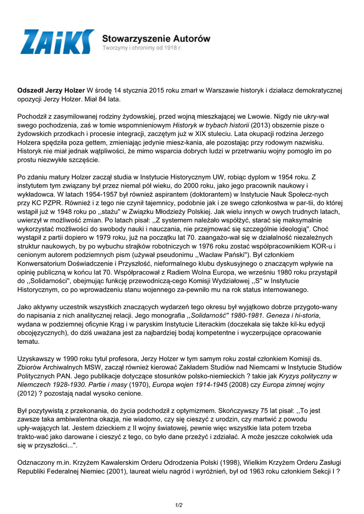 Odszedł Jerzy Holzer W środę 14 stycznia 2015 roku zmarł w Warszawie historyk i działacz demokratycznej opozycji Jerzy Holzer. Miał 84 lata. Pochodził z zasymilowanej rodziny żydowskiej, przed wojną mieszkającej we Lwowie. Nigdy nie ukry-wał swego pochodzenia, zaś w tomie wspomnieniowym Historyk w trybach historii (2013) obszernie pisze o żydowskich przodkach i procesie integracji, zaczętym już w XIX stuleciu. Lata okupacji rodzina Jerzego Holzera spędziła poza gettem, zmieniając jedynie miesz-kania, ale pozostając przy rodowym nazwisku. Historyk nie miał jednak wątpliwości, że mimo wsparcia dobrych ludzi w przetrwaniu wojny pomogło im po prostu niezwykłe szczęście. Po zdaniu matury Holzer zaczął studia w Instytucie Historycznym UW, robiąc dyplom w 1954 roku. Z instytutem tym związany był przez niemal pół wieku, do 2000 roku, jako jego pracownik naukowy i wykładowca. W latach 1954-1957 był również aspirantem (doktorantem) w Instytucie Nauk Społecz-nych przy KC PZPR. Również i z tego nie czynił tajemnicy, podobnie jak i ze swego członkostwa w par-tii, do której wstąpił już w 1948 roku po ,,stażu'' w Związku Młodzieży Polskiej. Jak wielu innych w owych trudnych latach, uwierzył w możliwość zmian. Po latach pisał: ,,Z systemem należało współżyć, starać się maksymalnie wykorzystać możliwości do swobody nauki i nauczania, nie przejmować się szczególnie ideologią''. Choć wystąpił z partii dopiero w 1979 roku, już na początku lat 70. zaangażo-wał się w działalność niezależnych struktur naukowych, by po wybuchu strajków robotniczych w 1976 roku zostać współpracownikiem KOR-u i cenionym autorem podziemnych pism (używał pseudonimu ,,Wacław Pański''). Był członkiem Konwersatorium Doświadczenie i Przyszłość, nieformalnego klubu dyskusyjnego o znaczącym wpływie na opinię publiczną w końcu lat 70. Współpracował z Radiem Wolna Europa, we wrześniu 1980 roku przystąpił do ,,Solidarności'', obejmując funkcję przewodniczą-cego Komisji Wydziałowej ,,S'' w Instytucie Historycznym, co po wprowadzeniu stanu wojennego za-pewniło mu na rok status internowanego. Jako aktywny uczestnik wszystkich znaczących wydarzeń tego okresu był wyjątkowo dobrze przygoto-wany do napisania z nich analitycznej relacji. Jego monografia ,,Solidarność'' 1980-1981. Geneza i hi-storia, wydana w podziemnej oficynie Krąg i w paryskim Instytucie Literackim (doczekała się także kil-ku edycji obcojęzycznych), do dziś uważana jest za najbardziej bodaj kompetentne i wyczerpujące opracowanie tematu. Uzyskawszy w 1990 roku tytuł profesora, Jerzy Holzer w tym samym roku został członkiem Komisji ds. Zbiorów Archiwalnych MSW, zaczął również kierować Zakładem Studiów nad Niemcami w Instytucie Studiów Politycznych PAN. Jego publikacje dotyczące stosunków polsko-niemieckich ? takie jak Kryzys polityczny w Niemczech 1928-1930. Partie i masy (1970), Europa wojen 1914-1945 (2008) czy Europa zimnej wojny (2012) ? pozostają nadal wysoko cenione. Był pozytywistą z przekonania, do życia podchodził z optymizmem. Skończywszy 75 lat pisał: ,,To jest zawsze taka ambiwalentna okazja, nie wiadomo, czy się cieszyć z urodzin, czy martwić z powodu upły-wających lat. Jestem dzieckiem z II wojny światowej, pewnie więc wszystkie lata potem trzeba trakto-wać jako darowane i cieszyć z tego, co było dane przeżyć i zdziałać. A może jeszcze cokolwiek uda się w przyszłości...''. Odznaczony m.in. Krzyżem Kawalerskim Orderu Odrodzenia Polski (1998), Wielkim Krzyżem Orderu Zasługi Republiki Federalnej Niemiec (2001), laureat wielu nagród i wyróżnień, był od 1963 roku członkiem Sekcji I ? 1/2 Autorów Prac Naukowych naszego Stowarzyszenia. Wszelkie prawa zastrzeżone 2017 ZAiKS / data wygenerowania strony 07.03.2017 08:45:56 PDF ze strony: http://zaiks.org.pl/905,0,odszedl_jerzy_holzer 2/2