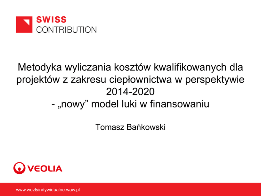 Metodyka wyliczania kosztów kwalifikowanych dla projektów z zakresu ciepłownictwa w perspektywie 2014-2020 - „nowy” model luki w finansowaniu Tomasz Bańkowski www.wezlyindywidualne.waw.pl Umocowanie „modelu” luki w finansowaniu (1) ‣ ROZPORZ ĄDZENIE KOMISJI (UE) NR 651/2014 z dnia 17 czerwca 2014 r. uznające niektóre rodzaje pomocy za zgodne z rynkiem wewnętrznym w zastosowaniu art. 107 i 108 Traktatu (Tekst mający znaczenie dla EOG) –w sprawi wyłączeń blokowych GBER: Artykuł 46 Pomoc inwestycyjna na efektywny energetycznie system ciepłowniczy i chłodniczy (sieci ciepłownicze): Kosztami kwalifikowalnymi w przypadku sieci dystrybucji są koszty inwestycji. Kwota pomocy w przypadku sieci dystrybucji nie przekracza różnicy między kosztami kwalifikowalnymi a zyskiem operacyjnym. Zysk operacyjny odlicza się od kosztów kwalifikowalnych ex ante albo poprzez mechanizm wycofania. Co stanowi generalną zasadę luki w finansowaniu. ‣ WAŻNE: Pomoc inwestycyjna na rzecz lokalnej sieci ciepłowniczej lub chłodniczej przekraczająca 20 mln EUR na przedsiębiorstwo i na jeden projekt inwestycyjny wymaga indywidualnego zgłoszenia do Komisji Europejskiej. www.wezlyindywidualne.waw.pl 2 Umocowanie „modelu” luki w finansowaniu (2) ‣ Perspektywa 2007-2013: Narodowe Strategiczne Ramy Odniesienia 2007-2013 - Wytyczne w zakresie wybranych zagadnień związanych z przygotowaniem projektów inwestycyjnych, w tym projektów generujących dochód – 10 maja 2013 – Ministerstwo Rozwoju Regionalnego. ‣ Perspektywa 2014-2020: (Projekt) Wytyczne w zakresie zagadnień związanych z przygotowaniem projektów inwestycyjnych, w tym projektów generujących dochód i projektów hybrydowych na lata 2014-2020 – Ministerstwo Infrastruktury i Rozwoju. ‣ został przygotowany na podstawie art. 5 ust. 1 pkt 11 ustawy z dnia 11 lipca 2014 r. o zasadach realizacji programów w zakresie polityki spójności finansowanych w perspektywie finansowej 2014-2020 (Dz. U. z 2014 r, poz. 1146.). www.wezlyindywidualne.waw.pl 3 Umocowanie „modelu” inwestycji referencyjnej (1) ‣ ROZPORZ ĄDZENIE KOMISJI (UE) NR 651/2014 z dnia 17 czerwca 2014 r. uznające niektóre rodzaje pomocy za zgodne z rynkiem wewnętrznym w zastosowaniu art. 107 i 108 Traktatu (Tekst mający znaczenie dla EOG): Artykuł 40 Pomoc na inwestycje w układy wysokosprawnej kogeneracji: Kosztami kwalifikowalnymi są dodatkowe koszty inwestycji w urządzenia niezbędne do tego, by instalacja mogła funkcjonować jako wysokosprawna instalacja kogeneracyjna, w porównaniu z konwencjonalną instalacją energii elektrycznej lub grzewczej o takiej samej mocy, lub dodatkowe koszty inwestycji na modernizację w celu uzyskania wyższej sprawności, w przypadku gdy istniejąca instalacja spełnia już próg wysokiej sprawności. Intensywność pomocy nie przekracza 45 % kosztów kwalifikowalnych. Intensywność pomocy można zwiększyć o 20 punktów procentowych w przypadku pomocy na rzecz małych przedsiębiorstw i o 10 punktów procentowych w przypadku pomocy na rzecz średnich przedsiębiorstw. Intensywność pomocy można zwiększyć o 15 punktów procentowych w przypadku inwestycji prowadzonych na obszarach objętych pomocą, które spełniają warunki określone w art. 107 ust. 3 lit. a) Traktatu, oraz o 5 punktów procentowych w przypadku inwestycji prowadzonych na obszarach objętych pomocą, które spełniają warunki określone w art. 107 ust. 3 lit. c) Traktatu. www.wezlyindywidualne.waw.pl 4 Stosowanie „modelu” luki w finansowaniu (1) ‣ Perspektywa 2014-2020: Program Operacyjny Infrastruktura i Środowisko (zatwierdzony przez Komisję Europejską 16 grudnia 2014 roku): OŚ PRIORYTETOWA : Zmniejszenie emisyjności gospodarki: PRIORYTET INWESTYCYJNY 4.5 Promowanie strategii niskoemisyjnych dla wszystkich rodzajów terytoriów, w szczególności dla obszarów miejskich, w tym wspieranie zrównoważonej multimodalnej mobilności miejskiej i działań adaptacyjnych mających oddziaływanie łagodzące na zmiany klimatu: ‣ przebudowa istniejących systemów ciepłowniczych i sieci chłodu, celem zmniejszenia straty na przesyle, ‣ likwidacja węzłów grupowych wraz z budową przyłączy do istniejących budynków i instalacją węzłów dwufunkcyjnych (ciepła woda użytkowa), ‣ budowa nowych odcinków sieci cieplnej wraz z przyłączami i węzłami ciepłowniczymi w celu likwidacji istniejących lokalnych źródeł ciepła opalanych paliwem stałym. ‣ likwidacja indywidualnych i zbiorowych źródeł niskiej emisji pod warunkiem podłączenia budynków do sieci ciepłowniczej. www.wezlyindywidualne.waw.pl 5 Stosowanie „modelu” luki w finansowaniu (2) ‣ Perspektywa 2014-2020: Program Operacyjny Infrastruktura i Środowisko: OŚ PRIORYTETOWA : Zmniejszenie emisyjności gospodarki: PRIORYTET INWESTYCYJNY 4.6 Promowanie wykorzystania wysokosprawnej kogeneracji ciepła i energii elektrycznej w oparciu o zapotrzebowanie na ciepło użytkowe: ‣ budowa przyłączeń do sieci ciepłowniczych do wykorzystania ciepła użytkowego wyprodukowanego w jednostkach wytwarzania energii elektrycznej i ciepła w układach wysokosprawnej kogeneracji wraz z budową przyłączy wyprowadzających energię do krajowego systemu przesyłowego; ‣ wykorzystania energii ciepła odpadowego w ramach projektów rozbudowy/budowy sieci ciepłowniczych; budowa sieci cieplnych lub sieci chłodu umożliwiająca wykorzystanie energii cieplnej wytworzonej w warunkach wysokosprawnej kogeneracji, energii odpadowej, instalacji z wykorzystaniem OZE, a także powodującej zwiększenie wykorzystania energii wyprodukowanej w takich instalacjach. www.wezlyindywidualne.waw.pl 6 Perspektywa 2014-2020: (Projekt wytycznych) ‣ Wytyczne skierowane są do instytucji uczestniczących w realizacji programów operacyjnych na lata 2014-2020 oraz stosowane przez te instytucje na podstawie właściwego porozumienia, kontraktu terytorialnego albo umowy oraz p