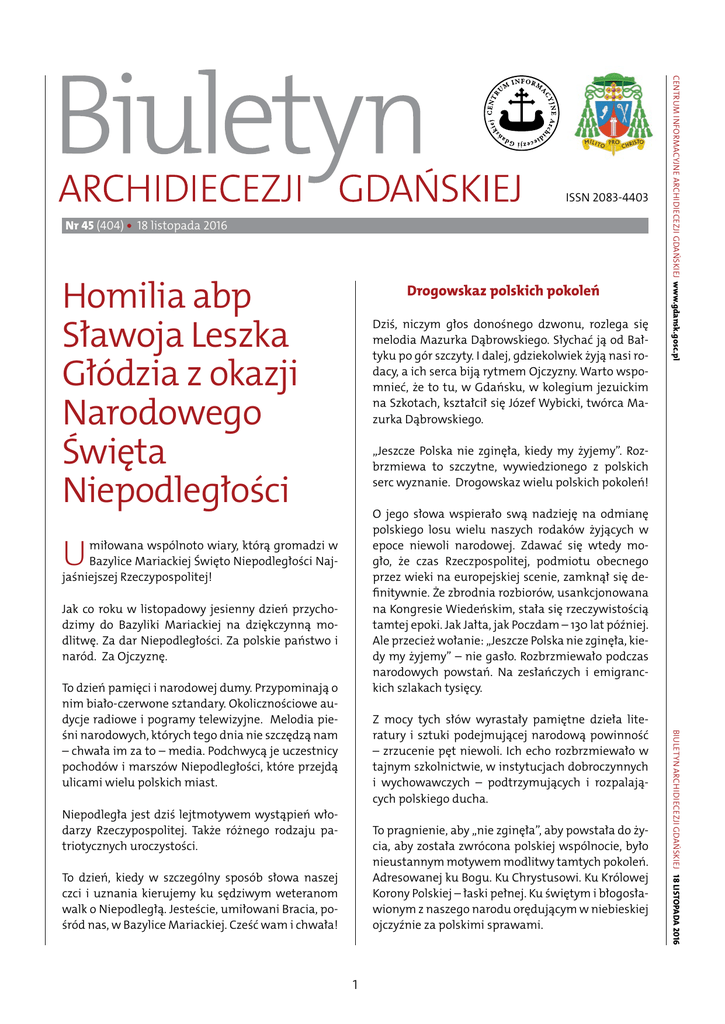 Nr 45 (404) • 18 listopada 2016 Homilia abp Sławoja Leszka Głódzia z okazji Narodowego Święta Niepodległości Drogowskaz polskich pokoleń Dziś, niczym głos donośnego dzwonu, rozlega się melodia Mazurka Dąbrowskiego. Słychać ją od Bałtyku po gór szczyty. I dalej, gdziekolwiek żyją nasi rodacy, a ich serca biją rytmem Ojczyzny. Warto wspomnieć, że to tu, w Gdańsku, w kolegium jezuickim na Szkotach, kształcił się Józef Wybicki, twórca Mazurka Dąbrowskiego. Centrum Informacyjne Archidiecezji Gdańskiej www.gdansk.gosc.pl ISSN 2083-4403 „Jeszcze Polska nie zginęła, kiedy my żyjemy”. Rozbrzmiewa to szczytne, wywiedzionego z polskich serc wyznanie. Drogowskaz wielu polskich pokoleń! O jego słowa wspierało swą nadzieję na odmianę polskiego losu wielu naszych rodaków żyjących w epoce niewoli narodowej. Zdawać się wtedy mogło, że czas Rzeczpospolitej, podmiotu obecnego przez wieki na europejskiej scenie, zamknął się definitywnie. Że zbrodnia rozbiorów, usankcjonowana na Kongresie Wiedeńskim, stała się rzeczywistością tamtej epoki. Jak Jałta, jak Poczdam – 130 lat później. Ale przecież wołanie: „Jeszcze Polska nie zginęła, kiedy my żyjemy” – nie gasło. Rozbrzmiewało podczas narodowych powstań. Na zesłańczych i emigranckich szlakach tysięcy. U miłowana wspólnoto wiary, którą gromadzi w Bazylice Mariackiej Święto Niepodległości Najjaśniejszej Rzeczypospolitej! Jak co roku w listopadowy jesienny dzień przychodzimy do Bazyliki Mariackiej na dziękczynną modlitwę. Za dar Niepodległości. Za polskie państwo i naród. Za Ojczyznę. Z mocy tych słów wyrastały pamiętne dzieła literatury i sztuki podejmującej narodową powinność – zrzucenie pęt niewoli. Ich echo rozbrzmiewało w tajnym szkolnictwie, w instytucjach dobroczynnych i wychowawczych – podtrzymujących i rozpalających polskiego ducha. Niepodległa jest dziś lejtmotywem wystąpień włodarzy Rzeczypospolitej. Także różnego rodzaju patriotycznych uroczystości. To pragnienie, aby „nie zginęła”, aby powstała do życia, aby została zwrócona polskiej wspólnocie, było nieustannym motywem modlitwy tamtych pokoleń. Adresowanej ku Bogu. Ku Chrystusowi. Ku Królowej Korony Polskiej – łaski pełnej. Ku świętym i błogosławionym z naszego narodu orędującym w niebieskiej ojczyźnie za polskimi sprawami. To dzień, kiedy w szczególny sposób słowa naszej czci i uznania kierujemy ku sędziwym weteranom walk o Niepodległą. Jesteście, umiłowani Bracia, pośród nas, w Bazylice Mariackiej. Cześć wam i chwała! 1 Biuletyn Archidiecezji Gdańskiej 18 listopada 2016 To dzień pamięci i narodowej dumy. Przypominają o nim biało-czerwone sztandary. Okolicznościowe audycje radiowe i pogramy telewizyjne. Melodia pieśni narodowych, których tego dnia nie szczędzą nam – chwała im za to – media. Podchwycą je uczestnicy pochodów i marszów Niepodległości, które przejdą ulicami wielu polskich miast. Centrum Informacyjne Archidiecezji Gdańskiej www.gdansk.gosc.pl nr 45 (404) Nadszedł dzień 11 listopada. „Lud, który siedział w ciemności ujrzał światłość wielką” (Mt 4, 16). Patrzymy nań, niczym na tę noc wyzwolenia, o której mówi Księga Mądrości, zapowiedziana przodkom narodu wybranego, „by nabrali otuchy, wiedząc niechybnie, jakim przysięgom zawierzali” (Mdr 18, 6). Pierwszy dzień Polski Niepodległej. Godny naszego, powtarzanego z roku na rok, polskiego Te Deum laudamus. To wiara uczy nas ufności w Bożą Opatrzność. Przyjmowania z pokorą jej rozrządzeń, które, bywa i tak, Bóg pisze na liniach krzywych. Trzeba czasem lat, aby je rozpoznać. Zrozumieć ich zbawczy sen. Wiedzieli o tym przodkowie nasi, kiedy u schyłku XVIII wieku, w okresie politycznych i duchowych przemian, podjęli zamiar budowy w stolicy Rzeczypospolitej Świątyni Opatrzności Bożej – wotum narodu za drogę dziejów, za dzieło Konstytucji 3 maja. Dzień wdzięczności wyrażanej przez synów i córki naszego narodu, którzy przez swe życie idą drogą 11 listopada. A to droga miłości ku Ojczyźnie, naszej matce. Odpowiedzialności za jej los. Szacunku dla praw ojczystych. Pewna, sprawdzona, wytyczona trudem pokoleń droga Niepodległej. Droga wspólnoty, której w takim dniu jak ten „przystoi pieśń chwały”. Droga, której najgłębszy sens, istotę i piękno ujmują słowa psalmu responsoryjnego dzisiejszej Mszy św.: „Błogosławiony lud, którego Pan jest Bogiem, naród, który On wybrał na dziedzictwo dla siebie”. Czyż nie było to rozrządzenie Bożej Opatrzności, że to dopiero naszemu pokoleniu przyszło ten zamiar zrealizować? Dziś na stołecznych, wilanowskich polach, dzień poświęcenia Świątyni Opatrzności Bożej. Wotum niepodległego narodu i państwa. Niechaj z jej monumentalnych murów pokolenia naszego czasu kierują modlitwę zawierzenia i ufności ku Bożej Opatrzności. Dziękowaliśmy za godzinę początku Umiłowani! Wielki dar Bożej Opatrzności W tym roku Święto Niepodległości ujmujemy w perspektywie wielkiej rocznicy – 1050-lecia Chrztu Polski. Najszczytniejszego wydarzenia w dziejach Ojczyzny. Najwyższe władze Rzeczypospolitej z Panem Prezydentem na czele, biskupi, kapłani, reprezentacja narodu pielgrzymowali wiosną tam, gdzie Polska Piastowska się rodziła. Na Ostrów Lednicki, na poznański Ostrów Tumski, na Wzgórze Lecha w Gnieźnie. Do miejsc, gdzie w Imię Ojca i Syna, i Ducha Świętego, przyoblekał się w szatę chrzcielną polski naród i jego państwo. Gdzie w grunt naszej ojczyzny po raz pierwszy został wbity Chrystusowy Krzyż. Gdzie rozpoczynał swą drogę święty, powszechny i apostolski Kościół. Znak przymierza Chrystusa z odkupionym ludem. Umiłowani! Biuletyn Archidiecezji Gdańskiej 18 lisopada 2016 Dziś cząstka polskiego narodu, dla której ważne są ideały 11 listopada 1918 roku, zgromadzona w Bazylice Mariackiej, dziękuj