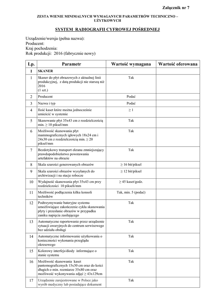 Załącznik nr 7 ZESTA WIENIE MINIMALNYCH WYMAGANYCH PARAMETRÓW TECHNICZNO – UŻYTKOWYCH SYSTEM RADIOGRAFII CYFROWEJ POŚREDNIEJ Urządzenie/wersja (pełna nazwa): Producent: Kraj pochodzenia: Rok produkcji: 2016 (fabrycznie nowy) Lp. Parametr Wartość wymagana I SKANER 1 Skaner do płyt obrazowych z aktualnej linii produkcyjnej, z datą produkcji nie starszą niż 2016 (1 szt.) Tak 2 Producent Podać 3 Nazwa i typ Podać 4 Ilość kaset które można jednocześnie umieścić w systemie ≥1 5 Skanowanie płyt 35x43 cm z rozdzielczością min. ≥ 10 piksel/mm Tak 6 Możliwość skanowania płyt mammograficznych igłowych 18x24 cm i 24x30 cm z rozdzielczością min. ≥ 20 piksel/mm Tak 7 Bezdotykowy transport ekranu zmniejszający prawdopodobieństwo powstawania artefaktów na obrazie Tak 8 Skala szarości generowanych obrazów ≥ 16 bit/piksel 9 Skala szarości obrazów wysyłanych do archiwizacji i na stacje robocze ≥ 12 bit/piksel 10 Wydajność skanowania płyt 35x43 cm przy rozdzielczości 10 pikseli/mm 11 Możliwość podłączenia kilku konsoli techników 12 Podtrzymywanie bateryjne systemu umożliwiające zakończenie cyklu skanowania płyty i przesłanie obrazów w przypadku zaniku napięcia zasilającego Tak 13 Automatyczne raportowanie przez urządzenie sytuacji awaryjnych do centrum serwisowego bez udziału obsługi Tak 14 Automatyczne informowanie użytkowania o konieczności wykonania przeglądu okresowego Tak 15 Kolorowy interfejs/diody informujące o stanie systemu Tak 16 Możliwość skanowania kaset pantomograficznych 15x30 cm oraz do kości długich o min. rozmiarze 35x80 cm oraz możliwość wykonywania zdjęć ≥ 43x129cm Tak 17 Urządzenie zarejestrowane w Polsce jako wyrób medyczny lub posiadające dokument Tak ≥ 45 kaset/godz. Tak, min. 5 (podać) Wartość oferowana (certyfikat CE lub deklarację zgodności CE) właściwy dla urządzenia / oprogramowania stwierdzający zgodność z dyrektywą 93/42/EEC x II Płyty z kasetami 1 18x24 cm 2 szt. 2 24x30 cm 2 szt. 3 35x35 cm 2 szt. 4 35x43 cm 2 szt. 5 Gwarantowana przez producenta trwałość płyty (ilość cykli odczytu i kasowania) 6 Kaseta nie zintegrowana z ekranem (oddzielny element), umożliwiająca wymianę samej płyty obrazowej Tak 7 Kasety zarejestrowane w Polsce jako wyrób medyczny lub posiadające dokument (certyfikat CE lub deklarację zgodności CE) właściwy dla urządzenia / oprogramowania stwierdzający zgodność z dyrektywą 93/42/EEC. Tak III Stacja technika (1 szt.) 1 Stanowisko technika niezintegrowane ze skanerem (czytnikiem) o min. parametrach: Intel core i5 , 2 GB RAM, 500 GB HDD Tak Interfejs użytkownika w języku polskim Tak 2 ≥ 45.000 x ≥ 19” 3 Przekątna ekranu monitora dotykowego 4 Wprowadzanie danych przy pomocy ekranu dotykowego oraz przy pomocy klawiatury i myszki Tak 5 Wprowadzanie danych przy pomocy czytnika kodu kreskowego Tak 6 Pobieranie listy pacjentów z systemu RIS poprzez mechanizm DICOM WORKLIST Tak 7 Dołączanie danych demograficznych pacjenta i rodzaju badaniu do obrazu CR przed i po ekspozycji Tak 8 Dostęp do stacji tylko dla osób uprawnionych przez logowanie Tak 9 Wielopoziomowy dostęp do zaawansowanych opcji zależny od uprawnień nadanych poszczególnym technikom. Tak 10 Podstawowe oprogramowanie do obróbki zeskanowanych obrazów: - zmiana zaczernienia i kontrastu, - obracanie obrazu, - prezentacja pozytyw – negatyw - powiększenie - pomniejszenie Tak 11 Automatyczne dodawanie do obrazu skali centymetrowej Tak 12 Umieszczania komentarzy w dowolnym miejscu na zeskanowanym obrazie Tak 13 Ilość zdefiniowanych elektronicznych markerów (znaczników) ≥ 40 x 14 Wyświetlanie na ekranie znacznika umożliwiającego jednoznaczną identyfikację kierunku i narożnika kasety Tak 15 Wydruk obrazu w trybie TRUE-SIZE (skala 1:1) a w przypadku wydruku na mniejszym filmie możliwość kadrowania obrazu Tak 16 Obsługa kilku skanerów jednocześnie 17 Uzyskiwania na stacji informacji o statusie suchego systemu wydruku Tak 18 Transmisja obrazu przez technika do wybranych wielu miejsc docelowych Tak 19 Kompozytor wydruków i wydruk obrazów bezpośrednio ze stacji technika poprzez mechanizm DICOM Print, podział kliszy min. 1x1, 1x2, 1x4 Tak 20 Wpisywanie do systemu danych o parametrach ekspozycji (kV, mAs) Tak ≥ 2 skanery RADIOLOGICZNY SYSTEM INFORMATYCZNY RIS Producent: Nazwa : Lp. Parametr Wartość wymagana 1 Konfiguracja systemu obiegu informacji RIS dla potrzeb pracowni RTG Tak 2 System nie wymaga instalacji, działa w oparciu o przeglądarkę internetową, min. Internet Explorer, FireFox Tak 3 Nielimitowana ilość stanowisk - możliwość rejestracji pacjenta oraz obsługi badania na dowolnym komputerze w jednostce. Tak 4 System umożliwia rejestrację zleceń wewnętrznych i zewnętrznych Tak 5 Rejestracja zgodna z wymogami sprawozdawczości elektronicznej do NFZ. Tak 6 Rejestracja zleceń od pacjentów prywatnych Tak 7 Program RIS pozwala na dwa typy rejestracji: a) na dzień bieżący bez wskazania konkretnej godziny badania. b) zaplanowanie wykonania badania z wykorzystaniem terminarza obsługującego jednocześnie wiele pracowni diagnostycznych. Tak 8 Terminarz umożliwia bieżący podgląd ilości zarejestrowanych pacjentów z podziałem na pacjentów ambulatoryjnych i pozostałych oraz podgląd wykorzystanych punktów NFZ dla zarejestrowanych pacjentów ambulatoryjnych w danym miesiącu i od początku cyklu rozliczeniowego. Tak 9 System ma wbudowane dwa typy terminarzy: a) uniemożliwiający nakładanie się terminów badań specjalistycznych (TK, MR) na jednym aparacie. b) pozwalający na rejestrowanie pacjentów na przedziały czasowe a nie konkretne godziny – przedziały czasowe o dowolnej wielkości (przedział godzinowy, kilku godzinowy, dzienny), w którym wybór aparatu następuje dopiero po zgłoszeniu się pacjenta na badanie Tak 10 Możliwość rejestrowania dla pacjenta kilku procedur jednocześnie – zestaw badań. Tak 11 M