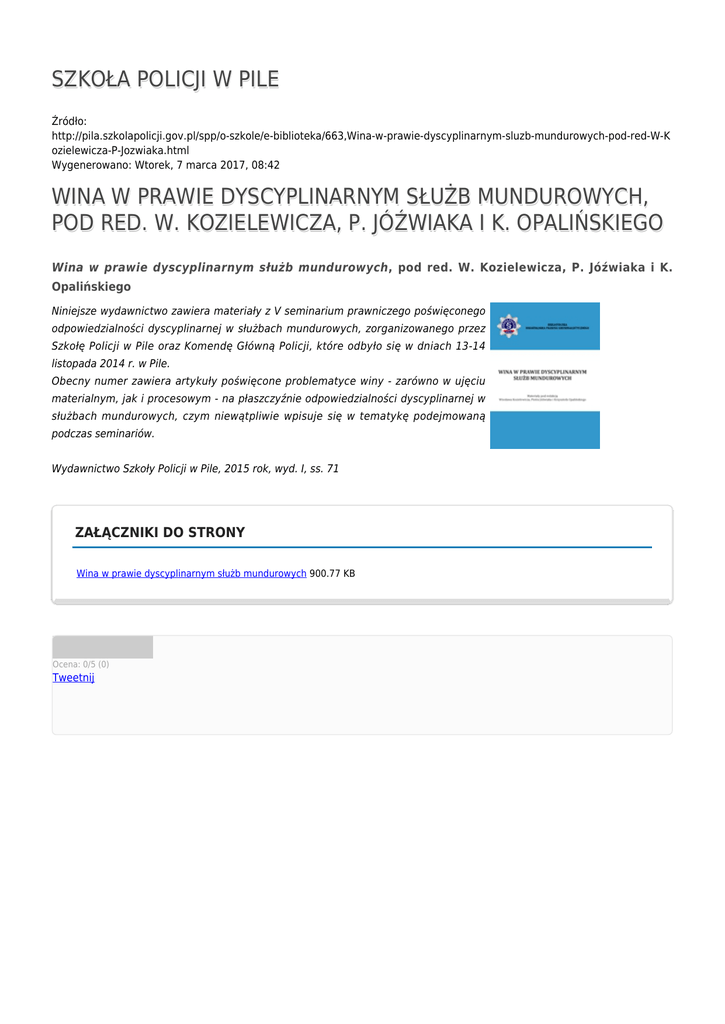 SZKOŁA POLICJI W PILE Źródło: http://pila.szkolapolicji.gov.pl/spp/o-szkole/e-biblioteka/663,Wina-w-prawie-dyscyplinarnym-sluzb-mundurowych-pod-red-W-K ozielewicza-P-Jozwiaka.html Wygenerowano: Wtorek, 7 marca 2017, 08:42 WINA W PRAWIE DYSCYPLINARNYM SŁUŻB MUNDUROWYCH, POD RED. W. KOZIELEWICZA, P. JÓŹWIAKA I K. OPALIŃSKIEGO Wina w prawie dyscyplinarnym służb mundurowych, pod red. W. Kozielewicza, P. Jóźwiaka i K. Opalińskiego Niniejsze wydawnictwo zawiera materiały z V seminarium prawniczego poświęconego odpowiedzialności dyscyplinarnej w służbach mundurowych, zorganizowanego przez Szkołę Policji w Pile oraz Komendę Główną Policji, które odbyło się w dniach 13-14 listopada 2014 r. w Pile. Obecny numer zawiera artykuły poświęcone problematyce winy - zarówno w ujęciu materialnym, jak i procesowym - na płaszczyźnie odpowiedzialności dyscyplinarnej w służbach mundurowych, czym niewątpliwie wpisuje się w tematykę podejmowaną podczas seminariów. Wydawnictwo Szkoły Policji w Pile, 2015 rok, wyd. I, ss. 71 ZAŁĄCZNIKI DO STRONY Wina w prawie dyscyplinarnym służb mundurowych 900.77 KB Ocena: 0/5 (0) Tweetnij