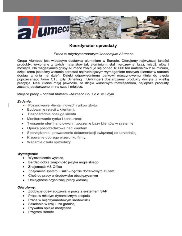 Koordynator sprzedaży Praca w międzynarodowym konsorcjum Alumeco Grupa Alumeco jest wiodącym dostawcą aluminium w Europie. Oferujemy najwyższej jakości produkty, wykonane z takich materiałów jak aluminium, stal nierdzewna, brąz, miedź, ołów i mosiądz. Na magazynach grupy Alumeco znajduje się ponad 18.000 ton materiałów z aluminium, dzięki temu jesteśmy w stanie sprostać najtrudniejszym wymaganiom naszych klientów w ramach dostaw z dnia na dzień. Dzięki odpowiedniemu parkowi maszynowemu (linia do cięcia poprzecznego taśm CTL, piły Schelling i Behringer) dostarczamy produkty docięte z wielką precyzją. Nasi klienci mają pewność, że dzięki właściwym rozwiązaniom, najlepsze produkty zostaną dostarczone im na czas i miejsce. Miejsce pracy – oddział Aluteam –Alumeco Sp. z o.o. w Gdyni Zadania: Pozyskiwanie klienta i nowych rynków zbytu; Budowanie relacji z klientami; Bezpośrednia obsługa klienta Monitorowanie rynku i konkurencji Tworzenie ofert handlowych i tworzenie bazy klientów w systemie Opieka posprzedażowa nad klientem Sporządzenie i prowadzenie dokumentacji związanej ze sprzedażą Kreowanie dobrego wizerunku firmy; Wsparcie działu sprzedaży Wymagania: Wykształcenie wyższe, Bardzo dobra znajomość języka angielskiego Znajomość MS Office Znajomość systemu SAP – będzie dodatkowym atutem Chęć do pracy w środowisku obcojęzycznym Umiejętność organizacji pracy własnej Oferujemy: Zdobycie doświadczenia w pracy z systemem SAP Praca w młodym dynamicznym zespole Praca w międzynarodowym środowisku Szkolenia w kraju i za granicą Prywatna opieka medyczna Program Benefit Prosimy o przesyłanie cv w języku angielskim na adres mailowy: [email protected] Oferta ważna do 30-11-2016. Prosimy o zamieszczenie w cv następującej klauzuli: Wyrażam zgodę na przetwarzanie moich danych osobowych na potrzeb niezbędnych do realizacji procesu rekrutacji zgodnie z Ustawą z dn. 29.08.97 o Ochronie Danych Osobowych Dz. Ust. 133 poz. 883.