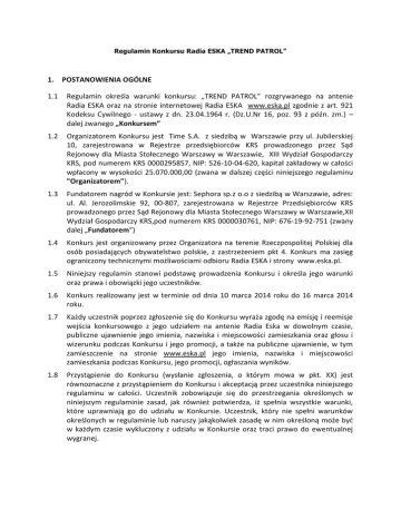 Regulamin Konkursu Radia ESKA „TREND PATROL” 1. POSTANOWIENIA OGÓLNE 1.1 Regulamin określa warunki konkursu: „TREND PATROL” rozgrywanego na antenie Radia ESKA oraz na stronie internetowej Radia ESKA www.eska.pl zgodnie z art. 921 Kodeksu Cywilnego - ustawy z dn. 23.04.1964 r. (Dz.U.Nr 16, poz. 93 z późn. zm.) – dalej zwanego „Konkursem” 1.2 Organizatorem Konkursu jest Time S.A. z siedzibą w Warszawie przy ul. Jubilerskiej 10, zarejestrowana w Rejestrze przedsiębiorców KRS prowadzonego przez Sąd Rejonowy dla Miasta Stołecznego Warszawy w Warszawie, XIII Wydział Gospodarczy KRS, pod numerem KRS 0000295857, NIP: 526-10-04-620, kapitał zakładowy w całości wpłacony w wysokości 25.070.000,00 (zwana w dalszej części niniejszego regulaminu "Organizatorem"). 1.3 Fundatorem nagród w Konkursie jest: Sephora sp.z o.o z siedzibą w Warszawie, adres: ul. Al. Jerozolimskie 92, 00-807, zarejestrowana w Rejestrze Przedsiębiorców KRS prowadzonego przez Sąd Rejonowy dla Miasta Stołecznego Warszawy w Warszawie,XII Wydział Gospodarczy KRS,pod numerem KRS 0000030761, NIP: 676-19-92-751 (zwany dalej „Fundatorem”) 1.4 Konkurs jest organizowany przez Organizatora na terenie Rzeczpospolitej Polskiej dla osób posiadających obywatelstwo polskie, z zastrzeżeniem pkt 4. Konkurs ma zasięg ograniczony technicznymi możliwościami odbioru Radia ESKA i strony www.eska.pl. 1.5 Niniejszy regulamin stanowi podstawę prowadzenia Konkursu i określa jego warunki oraz prawa i obowiązki jego uczestników. 1.6 Konkurs realizowany jest w terminie od dnia 10 marca 2014 roku do 16 marca 2014 roku. 1.7 Każdy uczestnik poprzez zgłoszenie się do Konkursu wyraża zgodę na emisję i reemisje wejścia konkursowego z jego udziałem na antenie Radia Eska w dowolnym czasie, publiczne ujawnienie jego imienia, nazwiska i miejscowości zamieszkania oraz głosu i wizerunku podczas Konkursu i jego promocji, a także na publiczne ujawnienie, w tym zamieszczenie na stronie www.eska.pl jego imienia, nazwiska i miejscowości zamieszkania podczas Konkursu, jego promocji, ogłaszania wyników. 1.8 Przystąpienie do Konkursu (wysłanie zgłoszenia, o którym mowa w pkt. XX) jest równoznaczne z przystąpieniem do Konkursu i akceptacją przez uczestnika niniejszego regulaminu w całości. Uczestnik zobowiązuje się do przestrzegania określonych w niniejszym regulaminie zasad, jak również potwierdza, iż spełnia wszystkie warunki, które uprawniają go do udziału w Konkursie. Uczestnik, który nie spełni warunków określonych w regulaminie lub naruszy jakąkolwiek zasadę w nim określoną może być w każdym czasie wykluczony z udziału w Konkursie oraz traci prawo do ewentualnej wygranej. 2. Nagrody 2.1 Nagrodą główną w Konkursie są wizyty Trend Patrolu, każda o wartości 696 PLN brutto. Łącznie w Konkursie przyznanych zostanie 14 (czternaście) nagród głównych. Trend Patrol to wizyta makijażystek Sephora, które w domu zwycięzcy malują zwycięzcę i trzy zaproszone przez nią koleżanki. Wizyty Trend Patrolu odbywają się według ustalonego harmonogramu Warszawa (poniedziałek 10 marca 2014 r.) Łódź (wtorek 11 marca 2014r.) Kraków (środa 12 marca 2014r.) Katowice (czwartek 13 marca 2014 r.) Wrocław (piątek 14 marca 2014r.) Poznań (sobota 15 marca 2014r.) Gdańsk (niedziela 16 marca 2014r.) Wizyty trend patrolu odbywają się w godzinach 16.00 i 20.00 z zastrzeżeniem pkt 3.8. 2.2 Nagrodami pocieszenia w Konkursie są bony upominkowe do perfumerii Sephora o wartości 100 PLN brutto. Łącznie w Konkursie przyznanych zostanie 7 nagród pocieszenia. 2.3 Organizator oświadcza, iż wszystkie nagrody z obowiązującymi przepisami prawa podatkowego. 2.4 Organizator nie ponosi odpowiedzialności za niemożność odbioru lub nieodebranie którejkolwiek nagrody, z jakiejkolwiek przyczyny leżącej po stronie nagrodzonego uczestnika. 2.5 Organizator nie ponosi odpowiedzialności za zmianę miejsca zamieszkania i/lub podanego przez uczestnika Konkursu adresu lub zmianę innych danych – uniemożliwiającą kontakt z tym uczestnikiem lub odebranie przez niego /nagrody. 2.6 O szczegółach odbioru i realizacji nagród zwycięzca każdej edycji Konkursu zostanie poinformowany przez Organizatora za pośrednictwem rozmowy telefonicznej. 2.7 Przy odbiorze przez zwycięzcę edycji Konkursu nagrody zobowiązany jest on okazać dokument potwierdzający jego tożsamość lub w przypadku odbioru tej nagrody przez pełnomocnika zwycięzcy zobowiązany jest on okazać pisemne upoważnienie od zwycięzcy, który wygrał daną nagrodę, zawierające następujące informacje: imię nazwisko, adres, numer i seria dowodu osobistego, telefon kontaktowy tego zwycięzcy oraz adnotację o upoważnieniu określonej osoby do odbioru w jego imieniu danej nagrody, jak również podpis tego zwycięzcy wraz z danymi osoby odbierającej czyli imieniem, nazwiskiem, serią i numerem dowodu osobistego oraz telefonem odbiorcy. W przypadku niespełnienia przez osobę podającą się za pełnomocnika zwycięzcy powyższych warunków nagroda nie będzie jej wydany. 2.8 Wszystkie nagrody pozostają własnością Fundatora do momentu przekazania ich odpowiednio zwycięzcy każdej edycji Konkursu. 2.9 Nagrodę pocieszenia ufundowaną przez Fundatora nagrodzonemu uczestnikowi prześle Organizator najpóźniej do 30 kwietnia 2014 r. zostaną wydane zgodnie 2.10 Realizacja nagrody głównej spoczywa na Fundatorze. Za jej prawidłową realizację odpowiada Organizator. 3. Zasady uczestnictwa w konkursie 3.1 Ogólne zasady Konkursu podawane są w programie Radia Eska i w zwiastunach promocyjnych Konkursu emitowanych na antenie Radia Eska oraz na stronie internetowej WWW.eska.pl, zakładka KONKURSY 3.2 W czasie trwania Konkursu odbędzie się łącznie 7 (siedem) edycji Konkursu. Poszczególne edycje odbywać się będą zgodnie z harmonogramem trwania Konkursu. Harmonogramem edycji Konkursu: a) I Edycja - 10 03 2014r. b) I