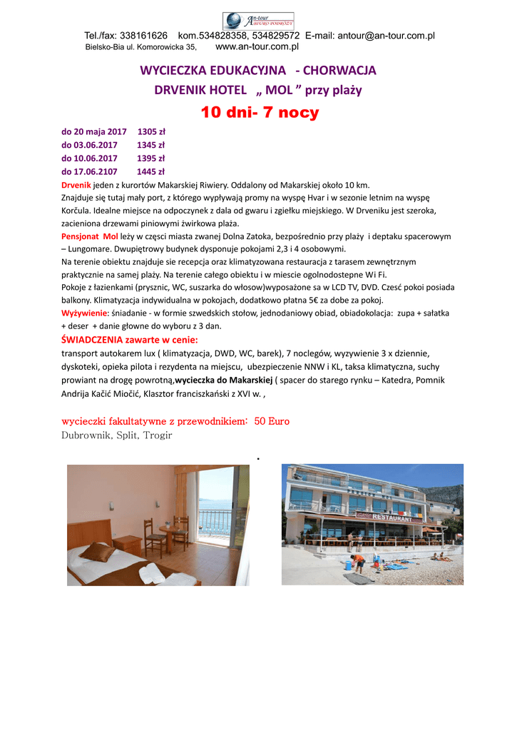Tel./fax: 338161626 kom.534828358, 534829572 E-mail: [email protected] www.an-tour.com.pl Bielsko-Bia ul. Komorowicka 35, WYCIECZKA EDUKACYJNA - CHORWACJA DRVENIK HOTEL „ MOL ” przy plaży 10 dni- 7 nocy do 20 maja 2017 1305 zł do 03.06.2017 1345 zł do 10.06.2017 1395 zł do 17.06.2107 1445 zł Drvenik jeden z kurortów Makarskiej Riwiery. Oddalony od Makarskiej około 10 km. Znajduje się tutaj mały port, z którego wypływają promy na wyspę Hvar i w sezonie letnim na wyspę Korčula. Idealne miejsce na odpoczynek z dala od gwaru i zgiełku miejskiego. W Drveniku jest szeroka, zacieniona drzewami piniowymi żwirkowa plaża. Pensjonat Mol leży w częsci miasta zwanej Dolna Zatoka, bezpośrednio przy plaży i deptaku spacerowym – Lungomare. Dwupiętrowy budynek dysponuje pokojami 2,3 i 4 osobowymi. Na terenie obiektu znajduje sie recepcja oraz klimatyzowana restauracja z tarasem zewnętrznym praktycznie na samej plaży. Na terenie całego obiektu i w miescie ogolnodostepne Wi Fi. Pokoje z łazienkami (prysznic, WC, suszarka do włosow)wyposażone sa w LCD TV, DVD. Czesć pokoi posiada balkony. Klimatyzacja indywidualna w pokojach, dodatkowo płatna 5€ za dobe za pokoj. Wyżywienie: śniadanie - w formie szwedskich stołow, jednodaniowy obiad, obiadokolacja: zupa + sałatka + deser + danie głowne do wyboru z 3 dan. ŚWIADCZENIA zawarte w cenie: transport autokarem lux ( klimatyzacja, DWD, WC, barek), 7 noclegów, wyzywienie 3 x dziennie, dyskoteki, opieka pilota i rezydenta na miejscu, ubezpieczenie NNW i KL, taksa klimatyczna, suchy prowiant na drogę powrotną,wycieczka do Makarskiej ( spacer do starego rynku – Katedra, Pomnik Andrija Kačić Miočić, Klasztor franciszkański z XVI w. , wycieczki fakultatywne z przewodnikiem: 50 Euro Dubrownik, Split, Trogir