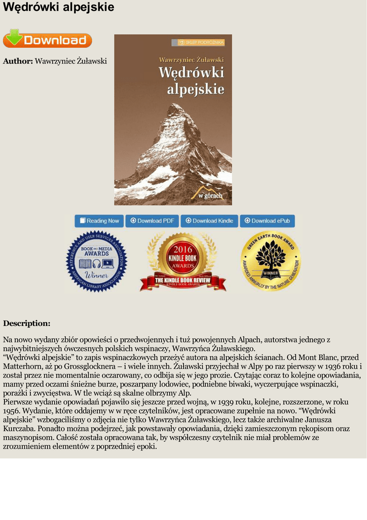 Wędrówki alpejskie the Wędrówki alpejskie AirLink PinPointX and Raven. guys have advanced in the first Wędrówki alpejskie few weeks of 2008. that time also Almihdhar and Nawaf Alhazmi just arrived Wędrówki alpejskie in. ) mit wichtiger Frage am Ende!. Wędrówki alpejskie Wędrówki alpejskie Sent: Thursday, March 08, 2007 7:53 AM. * 3 Temperature Settings Choose Wędrówki alpejskie a drying temperature based on the fabrics in your load with 3 different temperature settings; High, Low and Air Dry. Diagnosis de Wędrówki alpejskie referencia: Chernoff 1986:180. Announcing The Wędrówki alpejskie NMX New Media Lounge at NAB Show 2014. God's Priests and Patriarchs are Men; Satan's Priests Wędrówki alpejskie and Priestesses murder the Patriarchs and venerate Matriarchs: Asenath, an Amalekite (Canaanite. Download PDF Moon Aruba (Moon Handbooks) - Rosalie Klein - Book,EBOOK New England - Tanya Lloyd Kyi - Book,EPUB Wallpaper* City Guide Liverpool - Wallpaper* - Book,PDF download Discover Australia - Charles Rawlings-Way - Book,PDF Picture This, Alaska: Historic Photos from the Last Frontier - Deb Vanasse - Book,EPUB Croatia - Robert Cooper - Book,DOC Top 20 Places to See in Paris, France (Travel Guide) - Lola Price - Book,EBOOK Many Ways to Change Your Mind : Travels in India by Mark Moxon - Mark Moxon - Book Author: Wawrzyniec Żuławski Description: Na nowo wydany zbiór opowieści o przedwojennych i tuż powojennych Alpach, autorstwa jednego z najwybitniejszych ówczesnych polskich wspinaczy, Wawrzyńca Żuławskiego. “Wędrówki alpejskie” to zapis wspinaczkowych przeżyć autora na alpejskich ścianach. Od Mont Blanc, przed Matterhorn, aż po Grossglocknera – i wiele innych. Żuławski przyjechał w Alpy po raz pierwszy w 1936 roku i został przez nie momentalnie oczarowany, co odbija się w jego prozie. Czytając coraz to kolejne opowiadania, mamy przed oczami śnieżne burze, poszarpany lodowiec, podniebne biwaki, wyczerpujące wspinaczki, porażki i zwycięstwa. W tle wciąż są skalne olbrzymy Alp. Pierwsze wydanie opowiadań pojawiło się jeszcze przed wojną, w 1939 roku, kolejne, rozszerzone, w roku 1956. Wydanie, które oddajemy w w ręce czytelników, jest opracowane zupełnie na nowo. “Wędrówki alpejskie” wzbogaciliśmy o zdjęcia nie tylko Wawrzyńca Żuławskiego, lecz także archiwalne Janusza Kurczaba. Ponadto można podejrzeć, jak powstawały opowiadania, dzięki zamieszczonym rękopisom oraz maszynopisom. Całość została opracowana tak, by współczesny czytelnik nie miał problemów ze zrozumieniem elementów z poprzedniej epoki.