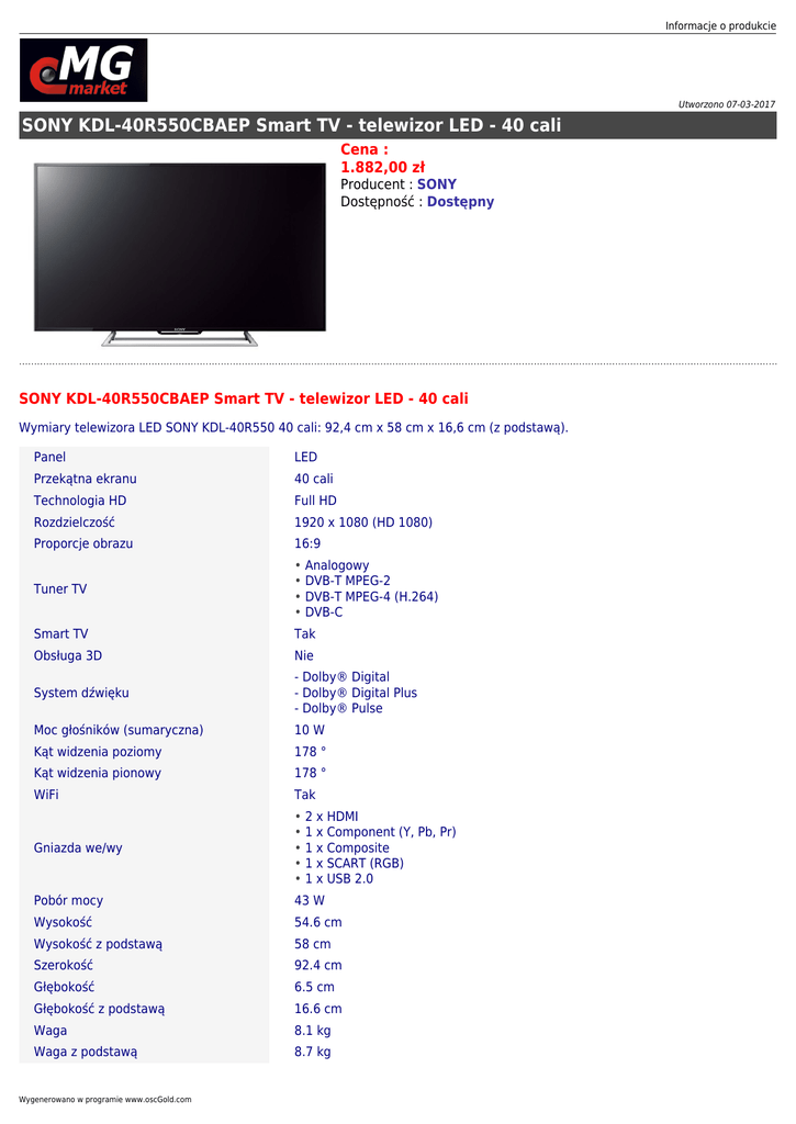 Informacje o produkcie Utworzono 07-03-2017 SONY KDL-40R550CBAEP Smart TV - telewizor LED - 40 cali Cena : 1.882,00 zł Producent : SONY Dostępność : Dostępny SONY KDL-40R550CBAEP Smart TV - telewizor LED - 40 cali Wymiary telewizora LED SONY KDL-40R550 40 cali: 92,4 cm x 58 cm x 16,6 cm (z podstawą). Panel LED Przekątna ekranu 40 cali Technologia HD Full HD Rozdzielczość 1920 x 1080 (HD 1080) Proporcje obrazu 16:9 Tuner TV • Analogowy • DVB-T MPEG-2 • DVB-T MPEG-4 (H.264) • DVB-C Smart TV Tak Obsługa 3D Nie System dźwięku - Dolby® Digital - Dolby® Digital Plus - Dolby® Pulse Moc głośników (sumaryczna) 10 W Kąt widzenia poziomy 178 ° Kąt widzenia pionowy 178 ° WiFi Tak Gniazda we/wy • 2 x HDMI • 1 x Component (Y, Pb, Pr) • 1 x Composite • 1 x SCART (RGB) • 1 x USB 2.0 Pobór mocy 43 W Wysokość 54.6 cm Wysokość z podstawą 58 cm Szerokość 92.4 cm Głębokość 6.5 cm Głębokość z podstawą 16.6 cm Waga 8.1 kg Waga z podstawą 8.7 kg Wygenerowano w programie www.oscGold.com Poproś o instrukcję wypakowania telewizora z kartonu. REKLAMA Balmedia jest pomorską firmą, która zajmuje się nadrukami na płytach DVD, Blu-ray i CD, tłoczeniem płyt, duplikowaniem i nagrywaniem płyt. Przygotowuje także różne opakowania na płyty CD i DVD ze specjalną grafiką. Agencja przygotowuje projekty zgodnie z zamówieniami indywidualnych lub komercyjnych klientów, stosownie do oczekiwań. Oprócz płyt poleca w ofecie również inne materiały reklamowe, takie jak katalogi, wizytówki, ulotki, naklejki i inne. Wykorzystuje do realizacji zamówień płyty do nadruku renomowanych producentów. Największym zainteresowaniem cieszy się tłoczenie płyt i nadruki na płytach CD, DVD, Blu-ray, mini CD i DVD. Firma działa na terenie Trójmiasta, ale realizacje rozsyła po całej Polsce. Dużym atutem firmy jest szybki czas realizacji, niski koszt produkcji, możliwość zmiany projektu oraz próbny cyfrowy nadruk na płytach.