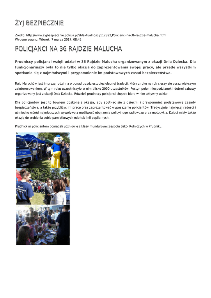 ŻYJ BEZPIECZNIE Źródło: http://www.zyjbezpiecznie.policja.pl/zb/aktualnosci/112892,Policjanci-na-36-rajdzie-malucha.html Wygenerowano: Wtorek, 7 marca 2017, 08:42 POLICJANCI NA 36 RAJDZIE MALUCHA Prudniccy policjanci wzięli udział w 36 Rajdzie Malucha organizowanym z okazji Dnia Dziecka. Dla funkcjonariuszy była to nie tylko okazja do zaprezentowania swojej pracy, ale przede wszystkim spotkania się z najmłodszymi i przypomnienie im podstawowych zasad bezpieczeństwa. Rajd Maluchów jest imprezą rodzinną o ponad trzydziestopięcioletniej tradycji, który z roku na rok cieszy się coraz większym zainteresowaniem. W tym roku uczestniczyło w nim blisko 2000 uczestników. Festyn pełen niespodzianek i dobrej zabawy organizowany jest z okazji Dnia Dziecka. Również prudniccy policjanci chętnie biorą w nim aktywny udział. Dla policjantów jest to bowiem doskonała okazja, aby spotkać się z dziećmi i przypomnieć podstawowe zasady bezpieczeństwa, a także przybliżyć im pracę oraz zaprezentować wyposażenie policjantów. Tradycyjnie najwięcej radości i uśmiechu wśród najmłodszych wywoływała możliwość obejrzenia policyjnego radiowozu oraz motocykla. Dzieci miały także okazję do zrobienia sobie pamiątkowych odbitek linii papilarnych. Prudnickim policjantom pomagali uczniowie z klasy mundurowej Zespołu Szkół Rolniczych w Prudniku. Ocena: 0/5 (0) Tweetnij festyn bezpieczeństwa, bezpieczeństwo, spotkania z policjantami