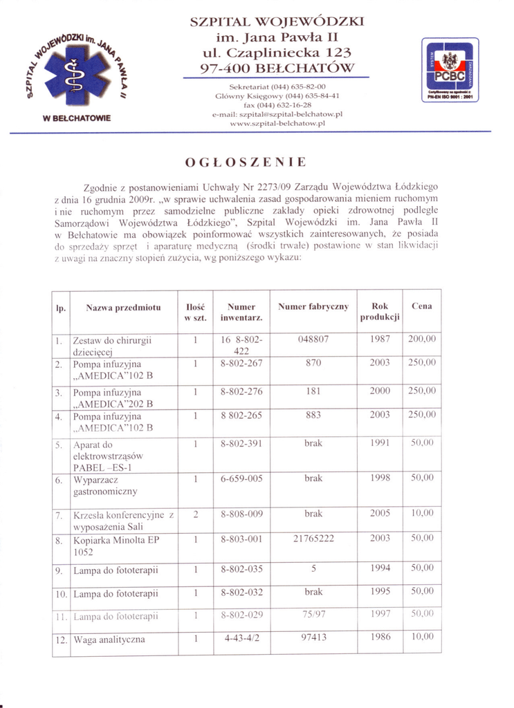• SZPITAL WOJEWÓDZKI im. Jana Pawla II ul. Czapliniecka 123 97 -400 BEJ-CHATÓW Sekretariat (044) 635-82-00 Glówny Ksiegowy (044) 635-84-41 fax (044) 632-16-28 e-mail: [email protected] www.szpital-belchatow.pl W BELCHATOWIE OGLOSZENIE Zgodnie z postanowieniami Uchwaly Nr 2273/09 Zarzadu Województwa Lódzkiego z dnia 16 grudnia 2009r. "w sprawie uchwalenia zasad gospodarowania mieniem ruchomym i nie ruchomym przez samodzielne publiczne zaklady opieki zdrowotnej podlegle Samorzadowi Województwa Lódzkiego", Szpital Wojewódzki im. Jana Pawla II w Belchatowie ma obowiazek poinformowac wszystkich zainteresowanych, ze posiada do sprzedazy sprzet i aparature medyczna (srodki trwale) postawione w stan likwidacji z uwagi na znaczny stopieÓ. zuzycia, wg ponizszego wykazu: l 6. 4. 8. 3. 5. 9. 7. inwentarz. Numer 8-802-276 8-802-267 2003 8-802-035 1994 5EP 8-802-391 1991 brak 6-659-005 88-808-009 802-265 8-803-00 8-802-032 8-802-029 16 Cena 8-802l2005 1995 1997 21765222 1987 75/97 4-43-4/2 1986 97413 2000 181 870 1998 883 50.00 048807 2003 Nazwa przedmiotu 250,00 50,00 50,00 Numer fabryczny Zestaw Krzesla 200,00 10,00 konferencyjne chirurgii 10,00 Pompa infuzyjna Wyparzacz Aparat Lampa do fototerapii do fototerapi iIloscz 2l Lampa Kopiarka Minolta fototerapii Waga analityczna Rok P lp. ABEL -ES-l I 422 produkcji 13. 31. 26. 29. 32. 25. 22. l l 212 8-802-019 1984 87038037 PA 7203 7507 148 81159 4-42-3/7 8-802-575 8-802-451 8-802-458 8-802-014 2000 1987 8-802-465 1993 1026 2004 8-802-283 3709 Inkubator 8413346 8-802-328 1996 35X43 8-802-225 8-802-208 8-802-665 4134 1.00 1988 1.00 8-802-207 8-802-217 8-803-002 2213501 8-802-545 8-802-043 11 4-42-3/1 571 Kratka Centralna lishol odwrócona Zródlo zasilania 1985 1995 7452649 1989 swiatla 1,00 8-802-209 8-802-010 IK-31 85149/86153 88018774 1991 1986 1,00 FAX Canon ECN 2002 2003 05003 4-49-10/1 07659086/20021997 0568 50,00 2002 100,00 2000,00 250,00 200,00 300,00 8350,811981 20,00 Defibrylator 86437 ,85242( 4-49Dialister -2-4-42-31 urzadzenie Ssak Elektryczny Pompa infuzyjna Rektoskop znieczulania + zasi zródlo lacz Gastrofiberoskop GIF -do Aparat do hemodializy z1999 zasilaczem Renatron 8-802-167 (4-49-10/3 (4-49-10/1 (4-49I 0/5)) 8-802-129 4-49-10/23 4-46- 7/1 Osoby zainteresowane zakupem prosimy o kontakt z Dzialem Administracyjno Gospodarczym pod nr tel. 044 63-58-484 i 63-58-249 lub pisemnie na adres: Szpital Wojewódzki im. Jana Pawia 11 97-400 Belchatów, ul. Czaplinecka 123, fax: 44/632-16-28 w tell11inie do dnia 30.04.2010. ! DS. ADMINISTRACYJ Belchatów 12.04.2010 ~ZAS.TEP.CAD tfl~1 CZN ' I " REKTO~U" ( gori'SI i ~CIIeckl I