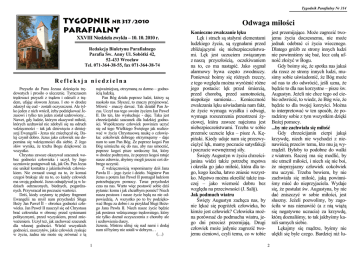Tygodnik Parafialny Nr 314 TYGODNIK Nr 317 /2010 PARAFIALNY XXVIII Niedziela zwykła – 10. 10. 2010 r. Redakcja Biuletynu Parafialnego Parafia Św. Anny Ul. Sobótki 42, 52-433 Wrocław Tel. 071-364-38-55, fax 071-364-38-74 Refleksja niedzielna najważniejszą, otrzymaną za darmo – godnością ludzką. Pan Bóg działa poprzez ludzi, którzy są naokoło nas. Słyszeć, to znaczy przyjmować. Mówić - znaczy dawać. Tak działał Pan Jezus. Uczył nas tego swoim życiem Jan Paweł II. Bo ten, kto wysłuchuje - daje. Taka jest chrześcijański szacunek dla ludzkiej godności. Współczesny człowiek powinien uczyć się od tego Wielkiego Świętego jak realizować w życiu Chrystusową naukę o człowieku: cokolwiek dobrego otrzymujemy - daje nam to sam Pan Bóg. Że poprzez kogoś Pan Bóg uśmiecha się do nas, aby nas umocnić, poprzez kogoś pisze serdeczny list, który w drodze podtrzyma, że poprzez kogoś ratuje nasze zdrowie, abyśmy mogli jeszcze coś dobrego uczynić. Z wdzięcznością wspominamy dziś Jana Pawła II – jego życie i dzieło. Najpierw Pan Jezus a potem Jan Paweł II pomagał ludziom potrzebującym pomocy. Teraz przychodzi czas na nas. Warto więc postawić sobie dziś pytanie: komu i jak chciałbym pomóc? Niech nasza postawa i nasze życie będą na nie odpowiedzią. A wszystko po to by podziękować Bogu za dobro i za przykład Sługi Bożego Jana Pawła II. Niech nasze życie będzie jak postawa wdzięcznego trędowatego, który nie tylko doznał oczyszczenia z choroby ale i uzdrowienia duszy. Jezusie, Mistrzu ulituj się nad nami i dodaj nam sił byśmy nie ustali w dobrym… (…) Przyszło do Pana Jezusa dziesięciu trędowatych i prosiło o uleczenie. Tymczasem trędowaci przyszli z trądem i odeszli z trądem, ufając słowom Jezusa. I oto w drodze zdarzył się cud - zostali oczyszczeni. Ale tylko jeden z nich wrócił, żeby podziękować Jezusowi i tylko ten jeden został uzdrowiony... Nawet, gdy ludzie, którym okazywał miłość, których uzdrawiał nie zdobyli się na odruch wdzięczności – tak jak dziewięciu z dzisiejszej Ewangelii - Jezus nie zniechęcał się. Dalej czynił dobro. Jezus jako człowiek nie dopomina się wdzięczności dla siebie. Z Jego słów wynika, że trzeba Bogu dziękować za wszystko. Chrystus zawsze okazywał szacunek wobec godności człowieka i uczył, by Jego uczniowie postępowali tak, jak On. Pan Jezus nie unikał kontaktu z jakimkolwiek człowiekiem. Nie zwracał uwagi na to, że komuś czegoś brakuje ale na to, co każdy człowiek ma swoją godność. Jezus odnajdywał ją w ludziach odrzuconych, biednych, pogardzanych. Przywracał im poczucie wartości. Dziś, kiedy czytamy tę piękny fragment Ewangelii na myśl nam przychodzi Sługa Boży Jan Paweł II – obrońca godności człowieka. Jan Paweł II nauczył się od Chrystusa brać człowieka w obronę: przed systemami politycznymi, przed wyzyskiem, przed znieważeniem. Uczył też, jak zachować szacunek dla własnej godności. Wśród wszystkich godności, zaszczytów, jakie człowiek zyskuje w życiu, żadna nie może się zrównać z tą 1 Odwaga miłości jest przemijające. Może zagrozić twojemu życiu doczesnemu, nie może jednak odebrać ci życia wiecznego. Dlatego gróźb ze strony innych ludzi nie powinniśmy się bać, lecz całą ufność złożyć w Bogu. Gdy boimy się, że spotka nas jakaś zła rzecz ze strony innych ludzi, musimy sobie uświadomić, że Bóg może od nas to zło odwrócić, jeśli uzna, że będzie to dla nas korzystne – pisze św. Augustyn. Jeżeli nie chce tego od ciebie odwrócić, to wiedz, że Bóg wie, że będzie to dla twojej korzyści. Można to interpretować w ten sposób, że poradzimy sobie z tym wszystkim dzięki Bożej pomocy. ...by nie zachwiała się miłość Gdy chrześcijanin cierpi jakąś krzywdę, niech nie wychodzi z nienawiścią przeciw temu, kto mu ją wyrządził. Byłoby to podobne do walki z wiatrem. Raczej ma się modlić, by nie utracił miłości, i niech się nie boi, że nieprzyjazny człowiek cokolwiek mu uczyni. Trzeba bowiem, by nie zachwiała się miłość, jaką powinniśmy mieć do nieprzyjaciela. Wydaje się, że postulat św. Augustyna, by nie dać zniszczyć w sobie miłości, jest słuszny. Jeżeli pozwolimy, by zagościła w nas nienawiść (a z nią wiążą się negatywne uczucia) za krzywdę, którą doznaliśmy, to tak jakbyśmy karali samych siebie. Lękajmy się mądrze, byśmy nie ulękli się byle czego. Bardziej niż lu- Konieczne zwalczanie lęku Lęk i strach są stałymi elementami ludzkiego życia, są sygnałami przed zbliżającymi się niebezpieczeństwami. Lęk jest uczuciem związanym z naszą przyszłością, oczekiwaniem na to, co ma nastąpić. Jako sygnał alarmowy bywa często zwodniczy. Ponieważ boimy się różnych rzeczy, z tego względu można wyróżnić różne jego postacie: lęk przed śmiercią, przed chorobą, przed samotnością, niepokoje sumienia… Konieczność zwalczania lęku uświadamia nam fakt, że życie wymaga wysiłku i odwagi, wymaga rozszerzenia przestrzeni życiowej, która zawsze najeżona jest niebezpieczeństwami. Trzeba w sobie przemóc uczucie lęku – pisze A. Kępiński. Kiedy udaje nam się przezwyciężyć lęk, mamy poczucie satysfakcji i poczucie wewnętrznej siły. Święty Augustyn w życiu chrześcijanina widzi także potrzebę męstwa i określa go jako miłość, która dla tego, kogo kocha, łatwo zniesie wszystko. Męstwo można określić także inaczej – jako wierność dobru bez względu na przeciwności (J. Salij). Jak podmuch wiatru Święty Augustyn zachęca nas, by nie lękać się pogróżek człowieka, bo kimże jest człowiek? Człowieka można porównać do podmuchu wiatru, jego dni przecież przemijają. Drugi człowiek może jedynie zagrozić twojemu cieniowi, czyli temu, co w tobie 2 Tygodnik Parafialny Nr 317 dzi należy bać się Boga. Możemy bać się jak niewolnicy lub bać 