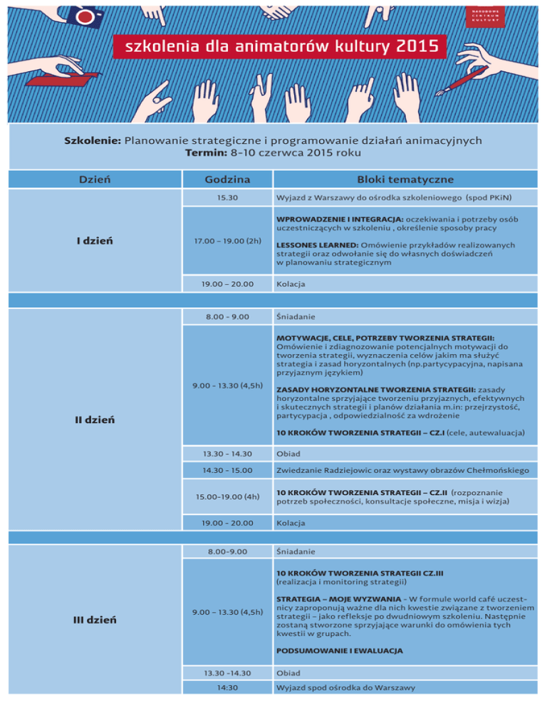 Szkolenie: Planowanie strategiczne i programowanie działań animacyjnych Termin: 8-10 czerwca 2015 roku Dzień Godzina 15.30 Bloki tematyczne Wyjazd z Warszawy do ośrodka szkoleniowego (spod PKiN) WPROWADZENIE I INTEGRACJA: oczekiwania i potrzeby osób uczestniczących w szkoleniu , określenie sposoby pracy I dzień 17.00 – 19.00 (2h) 19.00 – 20.00 8.00 - 9.00 LESSONES LEARNED: Omówienie przykładów realizowanych strategii oraz odwołanie się do własnych doświadczeń w planowaniu strategicznym Kolacja Śniadanie MOTYWACJE, CELE, POTRZEBY TWORZENIA STRATEGII: Omówienie i zdiagnozowanie potencjalnych motywacji do tworzenia strategii, wyznaczenia celów jakim ma służyć strategia i zasad horyzontalnych (np.partycypacyjna, napisana przyjaznym językiem) 9.00 - 13.30 (4,5h) II dzień ZASADY HORYZONTALNE TWORZENIA STRATEGII: zasady horyzontalne sprzyjające tworzeniu przyjaznych, efektywnych i skutecznych strategii i planów działania m.in: przejrzystość, partycypacja , odpowiedzialność za wdrożenie 10 KROKÓW TWORZENIA STRATEGII – CZ.I (cele, autewaluacja) 13.30 - 14.30 Obiad 14.30 - 15.00 Zwiedzanie Radziejowic oraz wystawy obrazów Chełmońskiego 15.00-19.00 (4h) 19.00 - 20.00 8.00-9.00 10 KROKÓW TWORZENIA STRATEGII – CZ.II (rozpoznanie potrzeb społeczności, konsultacje społeczne, misja i wizja) Kolacja Śniadanie 10 KROKÓW TWORZENIA STRATEGII CZ.III (realizacja i monitoring strategii) III dzień 9.00 – 13.30 (4,5h) STRATEGIA – MOJE WYZWANIA - W formule world café uczestnicy zaproponują ważne dla nich kwestie związane z tworzeniem strategii – jako refleksje po dwudniowym szkoleniu. Następnie zostaną stworzone sprzyjające warunki do omówienia tych kwestii w grupach. PODSUMOWANIE I EWALUACJA 13.30 -14.30 14:30 Obiad Wyjazd spod ośrodka do Warszawy