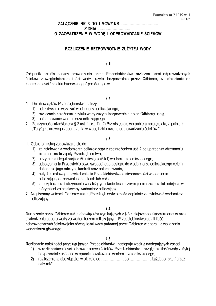 Formularz nr 2.1/ 19 w. 1 str.1/2 ZAŁĄCZNIK NR 3 DO UMOWY NR ………………………….. Z DNIA ………………………. O ZAOPATRZENIE W WODĘ I ODPROWADZANIE ŚCIEKÓW ROZLICZENIE BEZPOWROTNIE ZUŻYTEJ WODY §1 Załącznik określa zasady prowadzenia przez Przedsiębiorstwo rozliczeń ilości odprowadzanych ścieków z uwzględnieniem ilości wody zużytej bezpowrotnie przez Odbiorcę, w odniesieniu do nieruchomości / obiektu budowlanego* położonego w ………....……….…………………………………….. ………………………………………………………………………………………………………………………… §2 1. Do obowiązków Przedsiębiorstwa należy: 1) odczytywanie wskazań wodomierza odliczającego, 2) rozliczanie należności z tytułu wody zużytej bezpowrotnie przez Odbiorcę usług, 3) oplombowanie wodomierza odliczającego. 2. Za czynności określone w § 2 ust. 1 pkt. 1) i 2) Przedsiębiorstwo pobiera opłatę stałą, zgodnie z „Taryfą zbiorowego zaopatrzenia w wodę i zbiorowego odprowadzania ścieków.” §3 1. Odbiorca usług zobowiązuje się do: 1) zainstalowania wodomierza odliczającego z zastrzeżeniem ust. 2 po uprzednim otrzymaniu pisemnej na to zgody Przedsiębiorstwa, 2) utrzymania i legalizacji co 60 miesięcy (5 lat) wodomierza odliczającego, 3) udostępnienia Przedsiębiorstwu swobodnego dostępu do wodomierza odliczającego celem dokonania jego odczytu, kontroli oraz oplombowania, 4) natychmiastowego powiadomienia Przedsiębiorstwa o niesprawności wodomierza odliczającego, zerwaniu jego plomb lub osłon, 5) zabezpieczenia i utrzymania w należytym stanie technicznym pomieszczenia lub miejsca, w którym jest zainstalowany wodomierz odliczający. 2. Na pisemny wniosek Odbiorcy usług, Przedsiębiorstwo może odpłatnie zainstalować wodomierz odliczający. §4 Naruszenie przez Odbiorcę usług obowiązków wynikających z § 3 niniejszego załącznika oraz w razie stwierdzenia poboru wody za wodomierzem odliczającym, Przedsiębiorstwo ustali ilość odprowadzonych ścieków jako równą ilości wody pobranej przez Odbiorcę w oparciu o wskazania wodomierza głównego. §5 Rozliczanie należności przysługujących Przedsiębiorstwu następuje według następujących zasad: 1) w rozliczeniach ilości odprowadzanych ścieków Przedsiębiorstwo uwzględnia ilość wody zużytej bezpowrotnie ustaloną w oparciu o wskazania wodomierza odliczającego, 2) rozliczenie to obowiązuje: w okresie od ………………. do ……………… każdego roku / przez cały rok*. Formularz nr 2.1/ 19 w. 1 str.2/2 §6 Załącznik sporządzono w dwóch jednobrzmiących egzemplarzach, po jednym dla każdej ze stron. §7 Niniejszy załącznik stanowi integralną część umowy o zaopatrzeniu w wodę i odprowadzania ścieków. ........................................................................ Przedsiębiorstwo * niepotrzebne skreślić ................................................................... Odbiorca